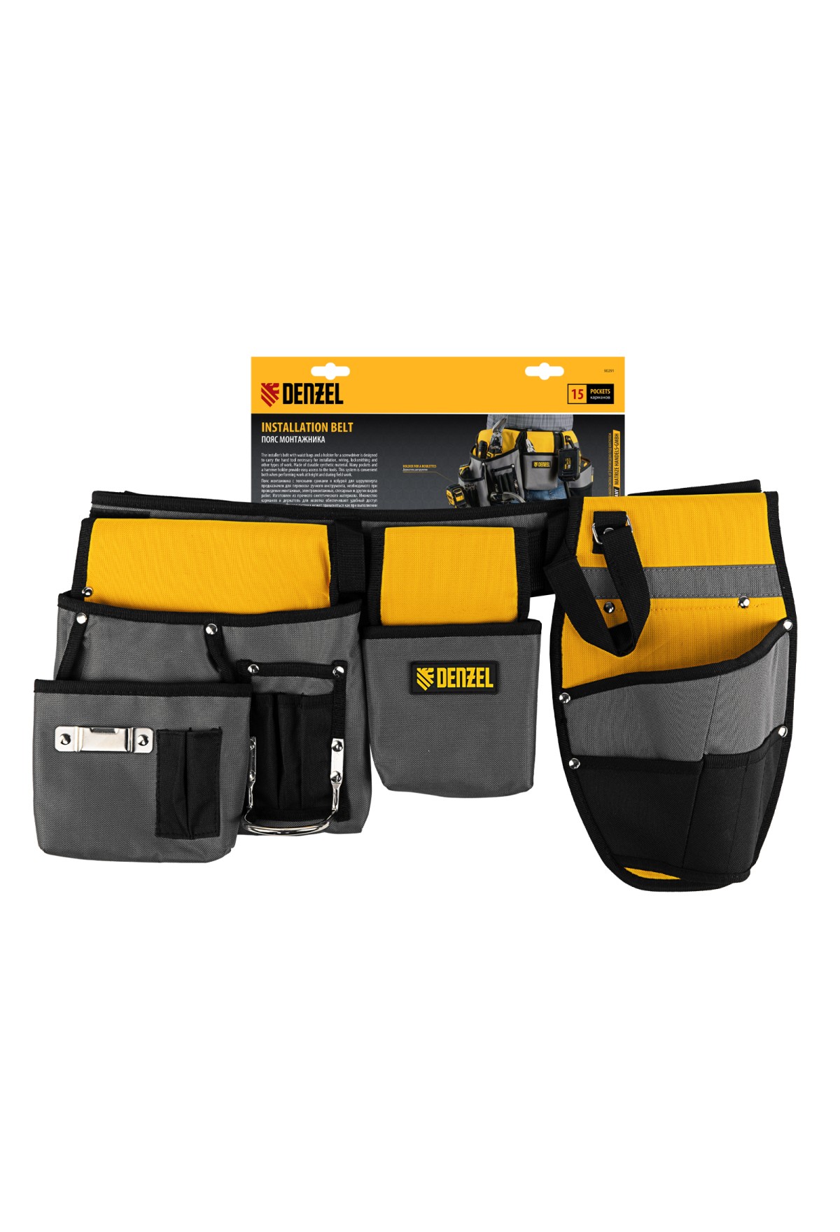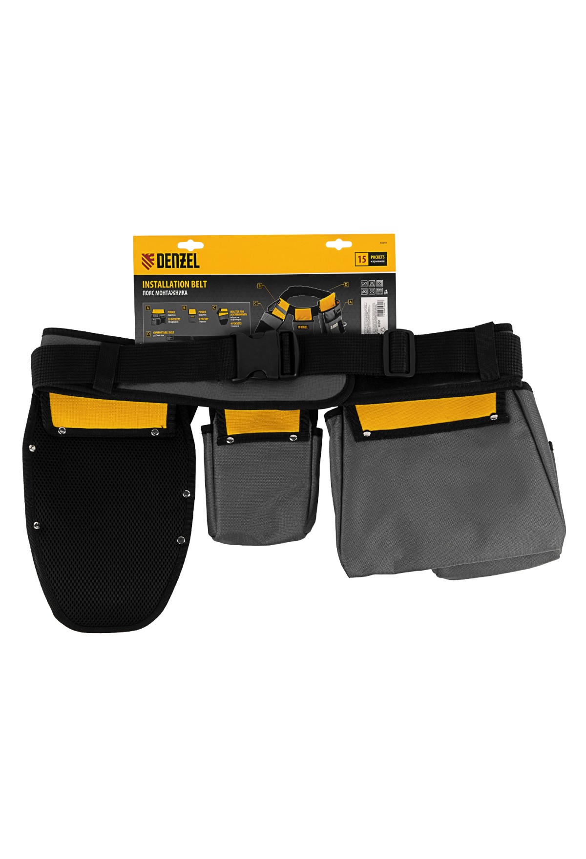 Пояс монтажника Denzel 90291 с поясными сумками и кобурой для шуруповерта позволяет иметь все необходимые инструменты под рукой во время высотных монтажных работ или решения других задач. В 14 карманах и дополнительном подсумке можно разместить инструменты, крепеж и расходники. Для шуруповерта предусмотрена специальная кобура со страховочной петлей.