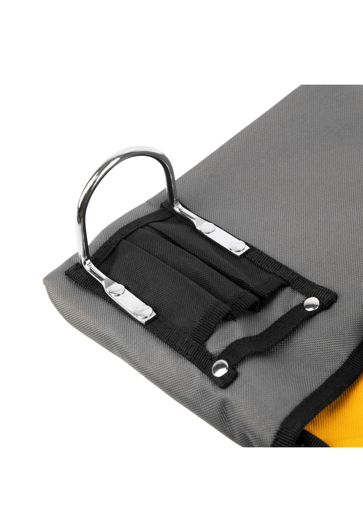 - Дополнительные возможности — на поясе предусмотрен держатель для молотка на стальных заклепках и крепление для рулетки.