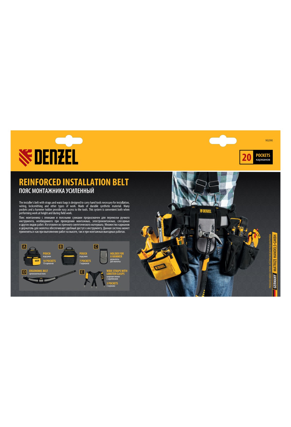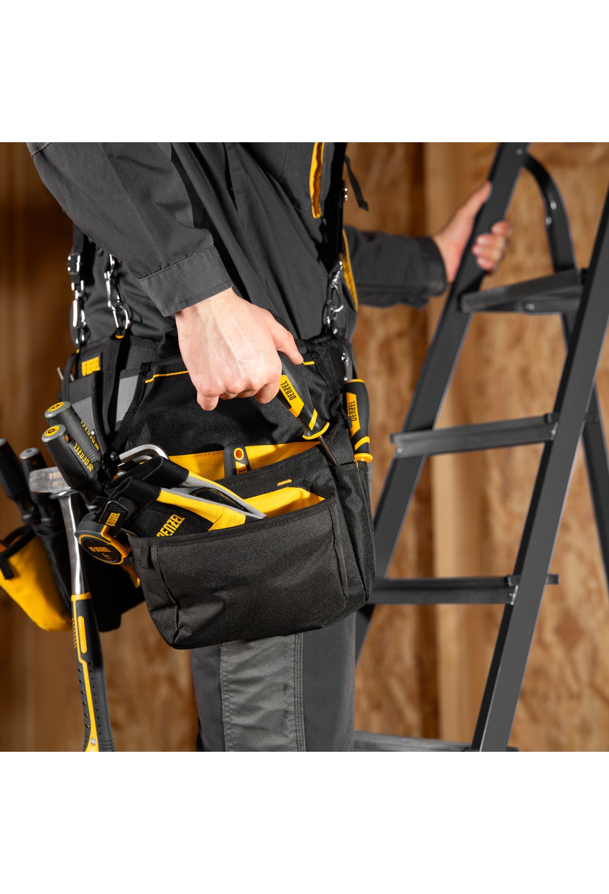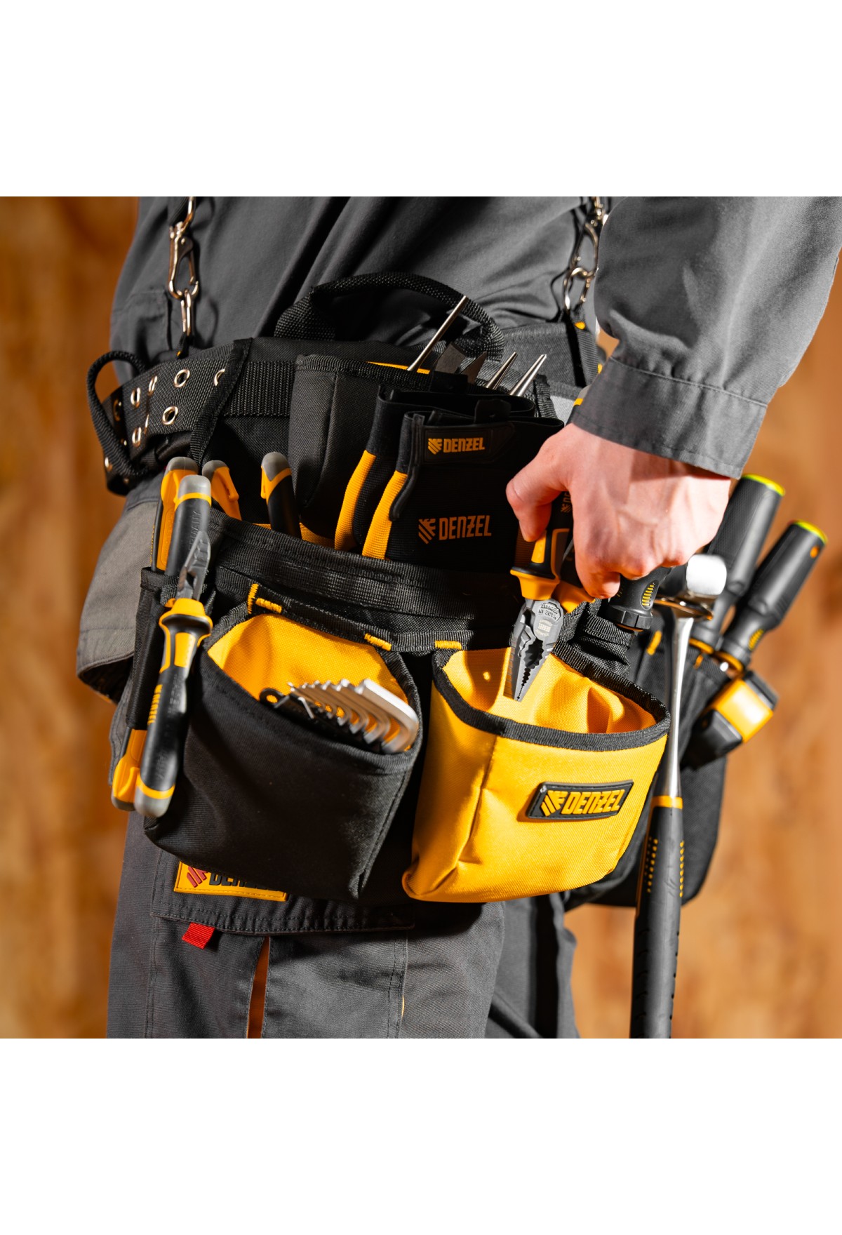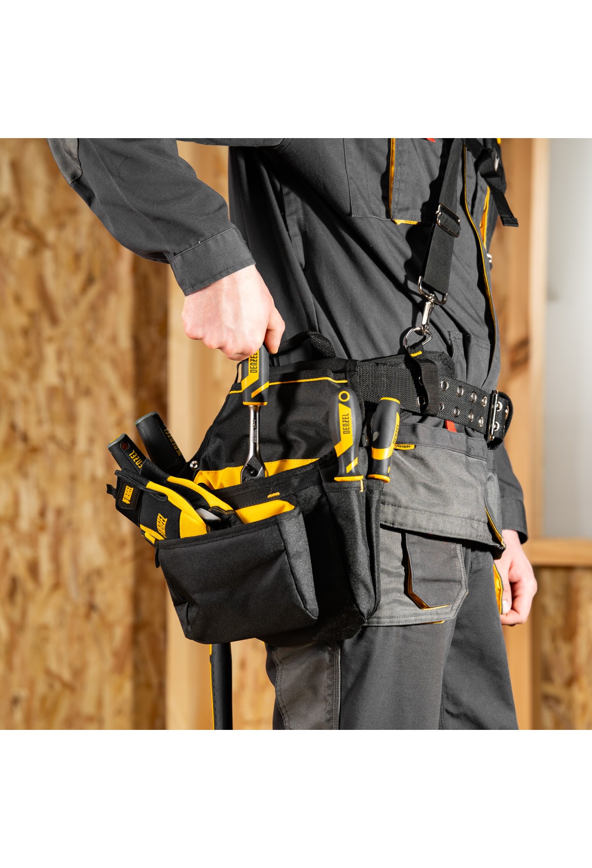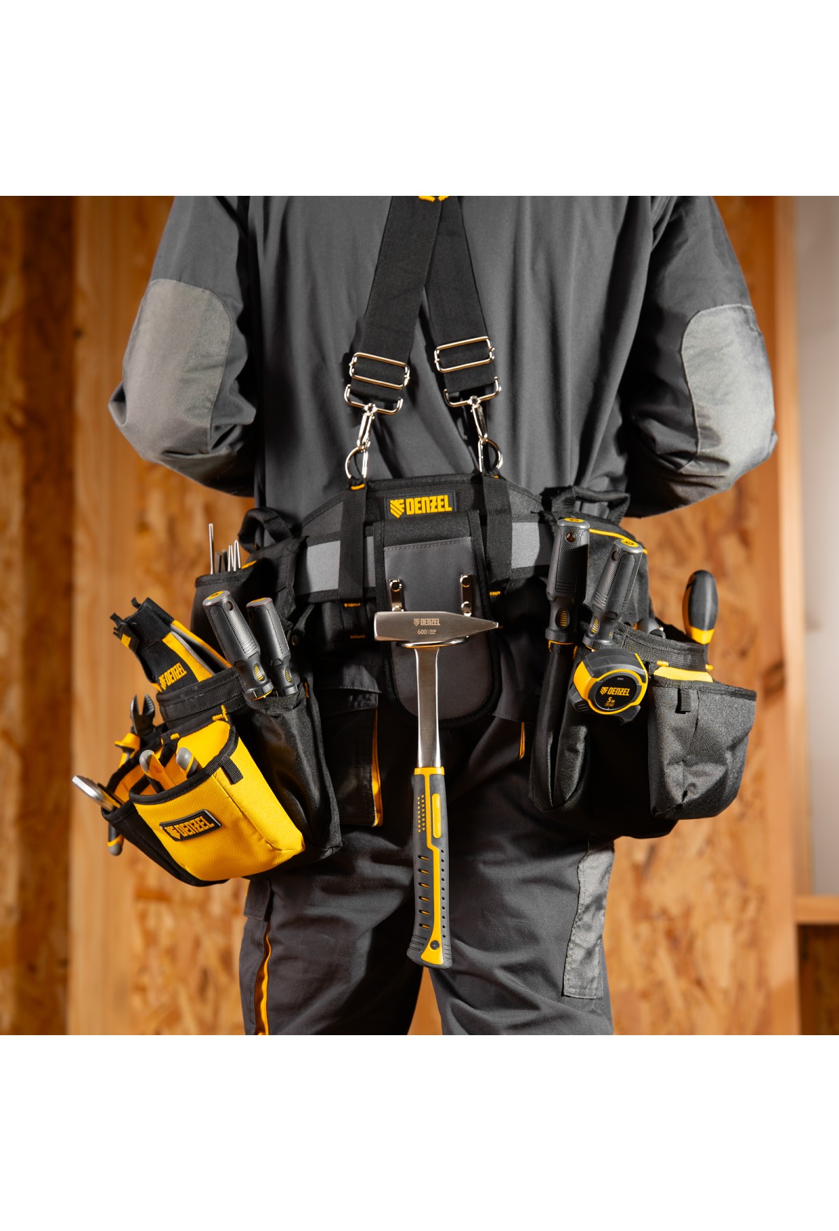 Пояс монтажника усиленный, с лямками, сумки поясные, держатель для молотка// Denzel