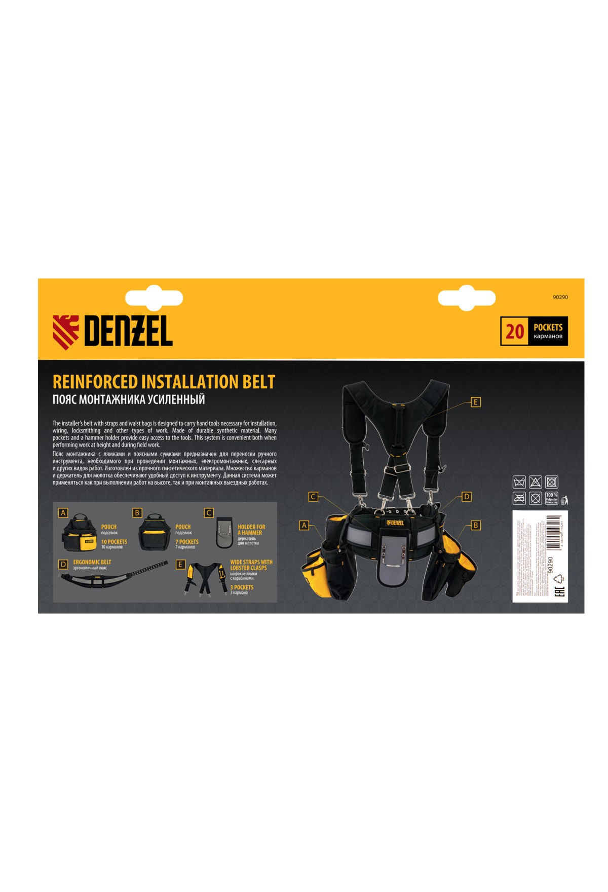 Технические характеристики Пояс монтажника усиленный, с лямками, сумки поясные, держатель для молотка// Denzel