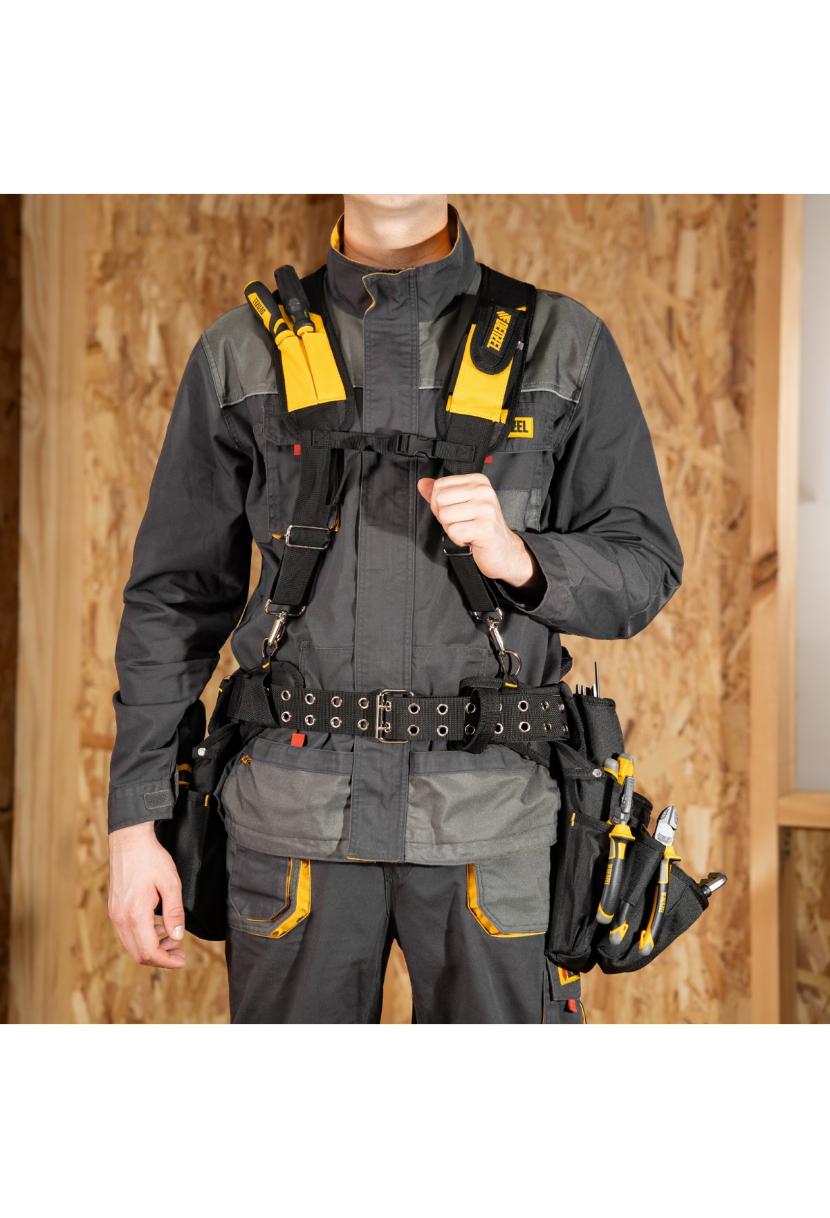 - Эргономичность — регулируемые широкие лямки равномерно распределяют вес инструментов, уменьшая нагрузку на спину.