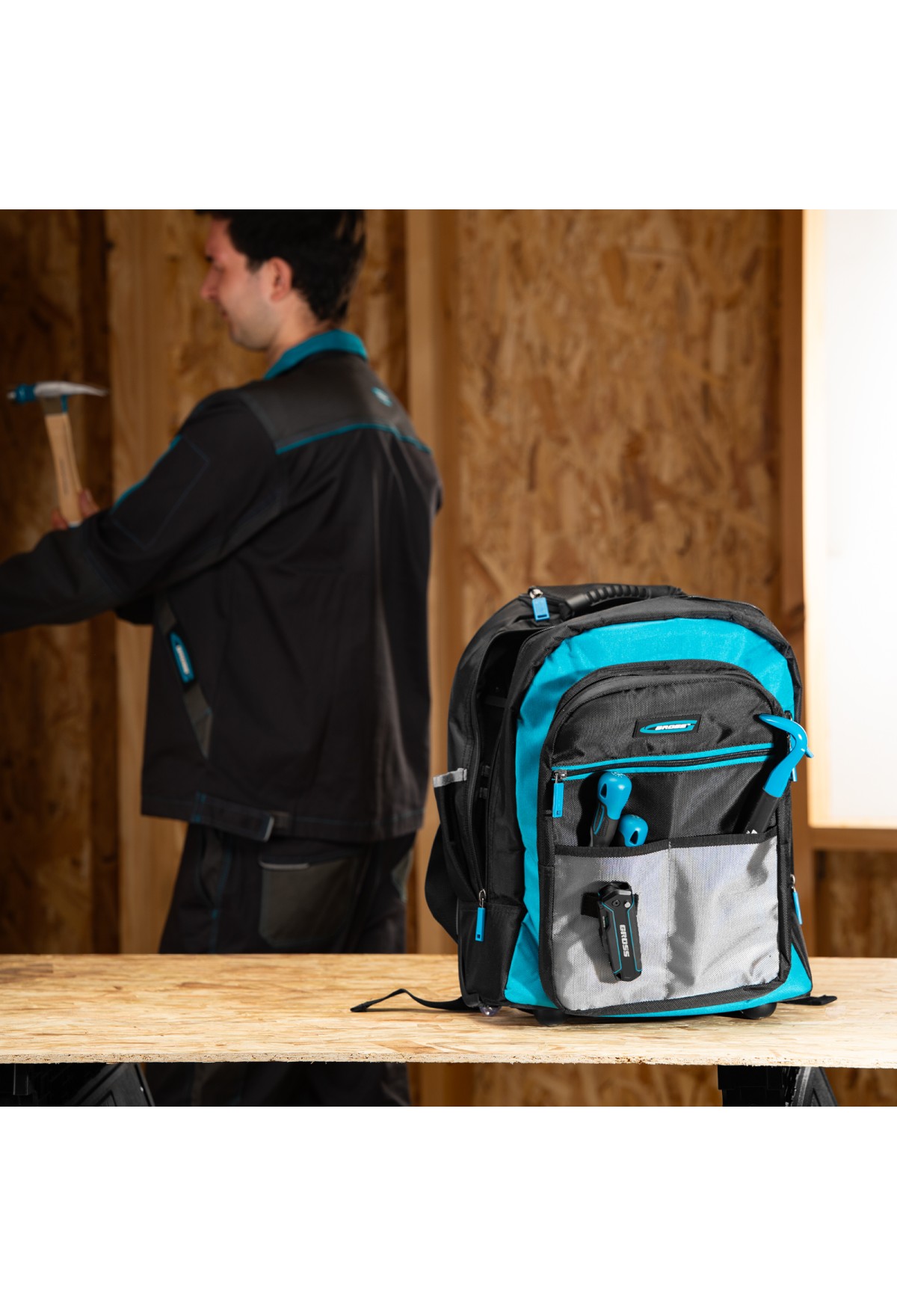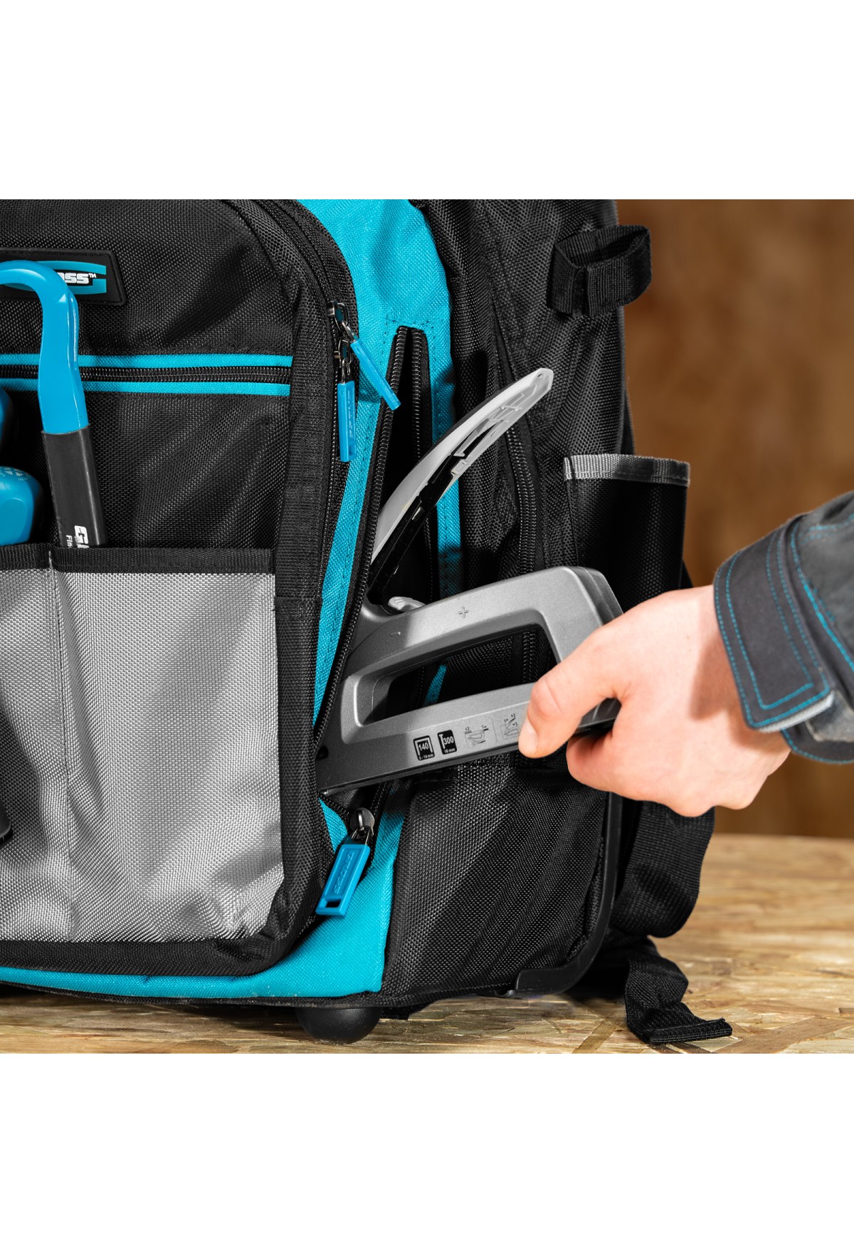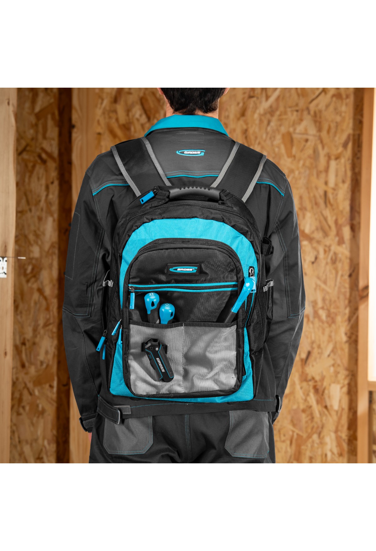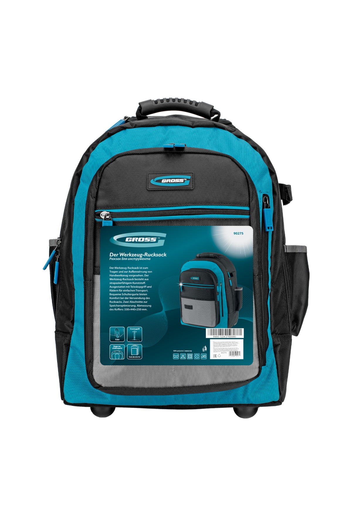 Рюкзак Gross 90275 размером 440 х 350 х 250 мм, с выдвижной рукояткой и колесами, используется для хранения и транспортировки ручного инструмента. В двух секциях с 16 внутренними и внешними карманами можно разместить все необходимые предметы. Рюкзак удобно брать в поездки и на выездные работы.