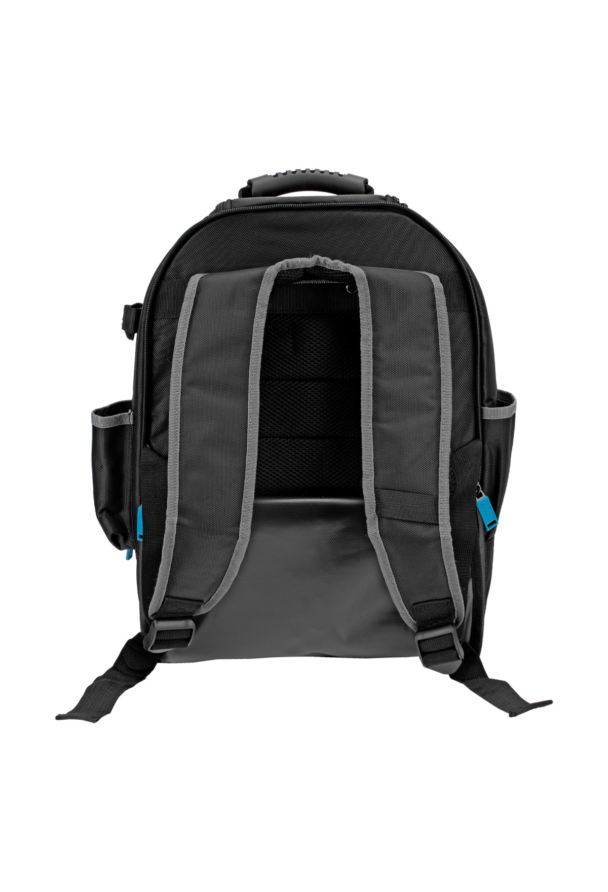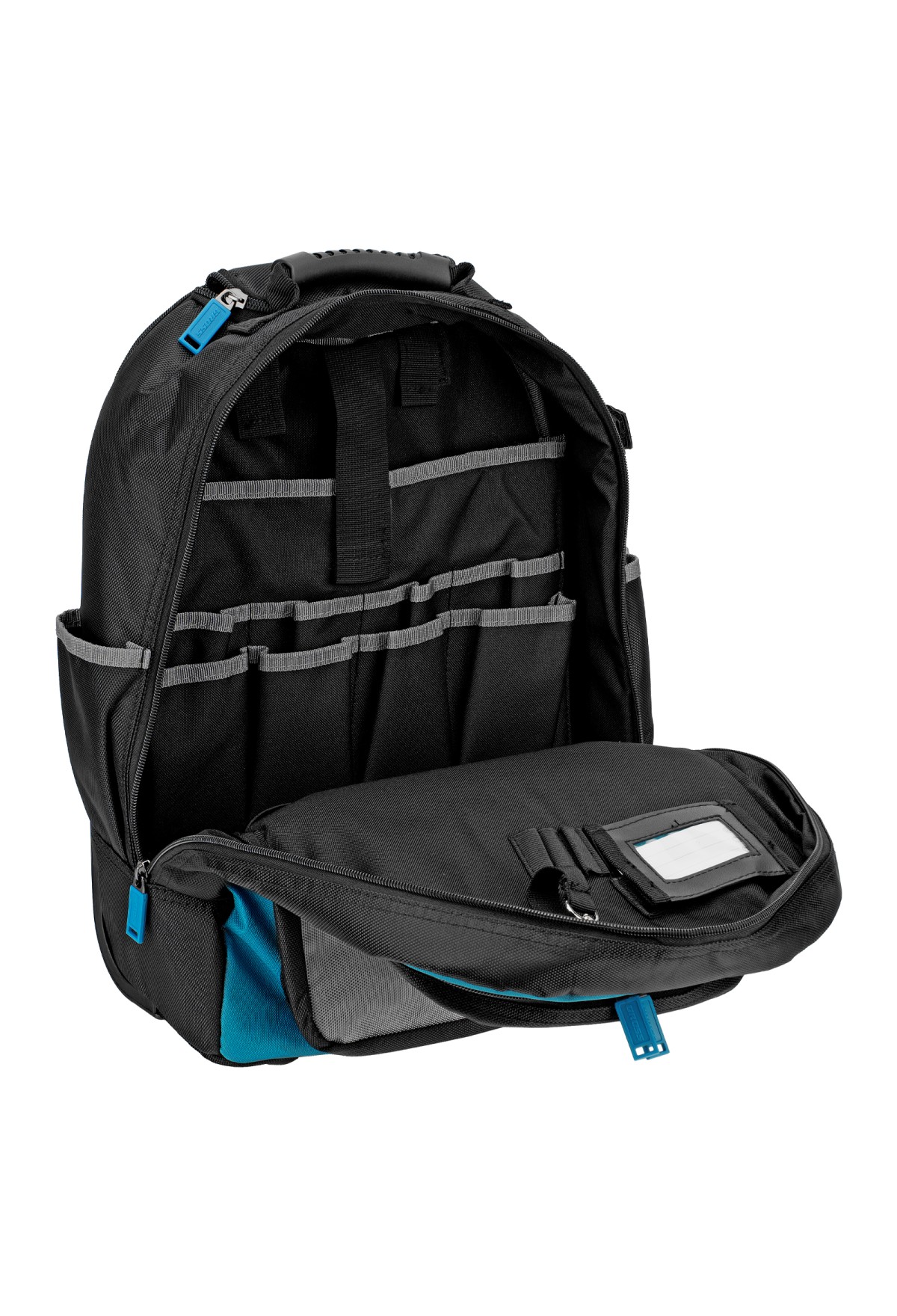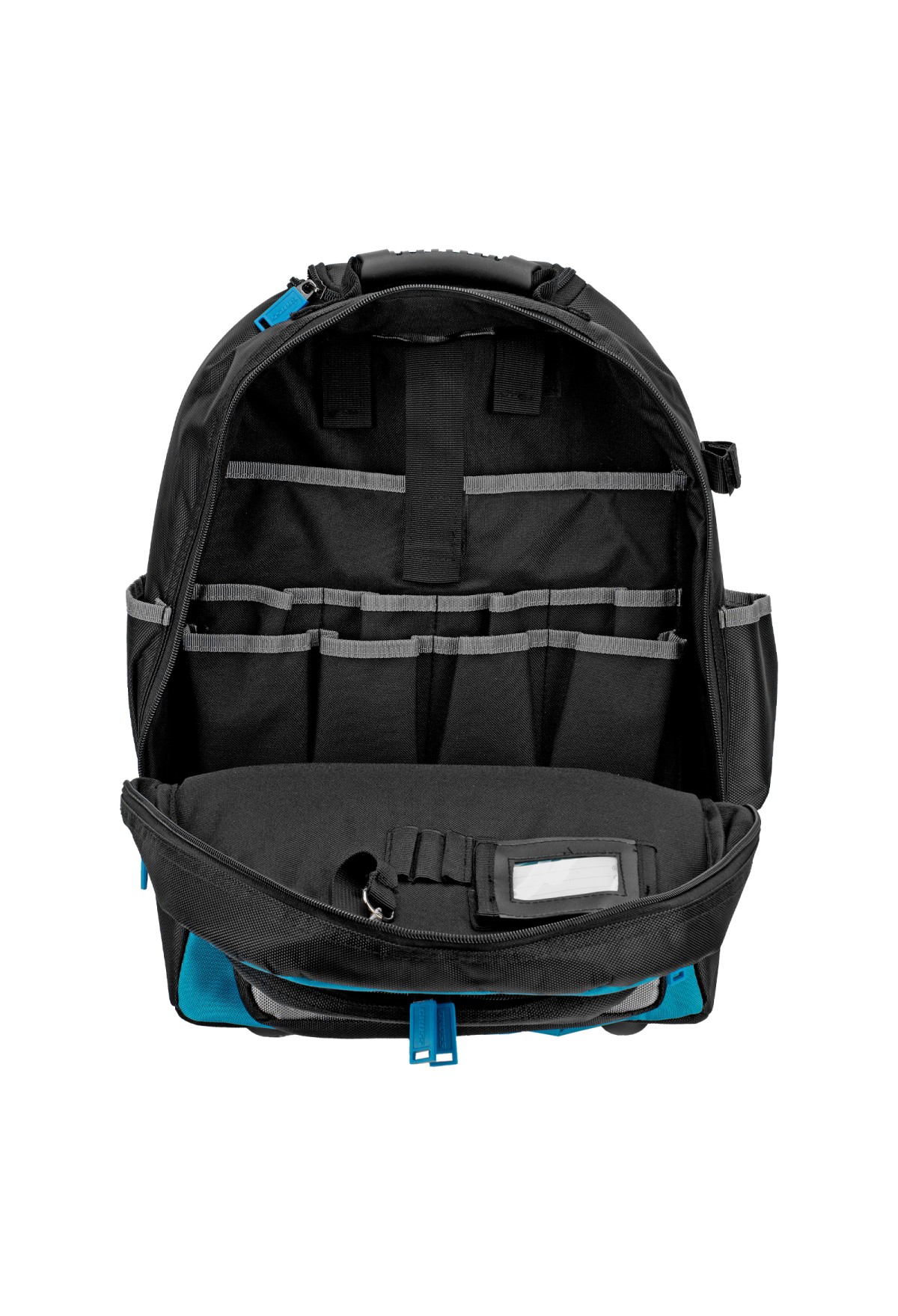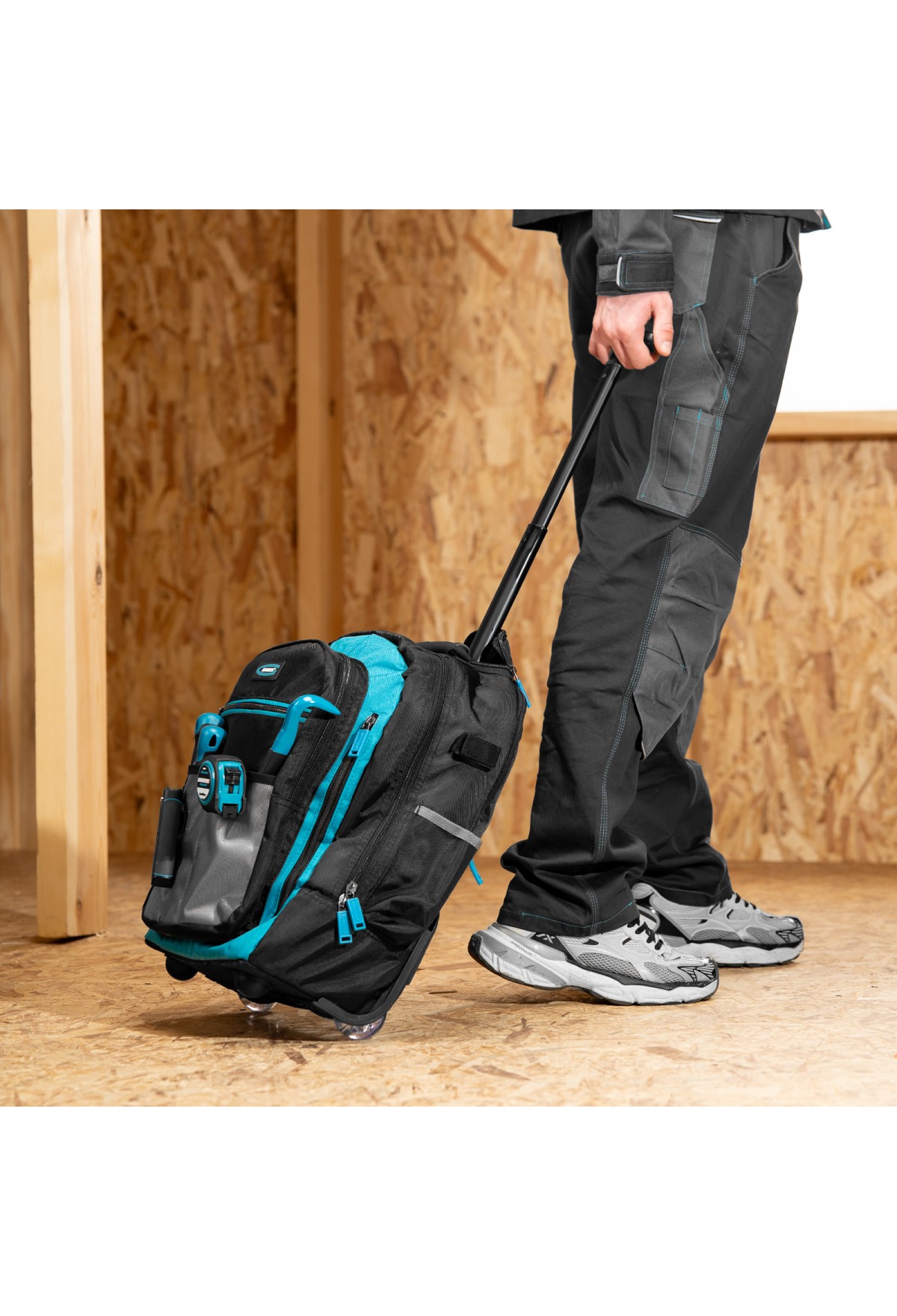 Рюкзак Gross 90275 размером 440 х 350 х 250 мм, с выдвижной рукояткой и колесами, используется для хранения и транспортировки ручного инструмента. В двух секциях с 16 внутренними и внешними карманами можно разместить все необходимые предметы. Рюкзак удобно брать в поездки и на выездные работы.