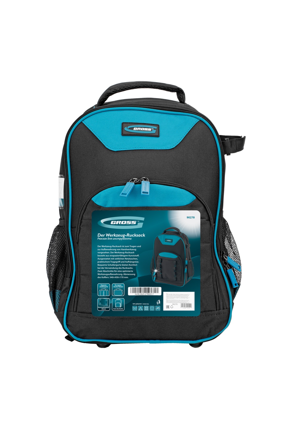 Рюкзак Gross 90278 габаритами 450 х 340 х 170 мм, с 13 карманами, предназначен для транспортировки ручного и электроинструмента. Изготовлен из высокопрочного синтетического полиэстера плотностью 600 D. Оптимален для использования на выездных работах.