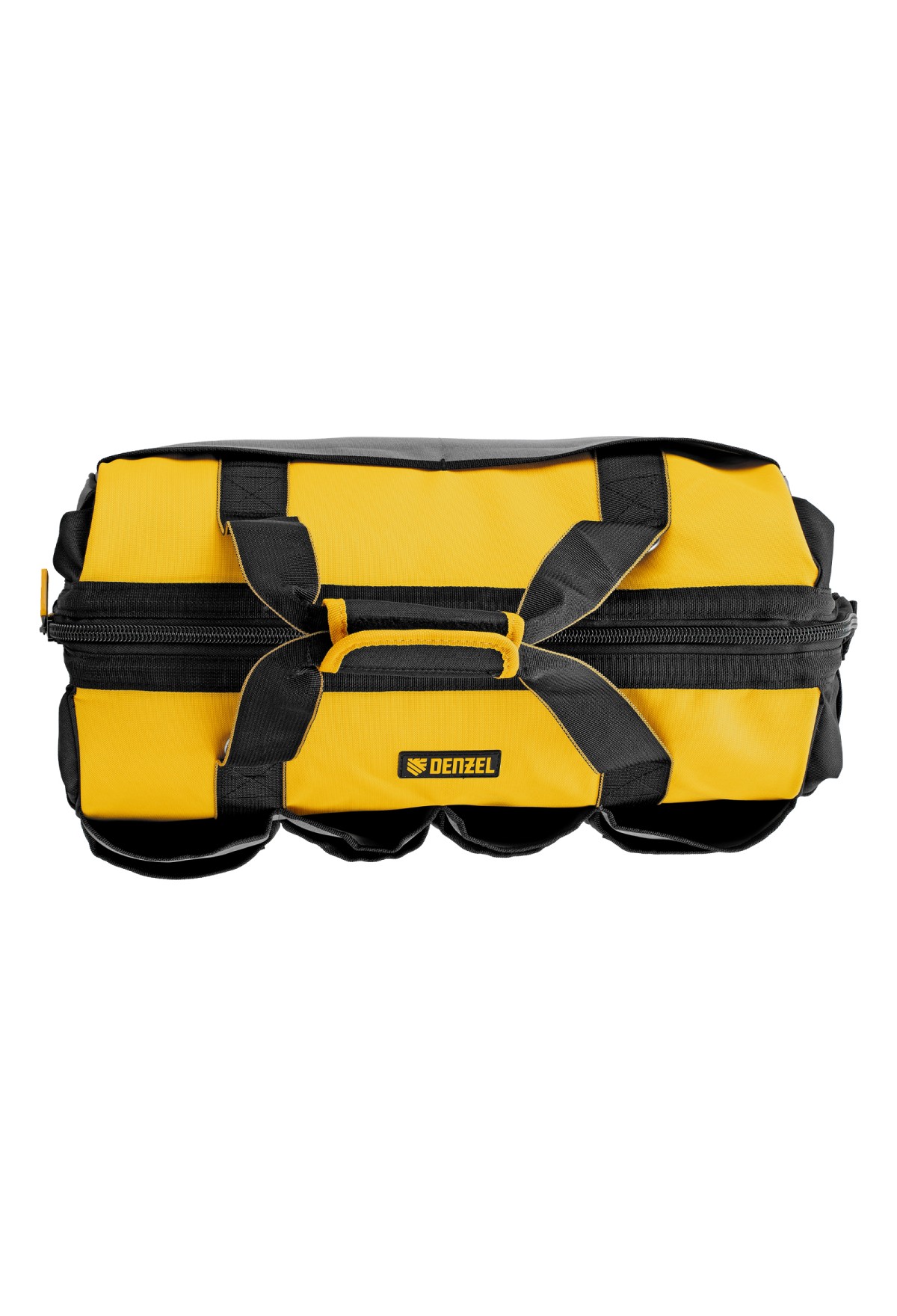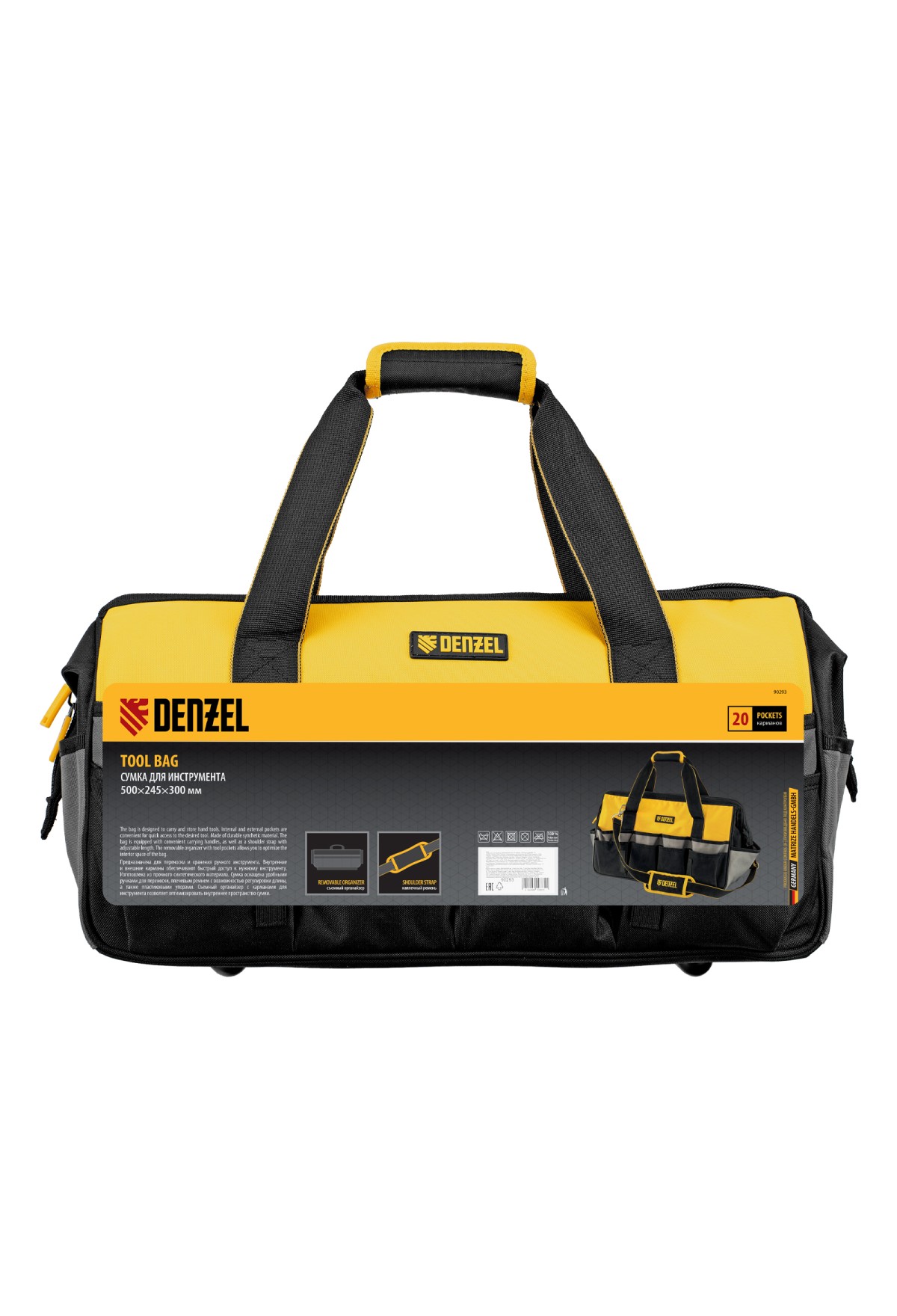 Сумка Denzel 90293 габаритами 500 х 245 х 300 мм с 20 карманами (в том числе съемным органайзером на 10 карманов) и наплечным ремнем, вмещает большое количество инструментов и используется для их хранения и транспортировки. Пригодится монтажнику, сантехнику, мастеру на выезде и автовладельцу.