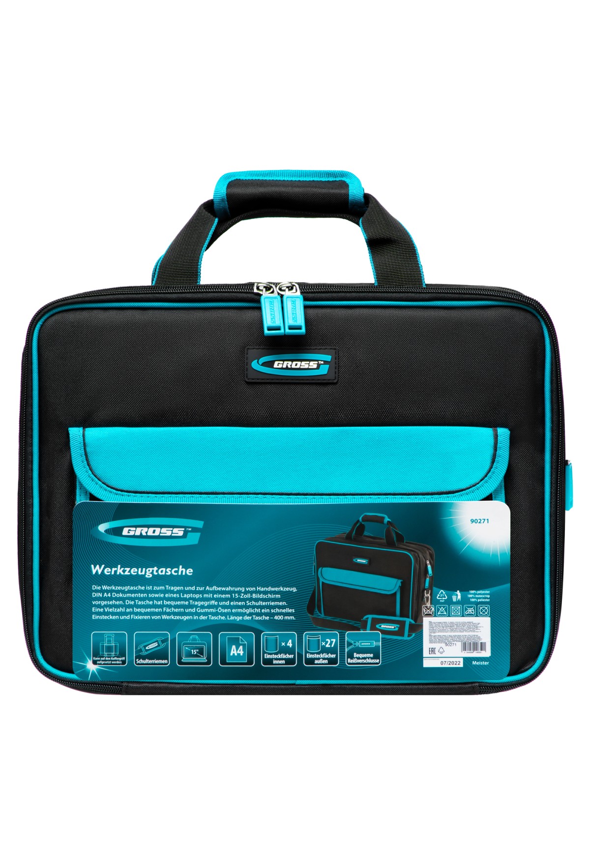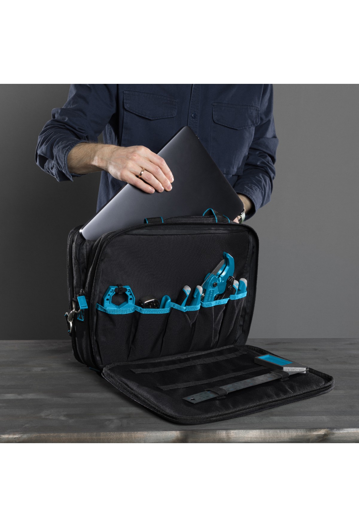 Сумка Gross Meister 90271, 400 х 170 х 300 мм, 31 карман, с отсеком для ноутбука и наплечным ремнем, удобна для переноски и хранения ручных инструментов. Подойдет мастерам по ремонту техники, слесарям, электрикам. Сумку можно брать в офис — в ней помещается ноутбук диагональю до 15 дюймов и бумаги формата А4. В сумке 31 карман и удобные фиксирующие резинки, поэтому каждый инструмент в ней всегда на своем месте.