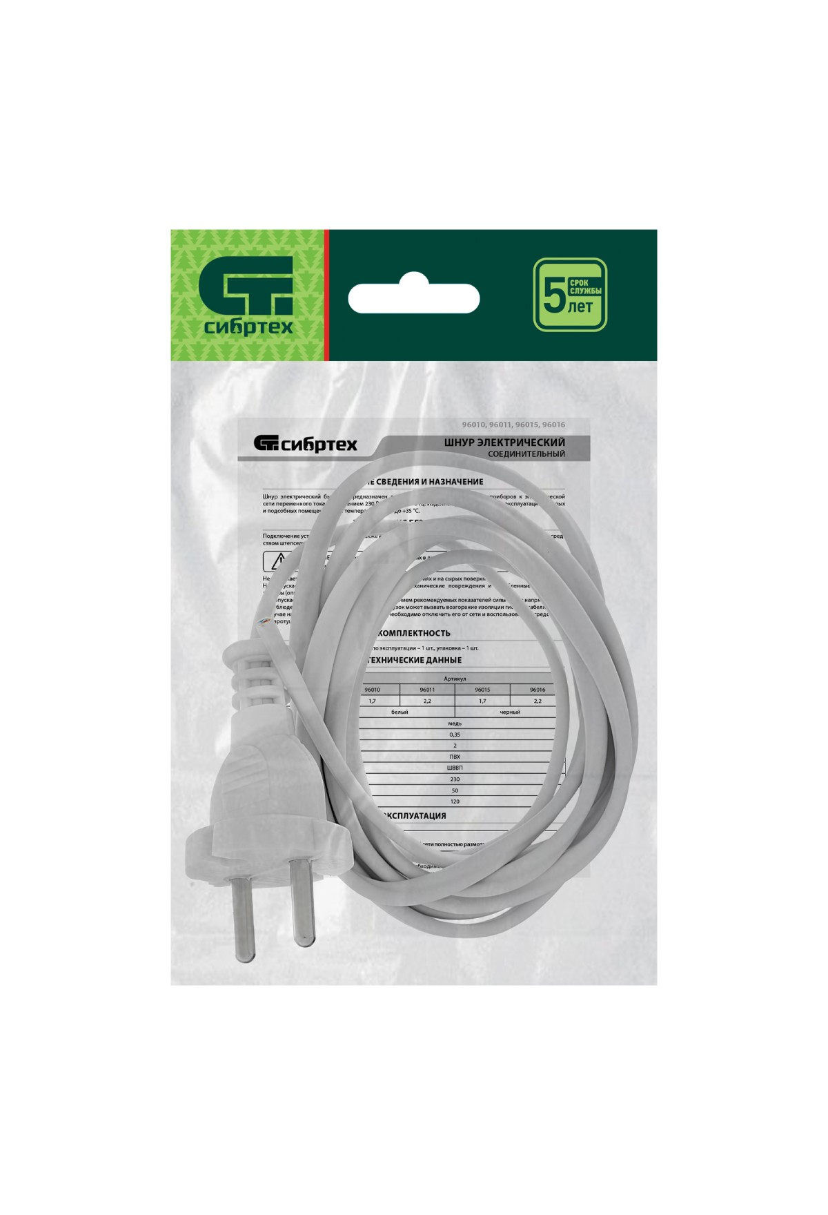 Технические характеристики Шнур электрический соединительный, для настольной лампы, 1.7 м, 120 Вт, белый, тип V-1 Россия Сибртех