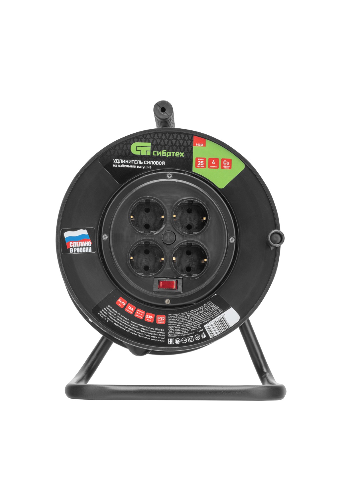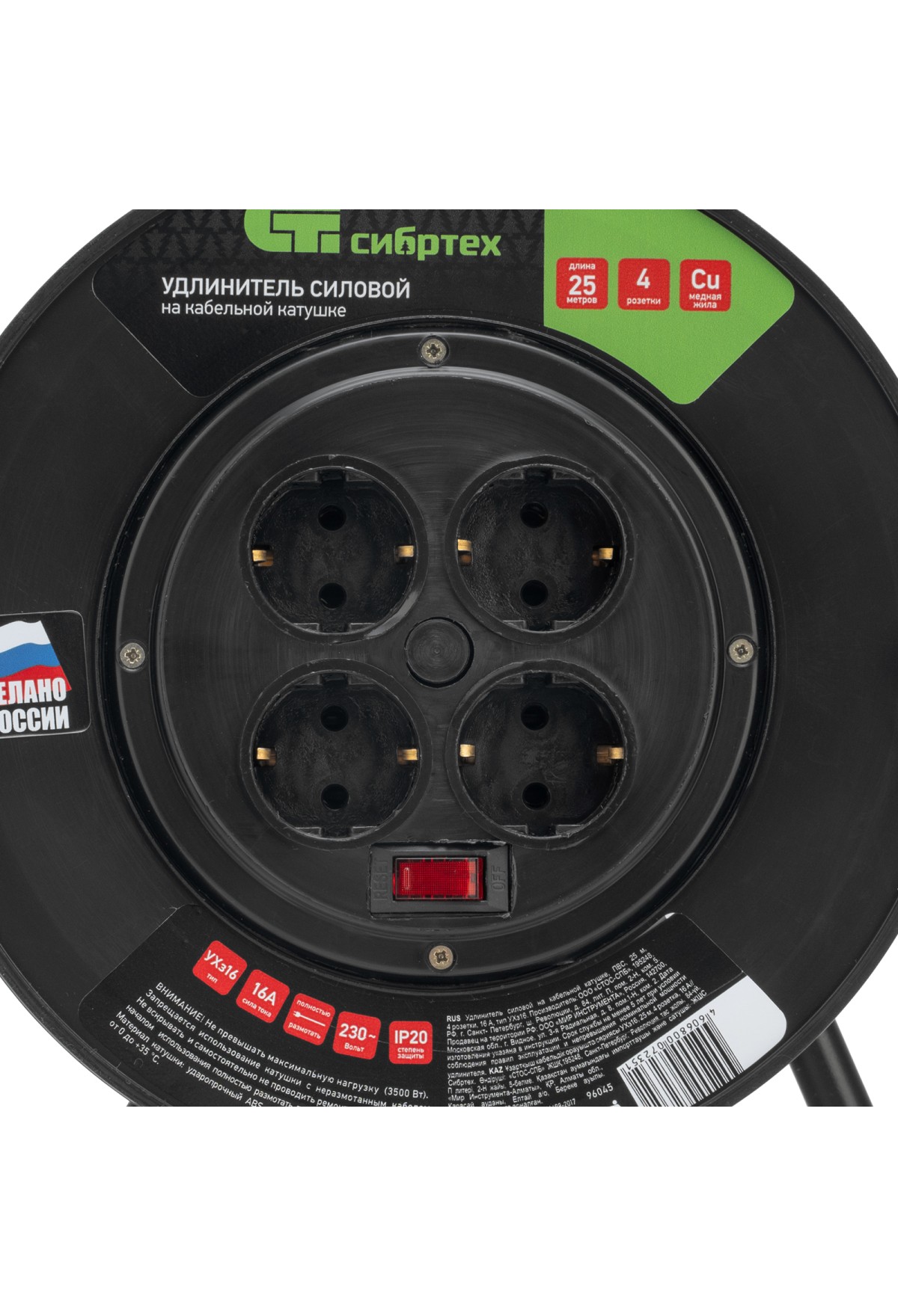 Технические характеристики Удлинитель силовой 25 м, 16А, тип УХз16, ПВС, на кабельной катушке, 4 розетки, Россия Сибртех
