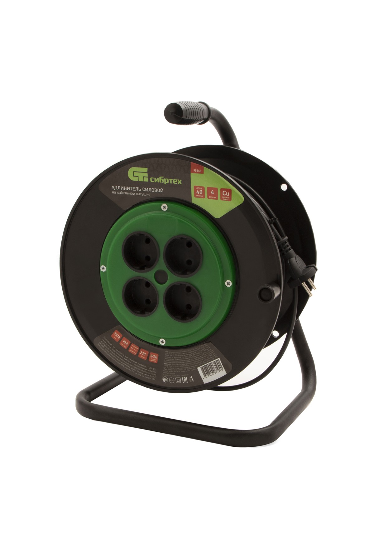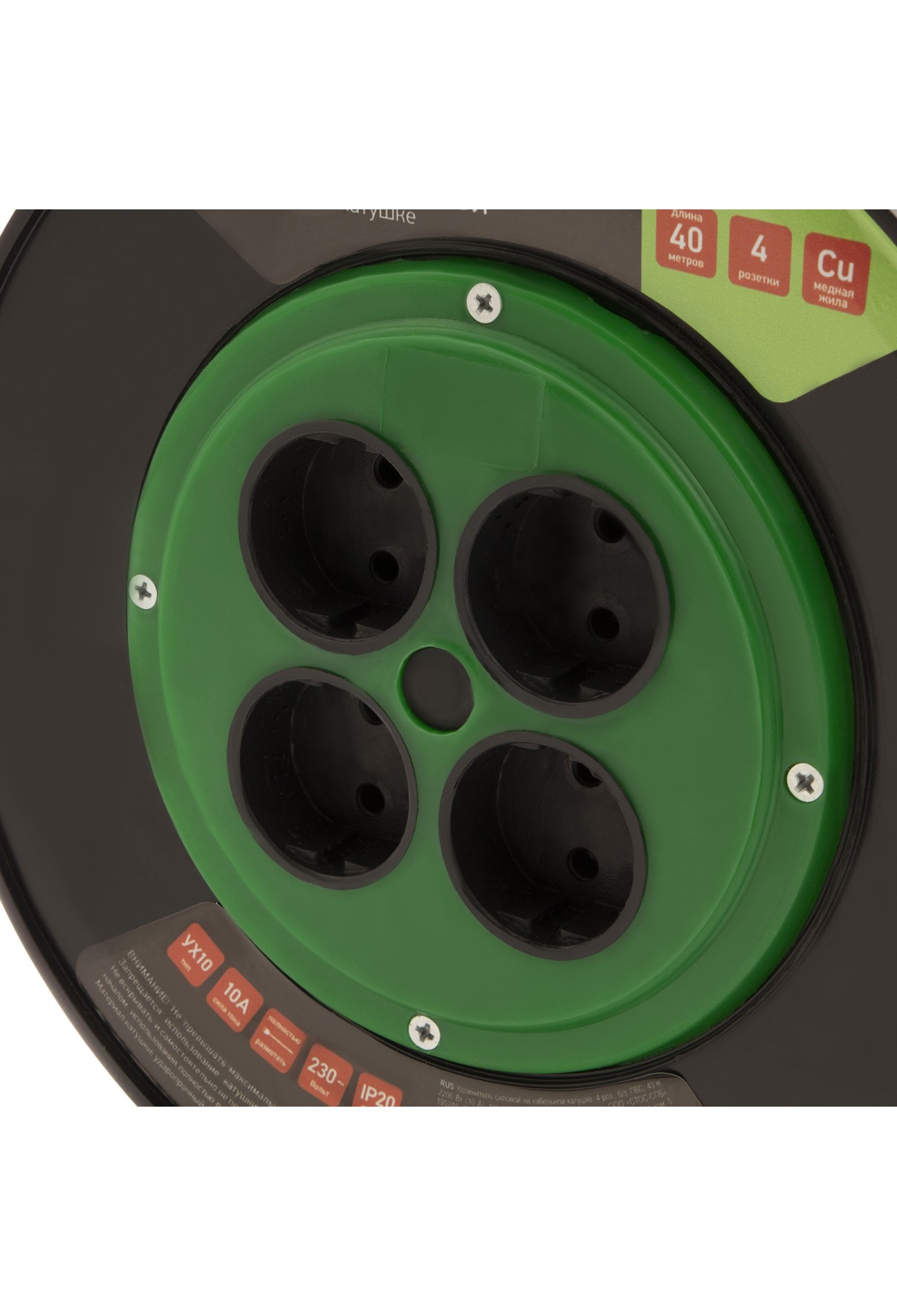 Технические характеристики Удлинитель силовой 40 м, 10А, тип УХ10, ПВС, на кабельной катушке, 4 розетки без заземления Сибртех