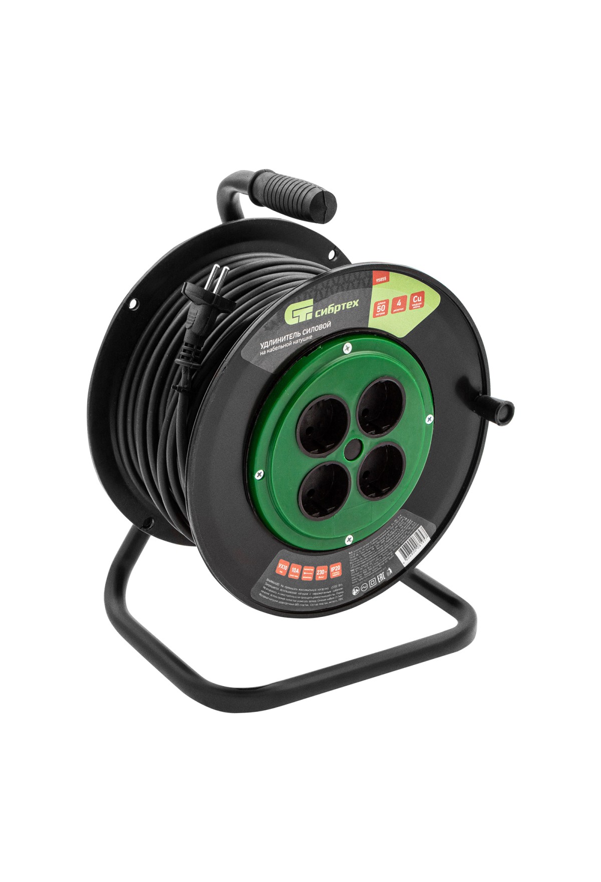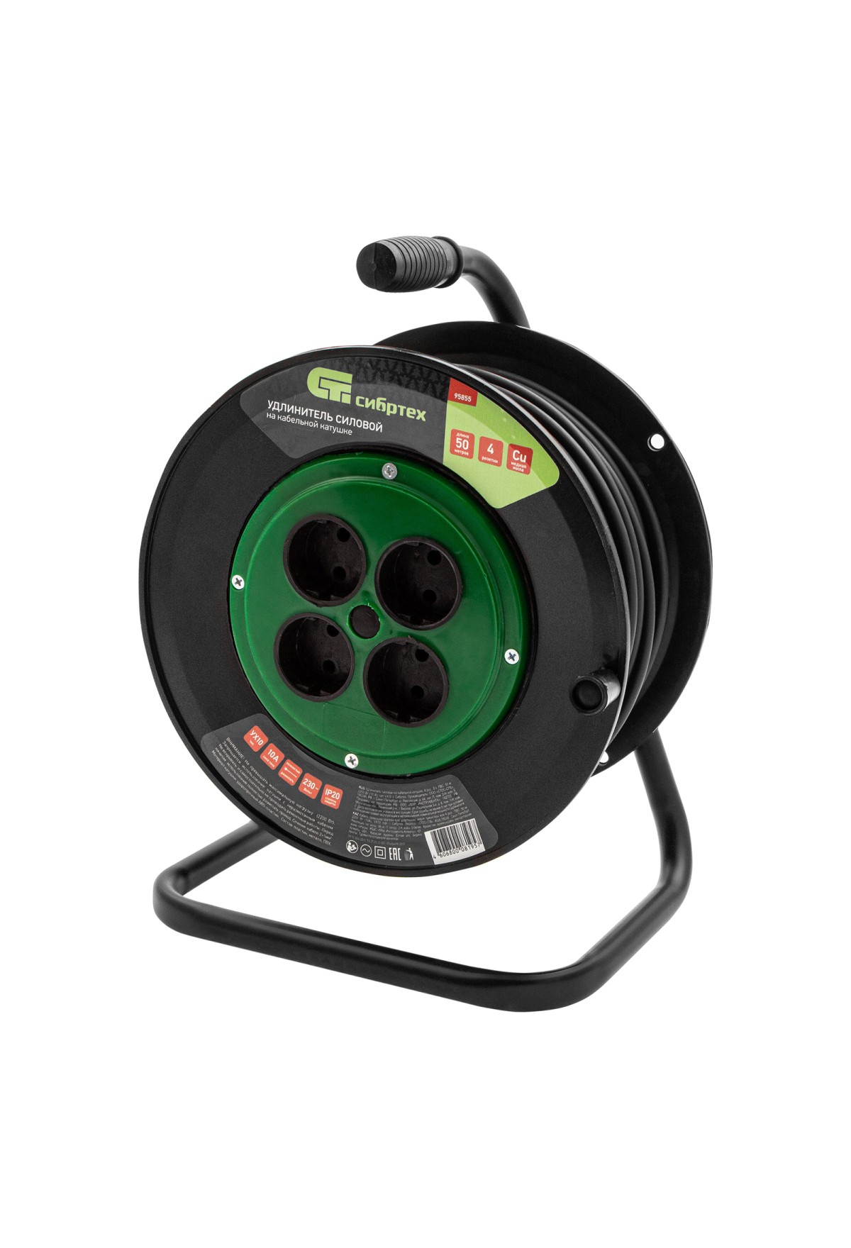 Технические характеристики Удлинитель силовой 50 м, 10А, тип УХ10, ПВС, на кабельной катушке, 4 розетки без заземления Сибртех