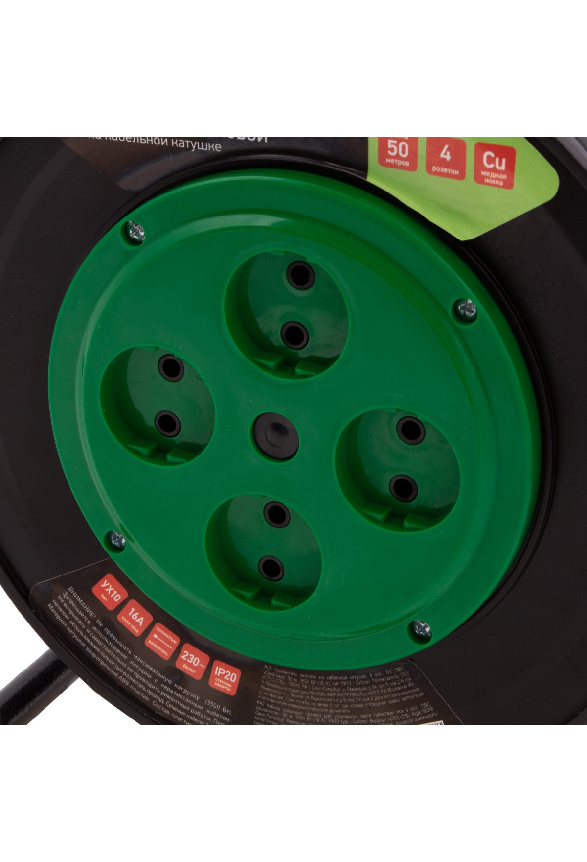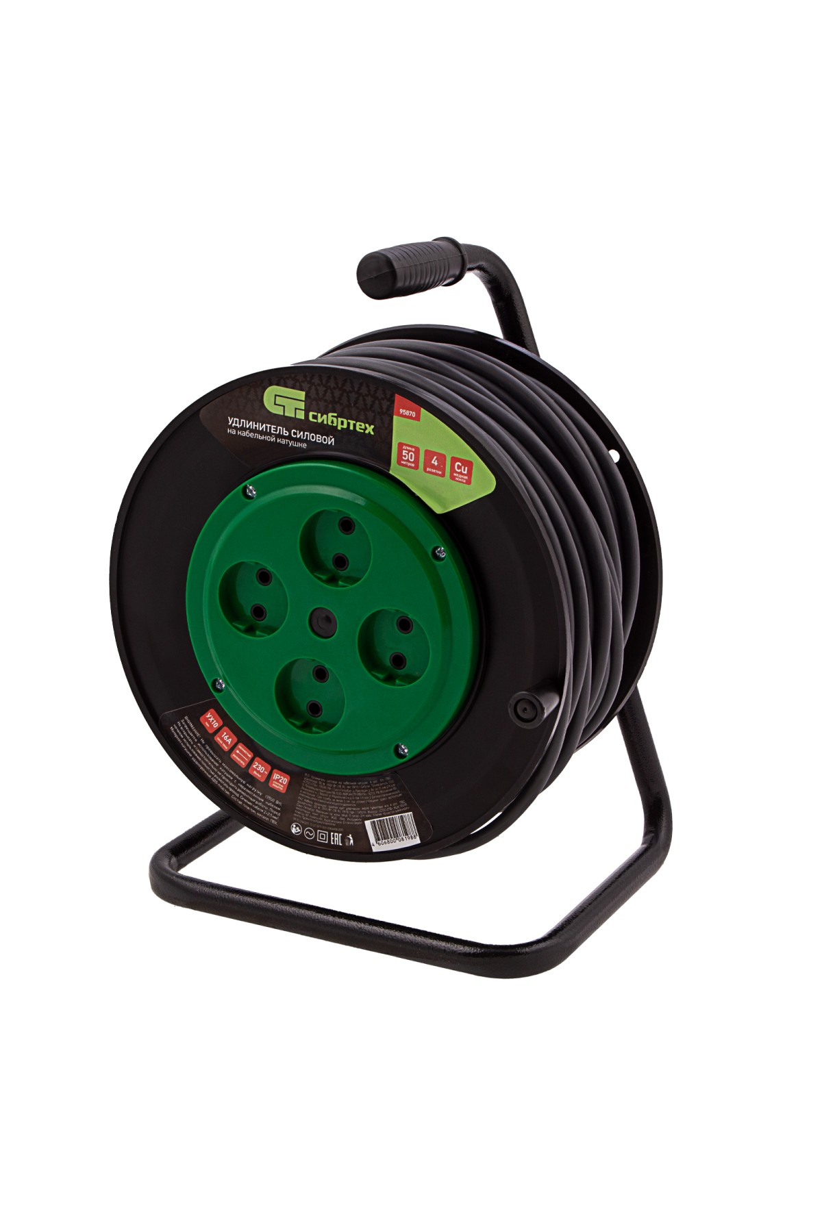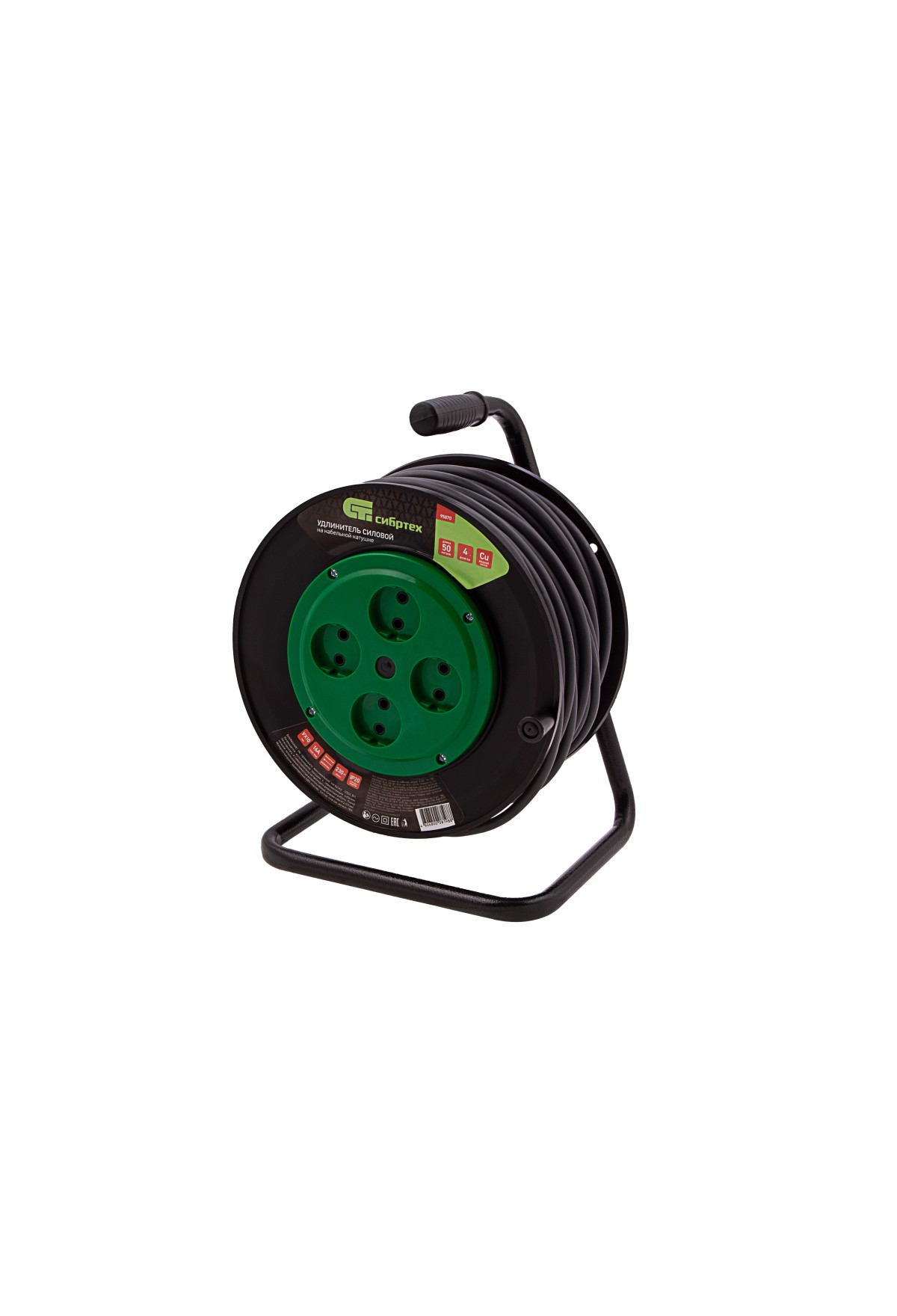 Усиленный силовой удлинитель на кабельной катушке Сибртех 95870, 16 А, тип УХ10, тип кабеля ПВС, с 4 розетками без заземления, позволяет подключать к сети электрооборудование на расстоянии до 50 м от стационарного источника питания. Медный кабель с сечением 2 х 2,5 кв. мм выдерживает нагрузку до 3500 Вт. Корпус выполнен из пластика, а металлическая стойка полая внутри, уменьшен вес сетевого удлинителя и его удобно переносить. Устройство предназначено для выполнения бытовых и профессиональных строительных работ, пригодится также на даче и в автомастерской.