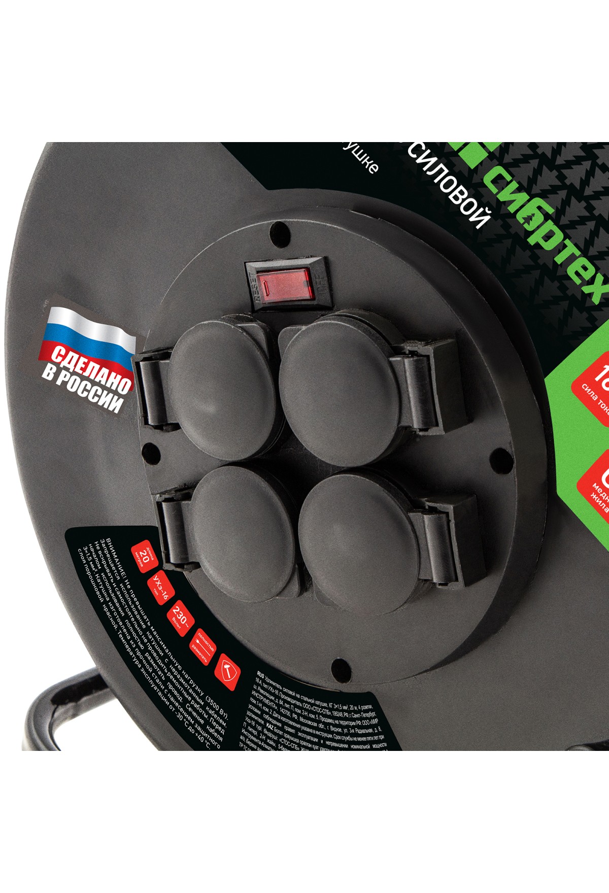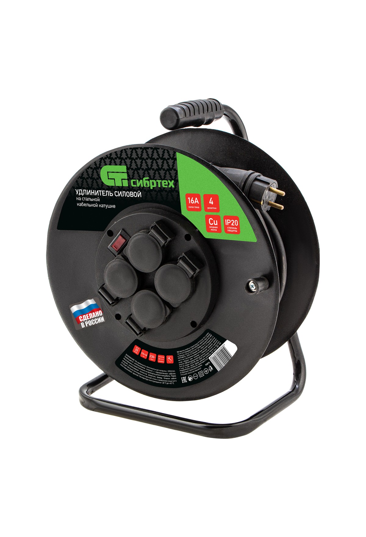 Силовой удлинитель на стальной катушке Сибртех 95875 типа УХз16, с кабелем КГ 3 х 1,5 мм и 4 розетками, рассчитан на силу тока 16 А и позволяет использовать электрооборудование суммарной мощностью до 350 Вт на расстоянии до 20 м от источника электроснабжения. Стальной корпус катушки выдерживает интенсивное использование. Изделие предназначено для выполнения профессиональных работ в строительстве и на производстве.