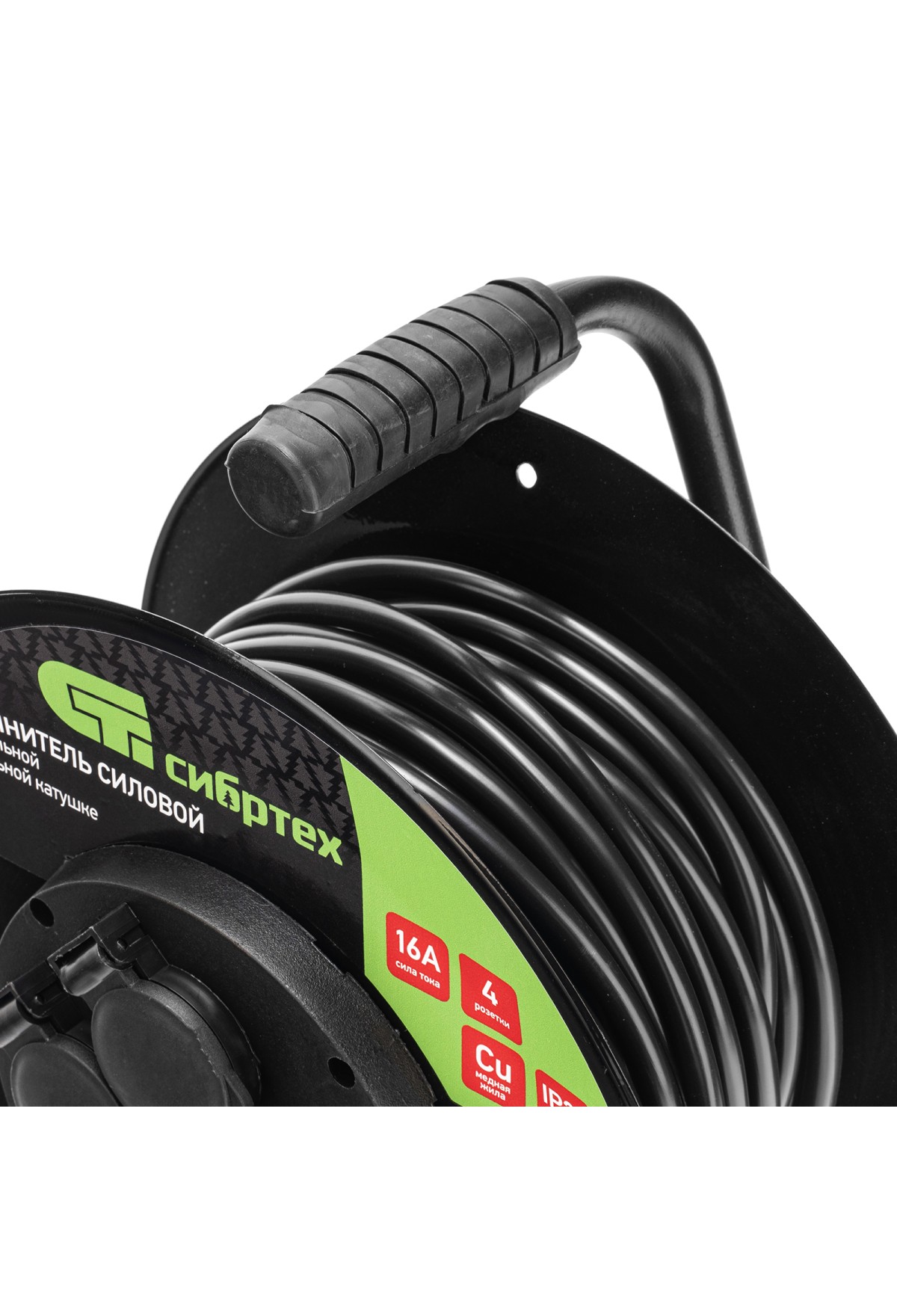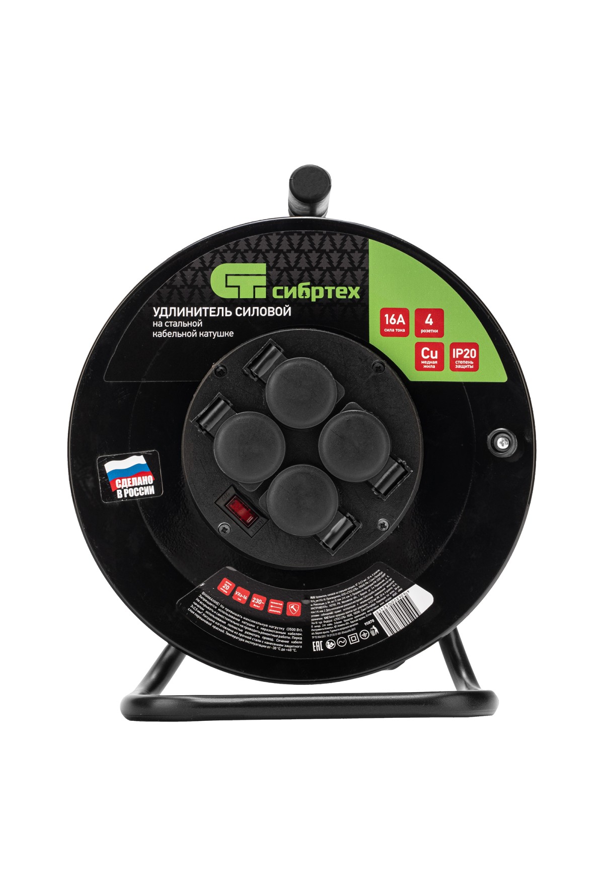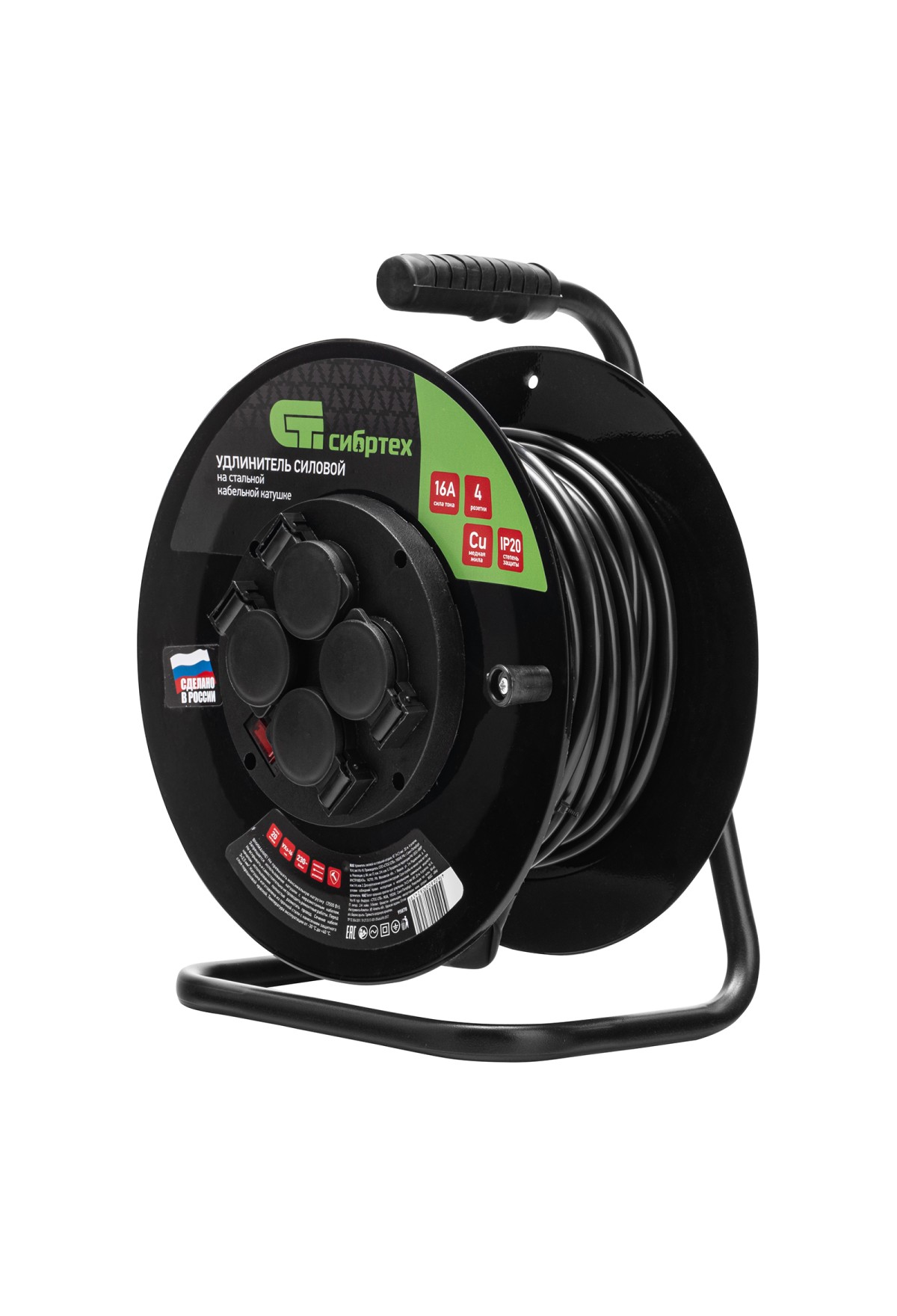 Силовой удлинитель на стальной катушке Сибртех 95878, 16 А, тип УХз-16, кабель КГ 3 х 2,5 мм, с 4 розетками, позволяет использовать электрооборудование на расстоянии до 20 м от источника электроснабжения. Выдерживает нагрузку до 3500 Вт. Стальной корпус катушки рассчитан на интенсивное использование. Розеточная группа выполнена из пластика, что позволило уменьшить вес сетевого удлинителя. Изделие предназначено для профессиональных работ в строительстве и на производстве.