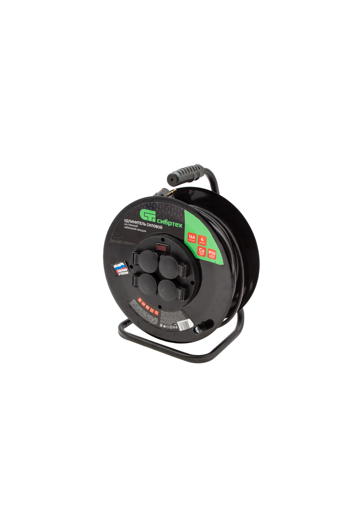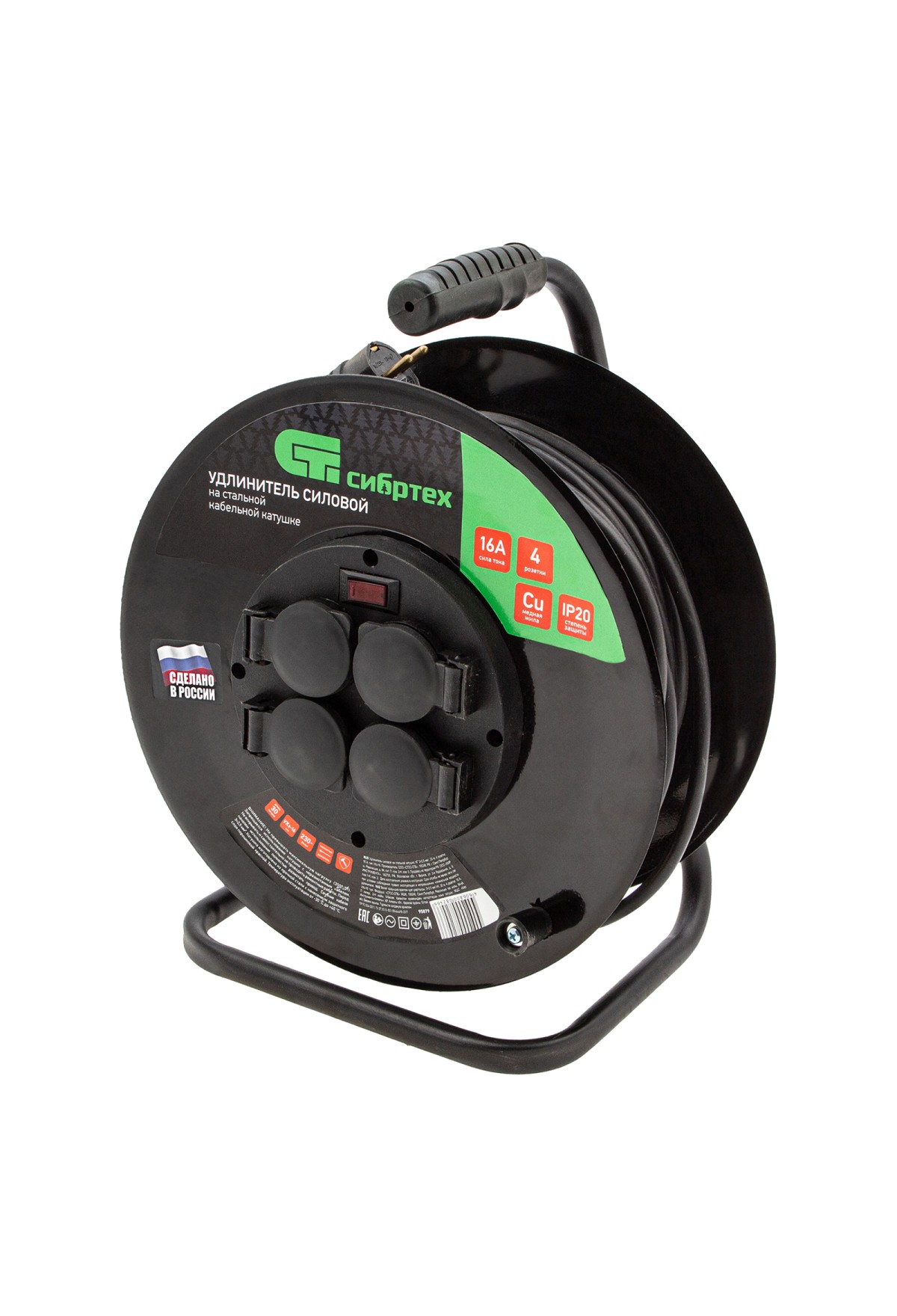 Силовой удлинитель на стальной катушке Сибртех 95879, 16 А, тип УХз-16, кабель КГ 3 х 2,5 мм, с 4 розетками, позволяет использовать электрооборудование на расстоянии до 30 м от источника электроснабжения. Выдерживает нагрузку до 3500 Вт. Стальной корпус катушки рассчитан на интенсивное использование. Розеточная группа выполнена из пластика, что позволило уменьшить вес сетевого удлинителя. Изделие предназначено для профессиональных работ в строительстве и на производстве.