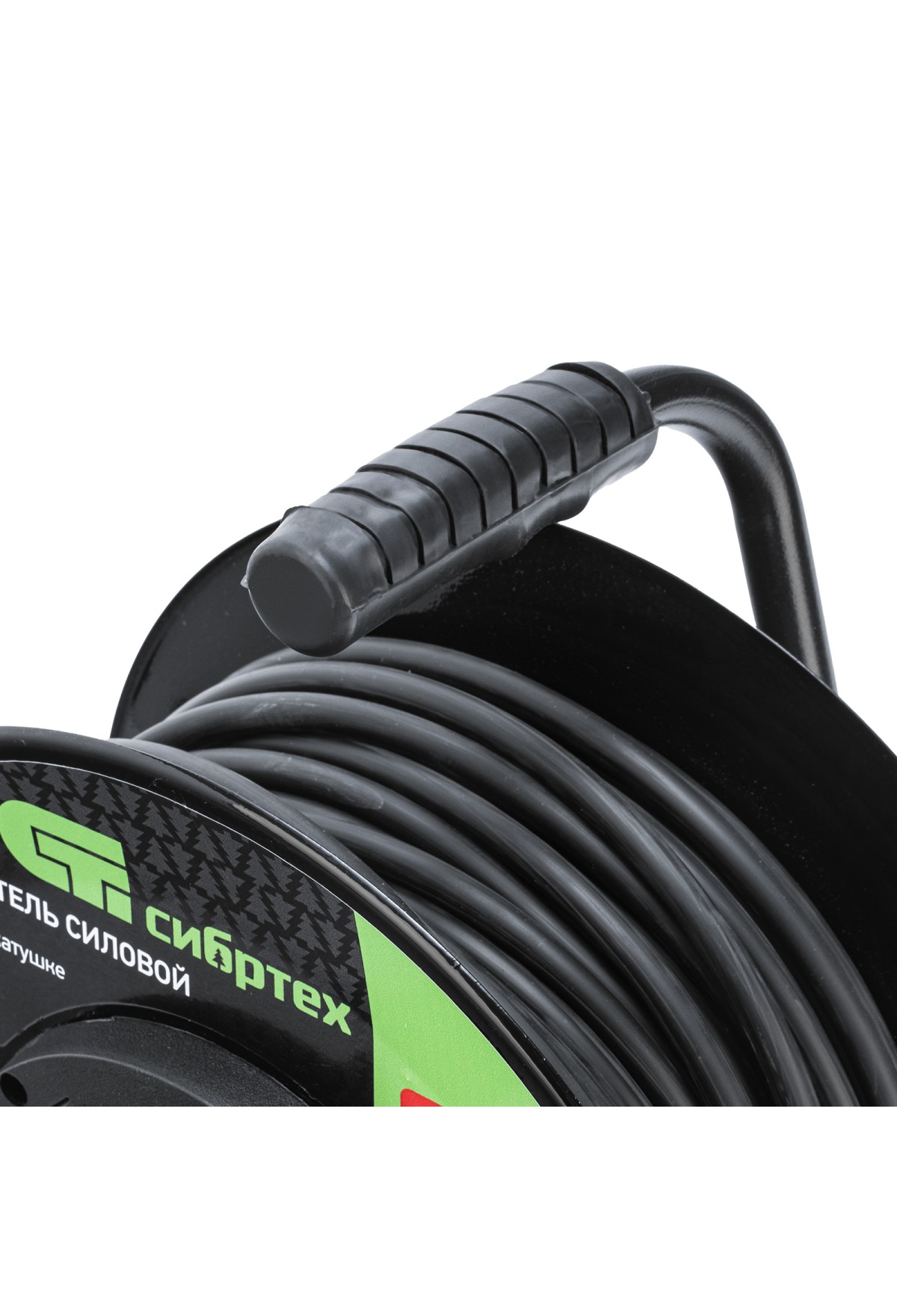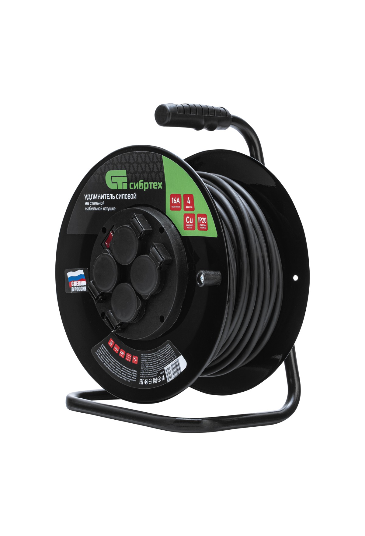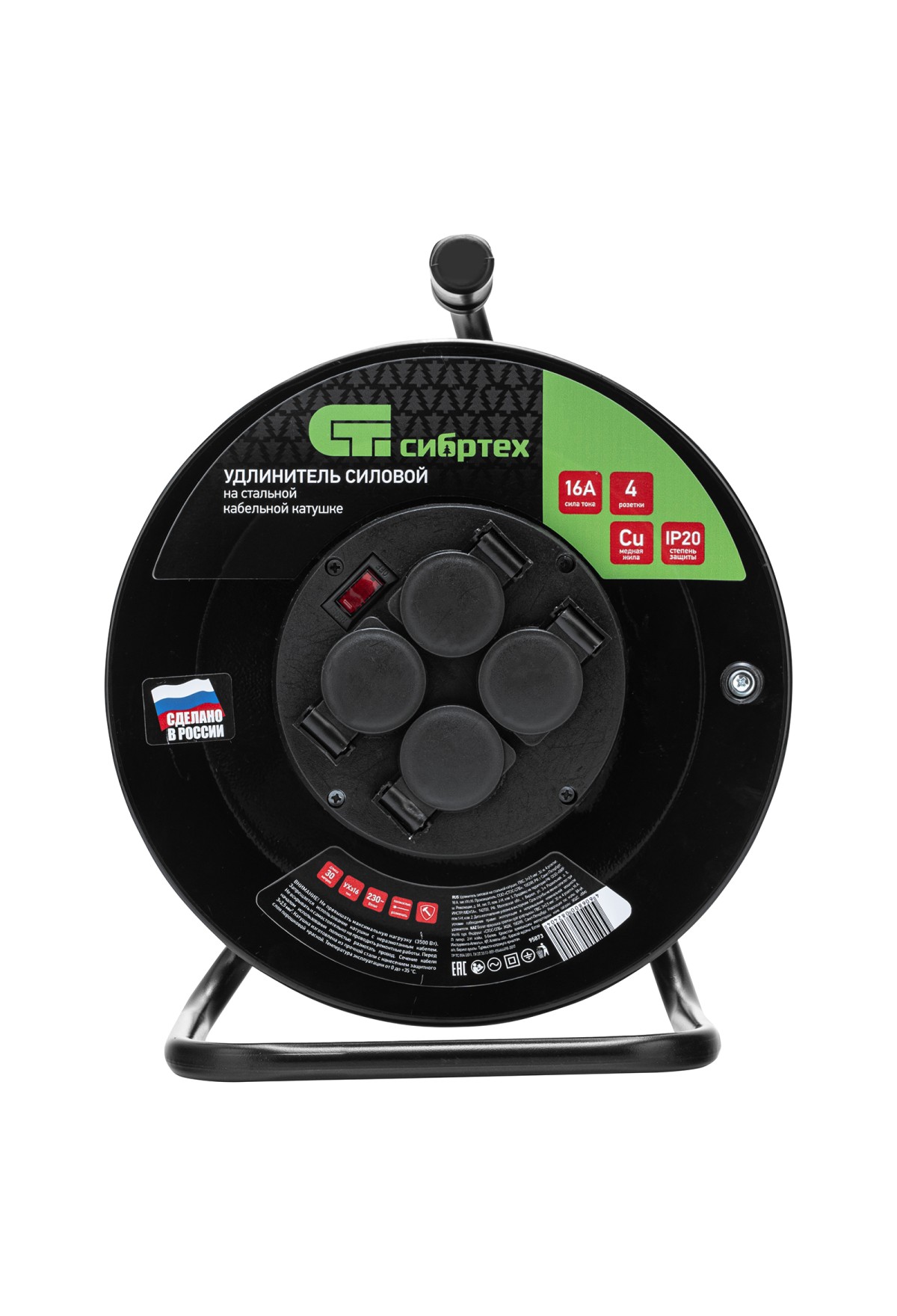 Удлинитель силовой 50 м, 16А, тип УХз16, ПВС 3 x 2.5 мм, на стальной катушке, 4 розетки Сибртех