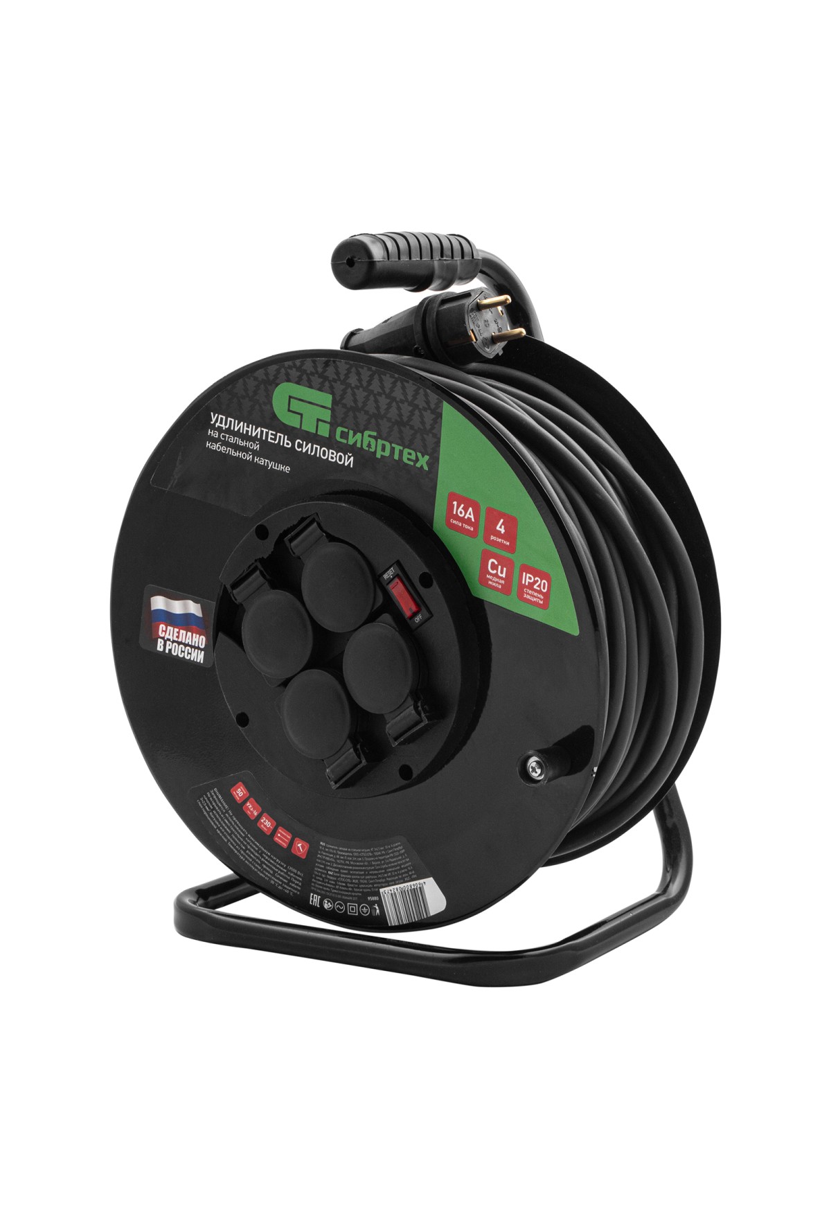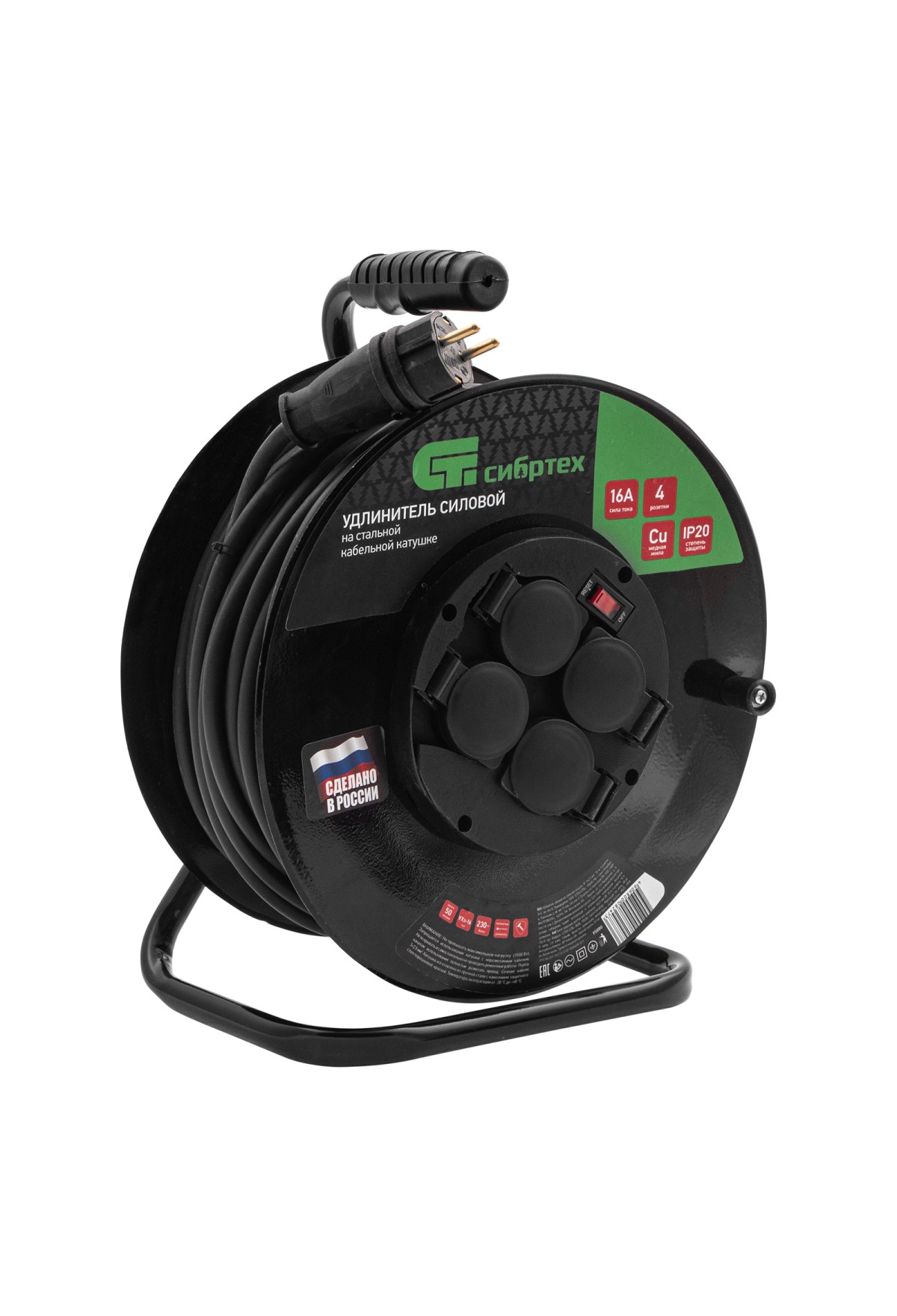 Удлинитель силовой 50 м, 16А, тип УХз16, КГ 3 x 2.5 мм, на стальной катушке, 4 розетки Сибртех
