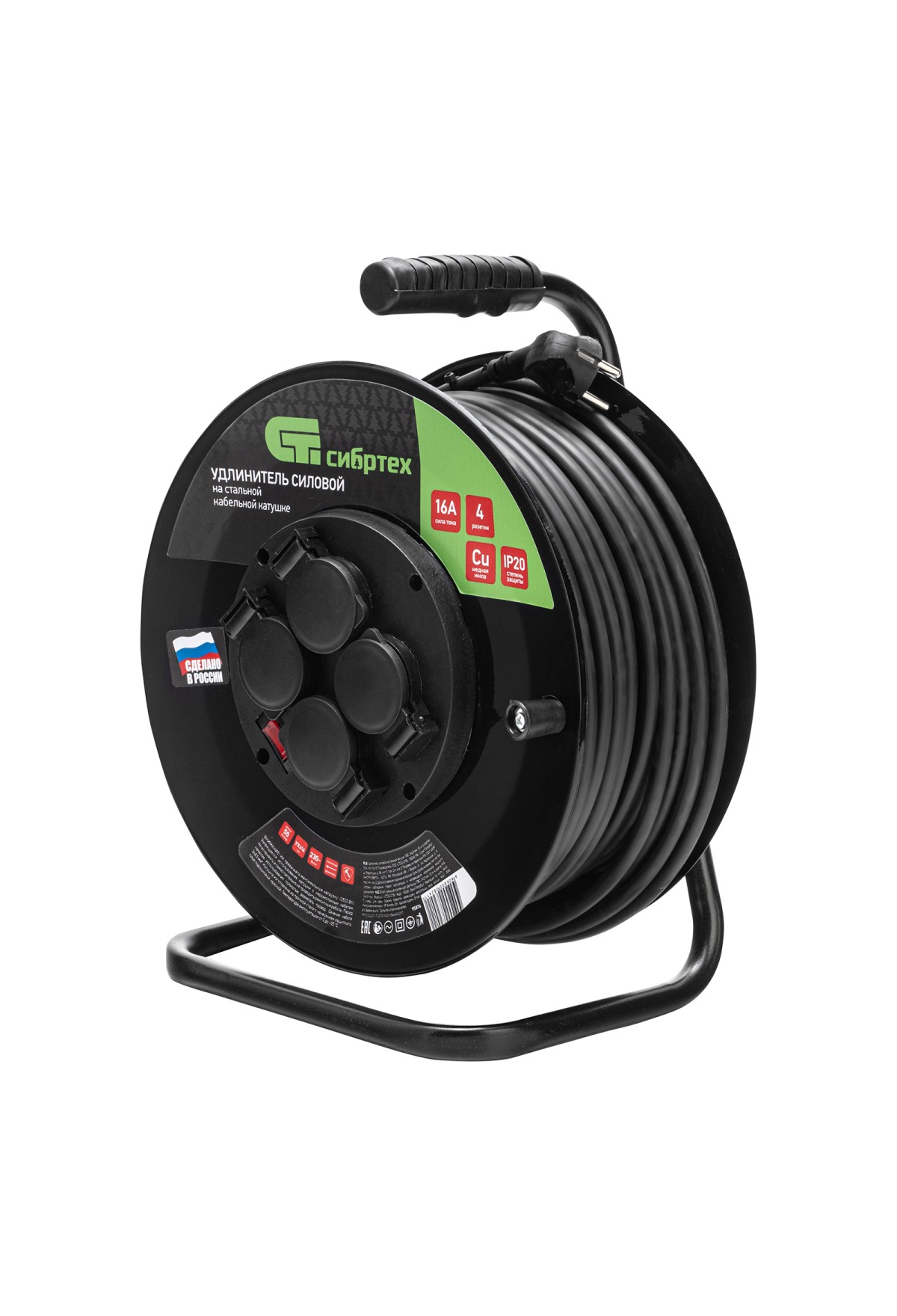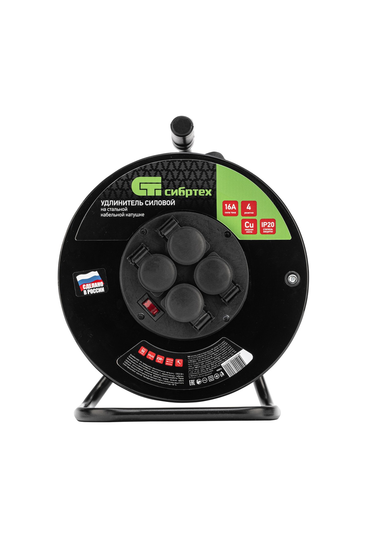 Удлинитель силовой 20 м, 16А, тип УХз16, ПВС 3 x 2.5 мм, на стальной катушке, 4 розетки Сибртех