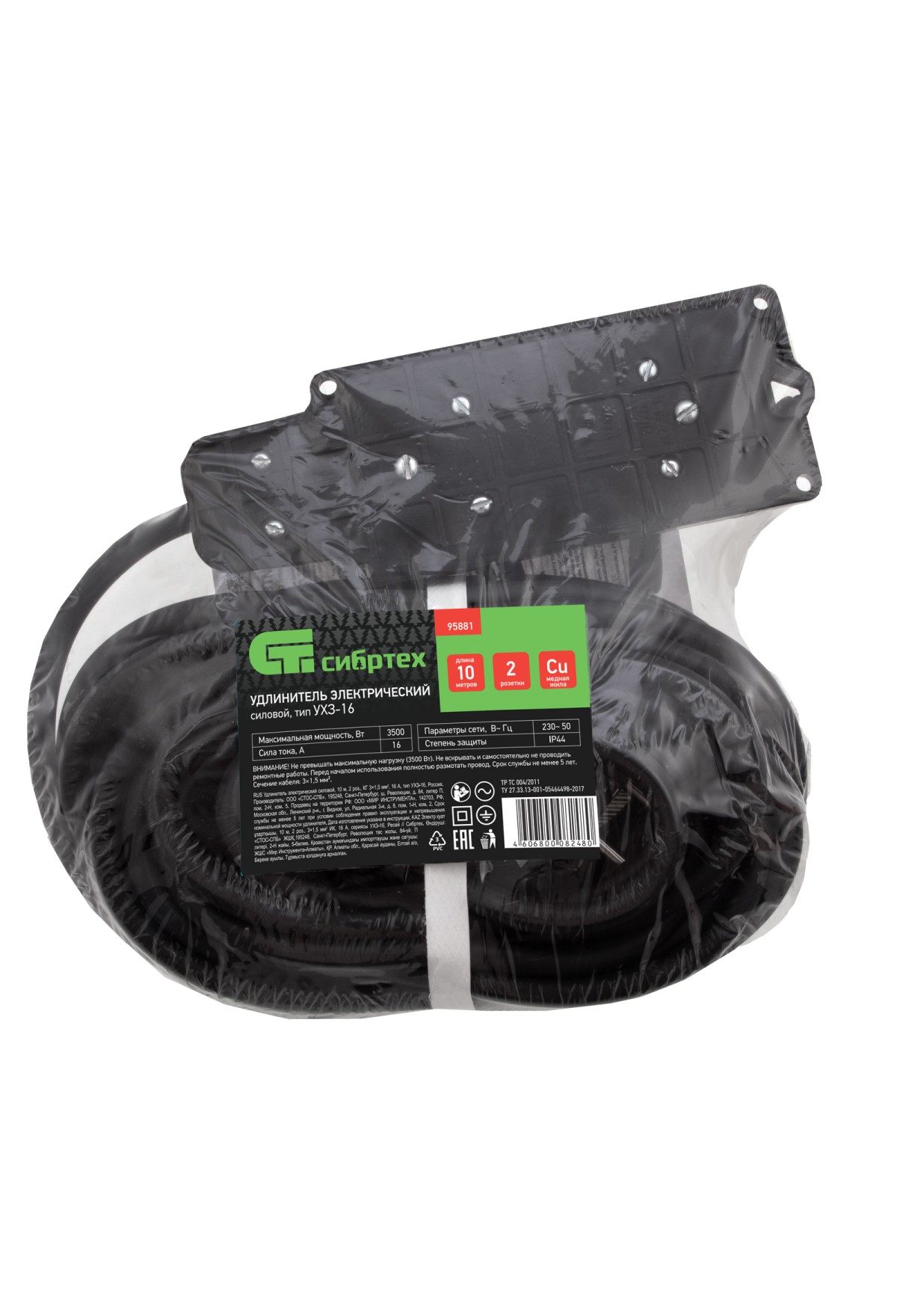Силовой удлинитель Сибртех 95881, тип УХЗ-16, 16 А, тип кабеля КГ 3 х 1,5 мм, с 2 розетками, позволяет подключать электрооборудование к сети на расстоянии до 10 м от стационарного источника электроснабжения. Медножильный кабель выдерживает нагрузку до 3500 Вт и рассчитан на длительное использование. Розетки закрываются защитными крышками, предотвращающей попадание грязи и влаги на разъемы. Сетевой удлинитель используется в строительстве и на производстве.