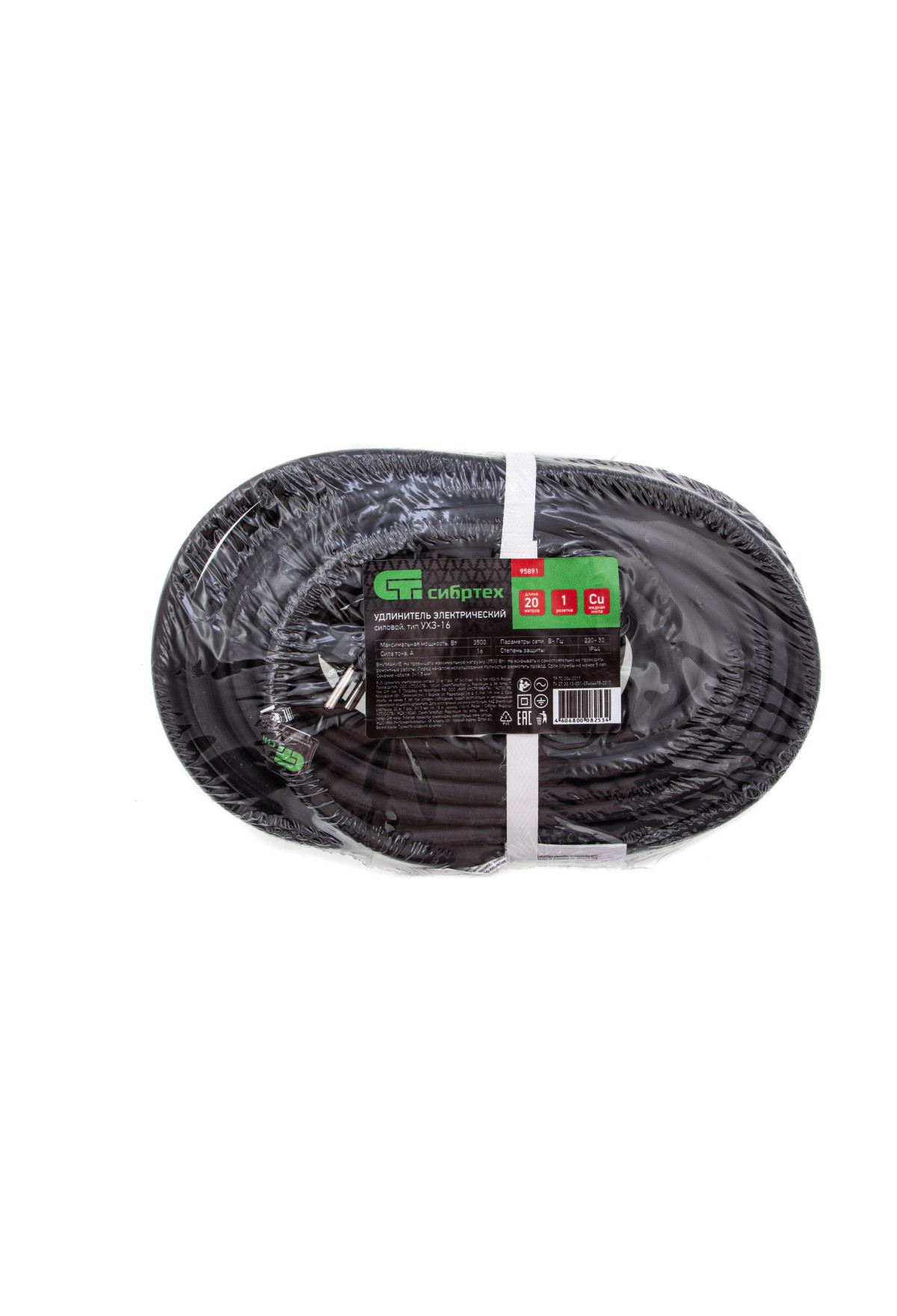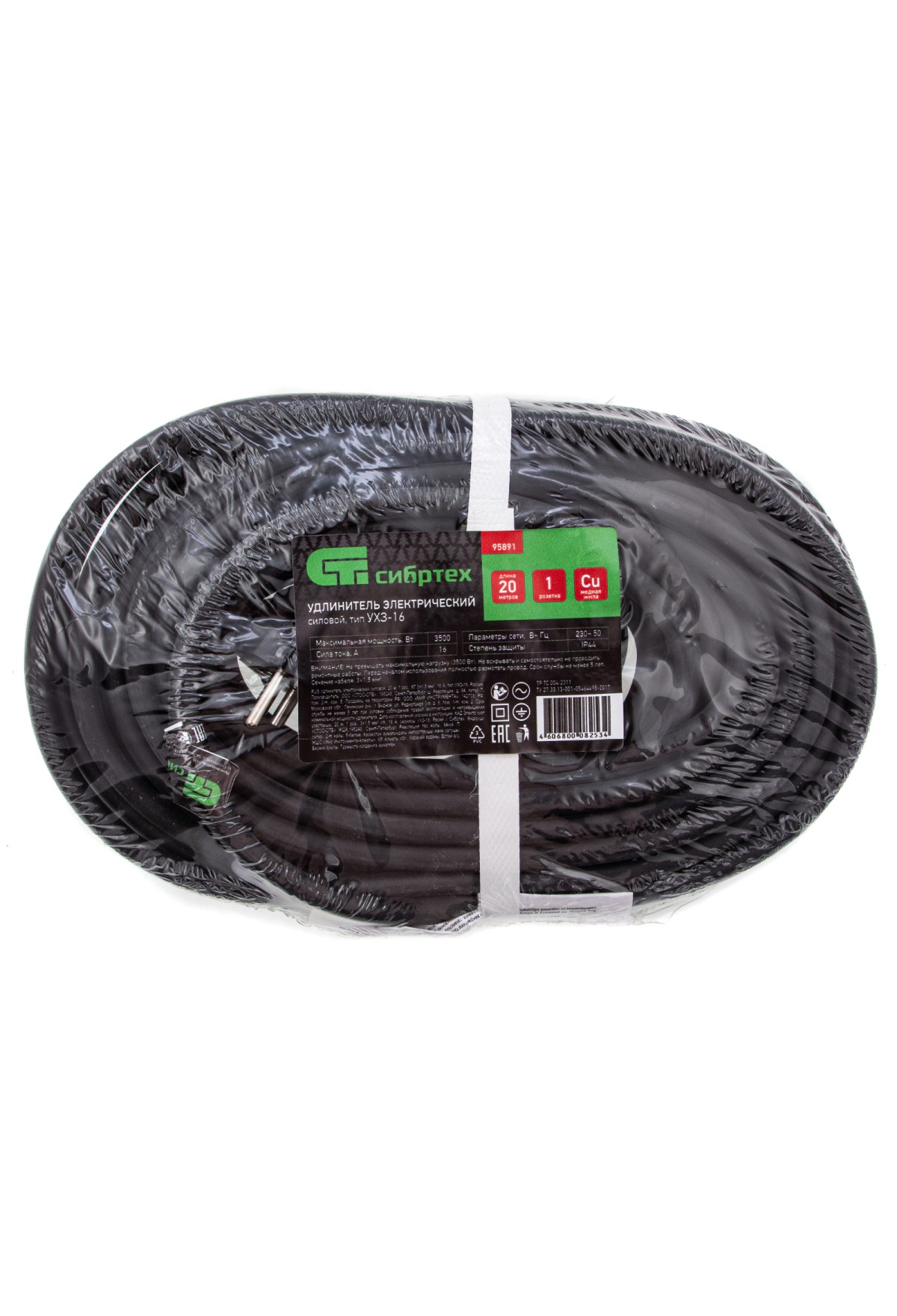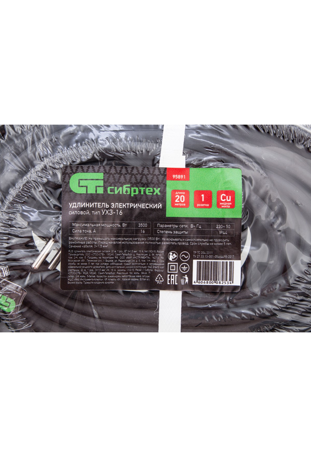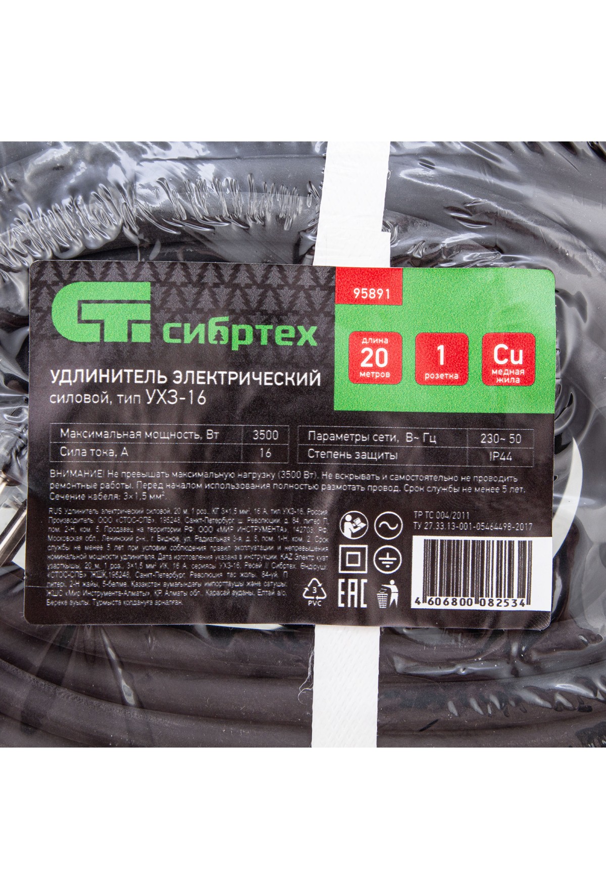 Силовой удлинитель Сибртех 95891, тип УХЗ-16, 16 А, тип кабеля КГ 3 х 1,5 мм, с 1 розеткой, позволяет подключать электрооборудование к сети на расстоянии до 20 м от стационарного источника электроснабжения. Медножильный кабель выдерживает нагрузку до 3500 Вт и рассчитан на длительное использование. Розетка закрывается защитной крышкой, предотвращающей попадание грязи и влаги на разъемы. Сетевой удлинитель используется в строительстве и на производстве.