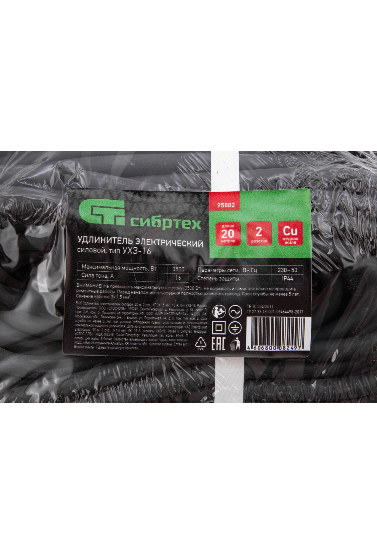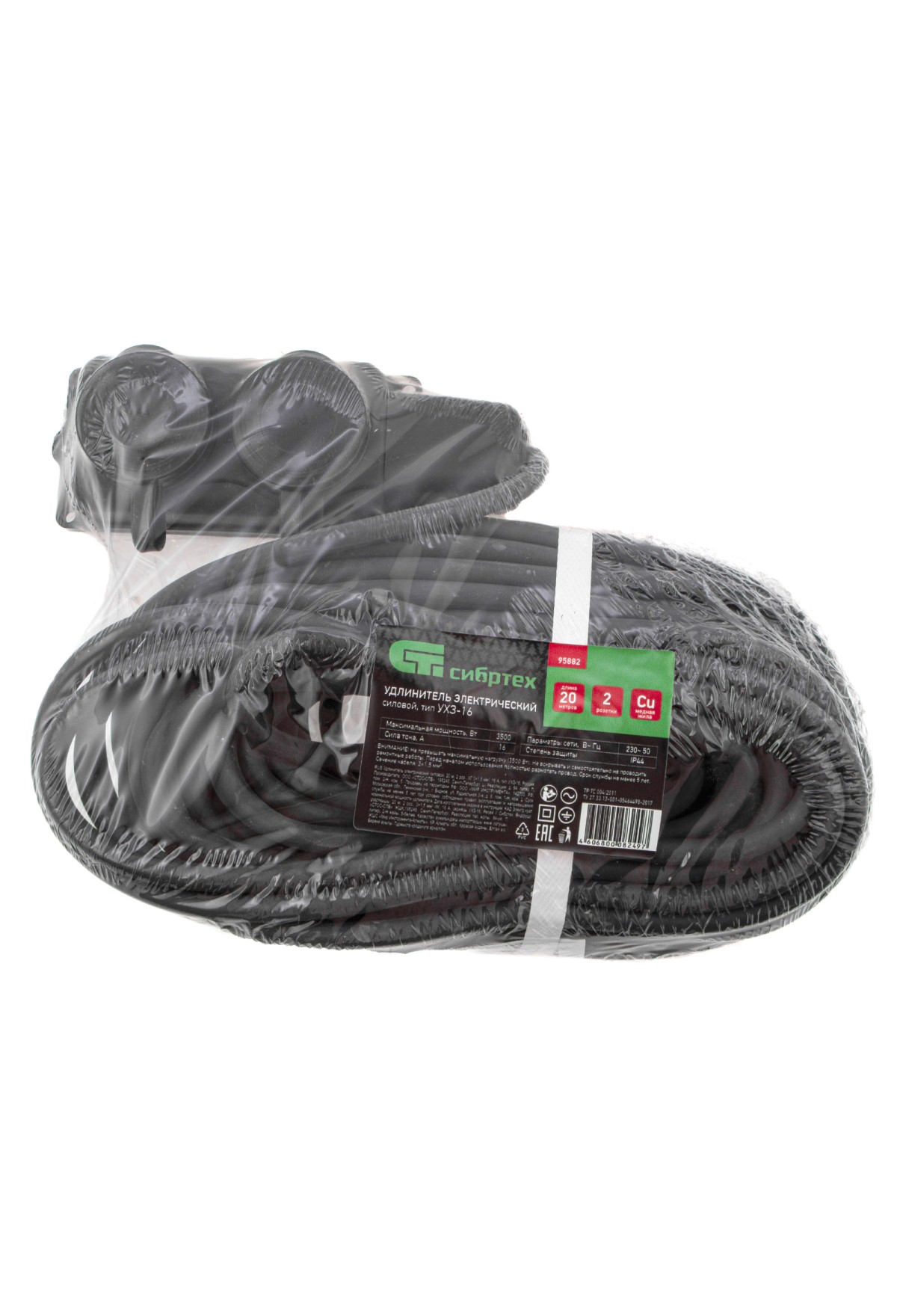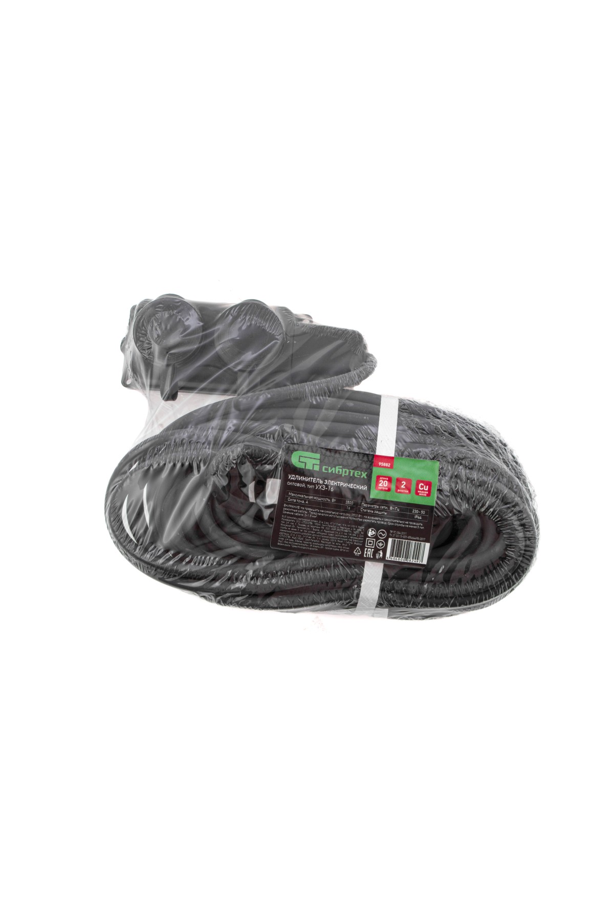 Силовой удлинитель Сибртех 95882, тип УХЗ-16, 16 А, тип кабеля КГ 3 х 1,5 мм, с 2 розетками, позволяет подключать электрооборудование к сети на расстоянии до 20 м от стационарного источника электроснабжения. Медножильный кабель выдерживает нагрузку до 3500 Вт и рассчитан на длительное использование. Розетки закрываются защитными крышками, предотвращающей попадание грязи и влаги на разъемы. Сетевой удлинитель используется в строительстве и на производстве.