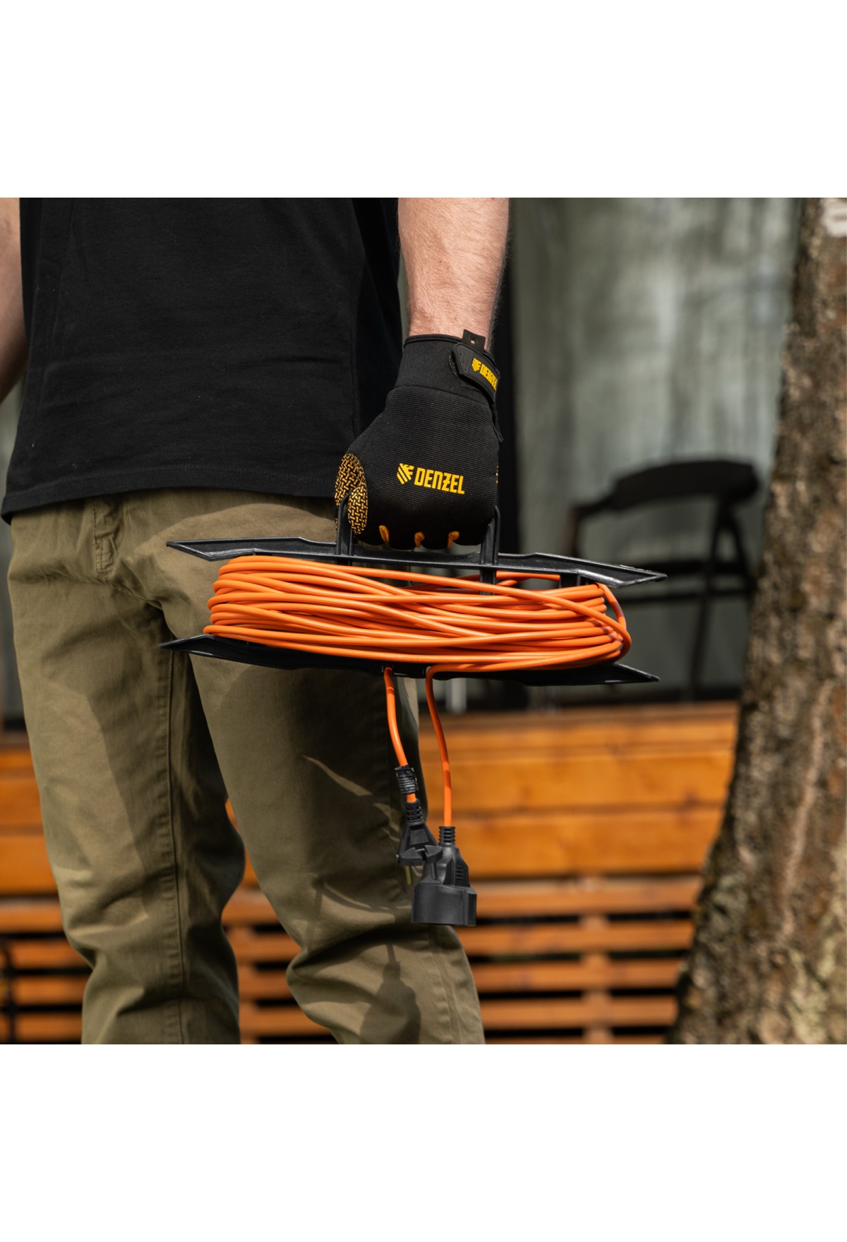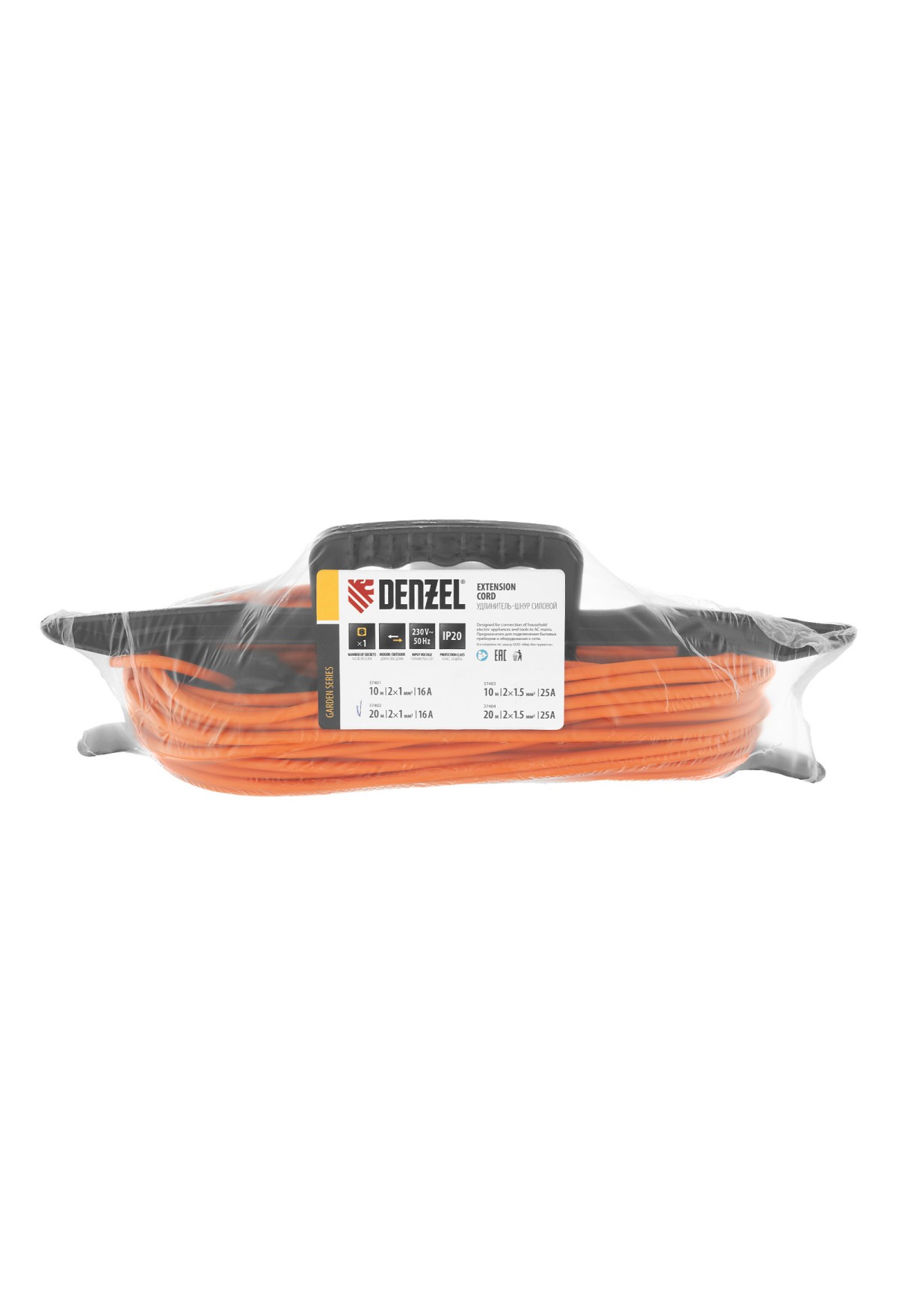 Силовой удлинитель-шнур Denzel Garden Series 37402 с кабелем ПВС сечением 2 x 1 мм и 1 розеткой без заземления, позволяет подключать приборы к электросети на расстоянии до 20 м от стационарного источника питания. Максимальная мощность потребителя составляет 3500 Вт при полностью размотанном кабеле и 1750 Вт — при смотанном. Удлинитель может использоваться при температуре от +5 до +35 °C. Пригодится дома, на даче, в гараже.