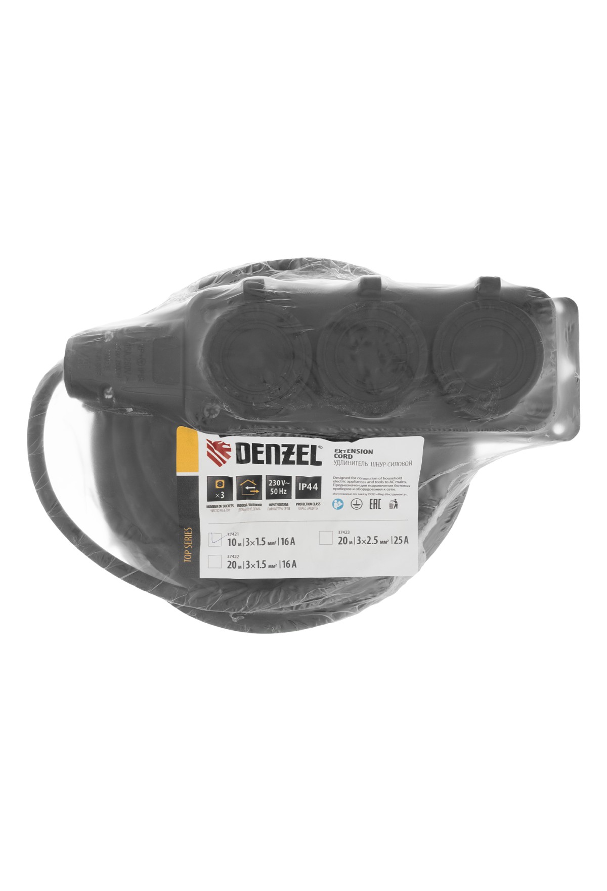 Силовой удлинитель-шнур Denzel Top Series 37421 с 3 розетками, с кабелем КГТТ сечением 3 x 1,5 мм и длиной 10 м, предназначен для подключения электроприборов на удалении от розетки. Суммарная мощность потребителей составляет 3680 Вт для полностью размотанного кабеля и 1840 Вт — для смотанного. Удлинитель подходит для подключения электроинструмента, будет полезен на строительной площадке и в быту.