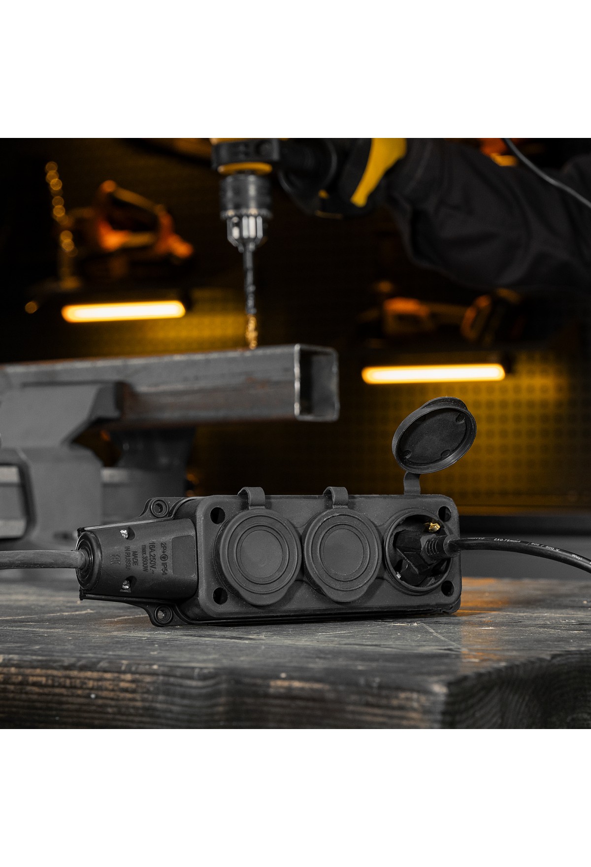 - Высокая степень защиты — удлинитель можно использовать даже во время выпадения осадков.