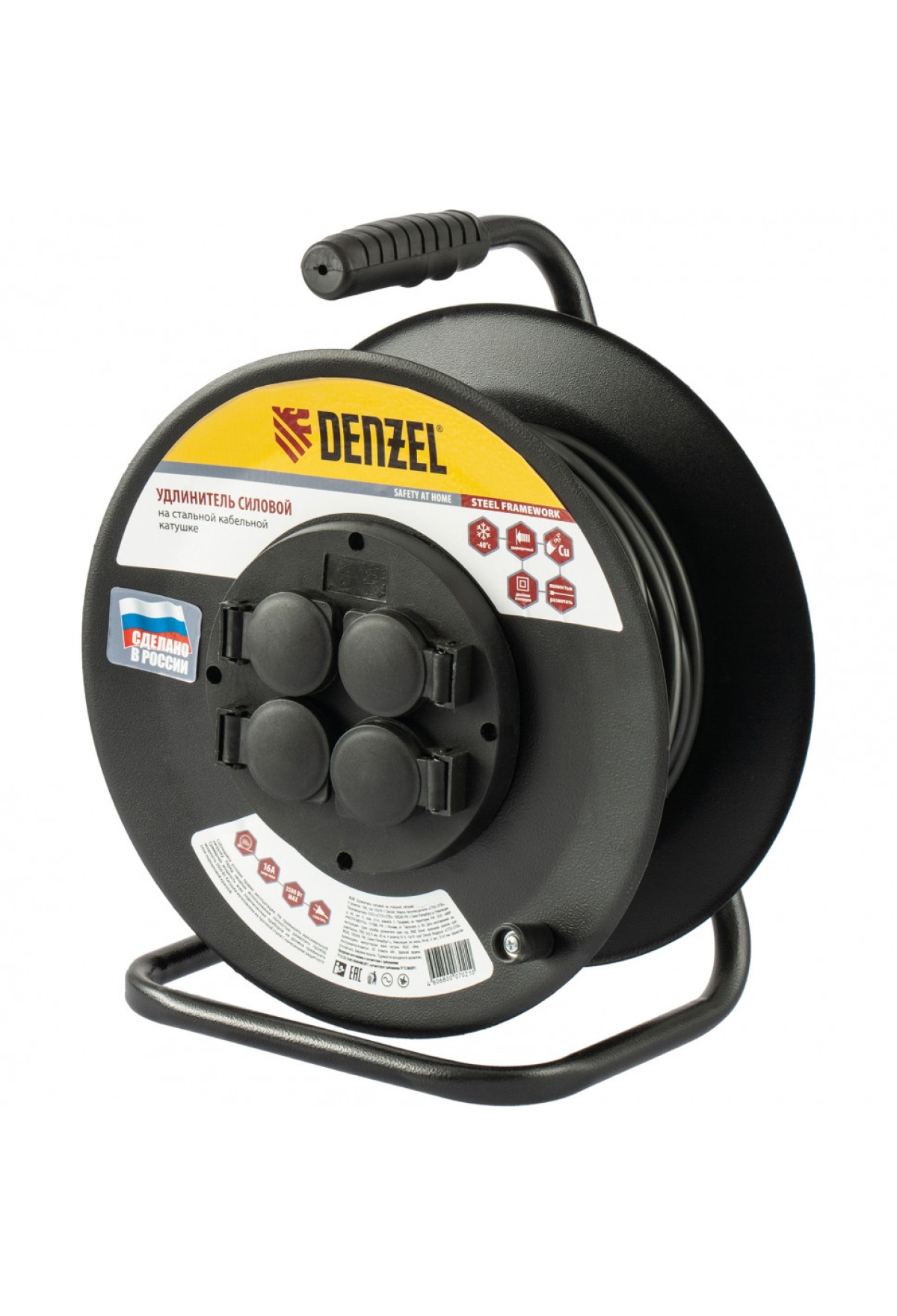 Силовой удлинитель на стальной катушке Denzel 95984 серии УХз-16, с кабелем типа ПВС, сечением 3 х 2,5 мм и длиной 30 м, рассчитан на силу тока 16 А и имеет 4 розетки, к которым можно подключить оборудование суммарной мощностью не более 3500 Вт. Заземляющие контакты розеток предотвращают получение пользователем электротравмы в случае утечки тока. Розеточная группа выполнена из пластика, а металлическая опора полая, что уменьшает вес изделия и облегчает его перемещение. Удлинитель используется для профессиональных строительных работ, а также востребован на производственных предприятиях.