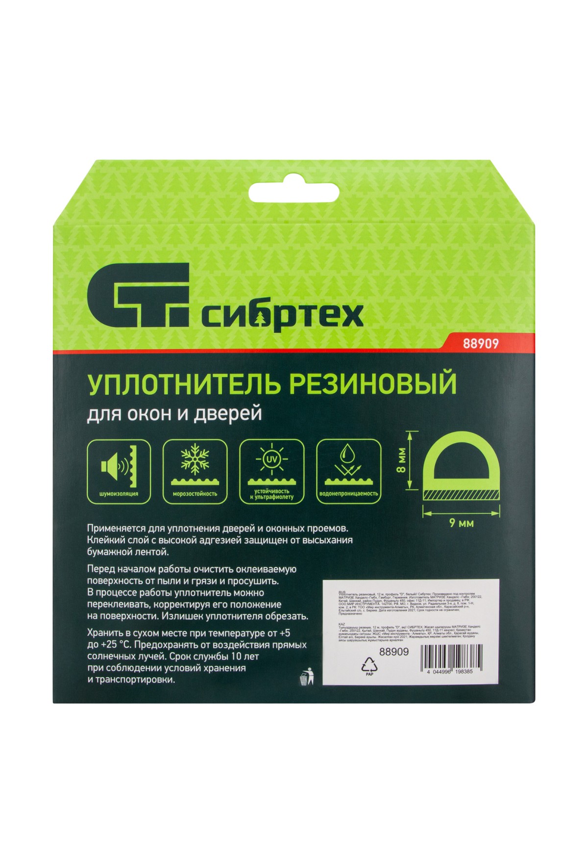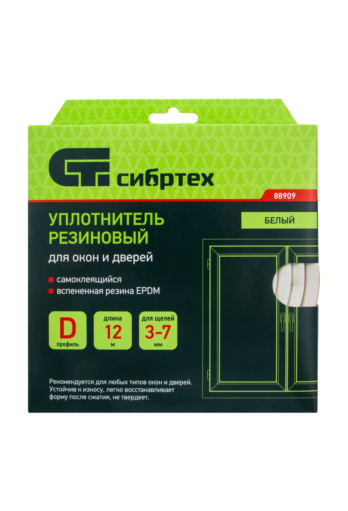 Белый резиновый уплотнитель Сибртех 88909 длиной 12 м, профиль «D», предназначен для герметизации и уплотнения оконных и дверных блоков с целью исключения сквозняков и вибраций, защиты от влаги и пыли, создания эффективной тепло- и звукоизоляции. Изделие снижает энергетические и экономические затраты. D профиль 9 х 8 мм подойдет для щелей размером 3-7 мм.