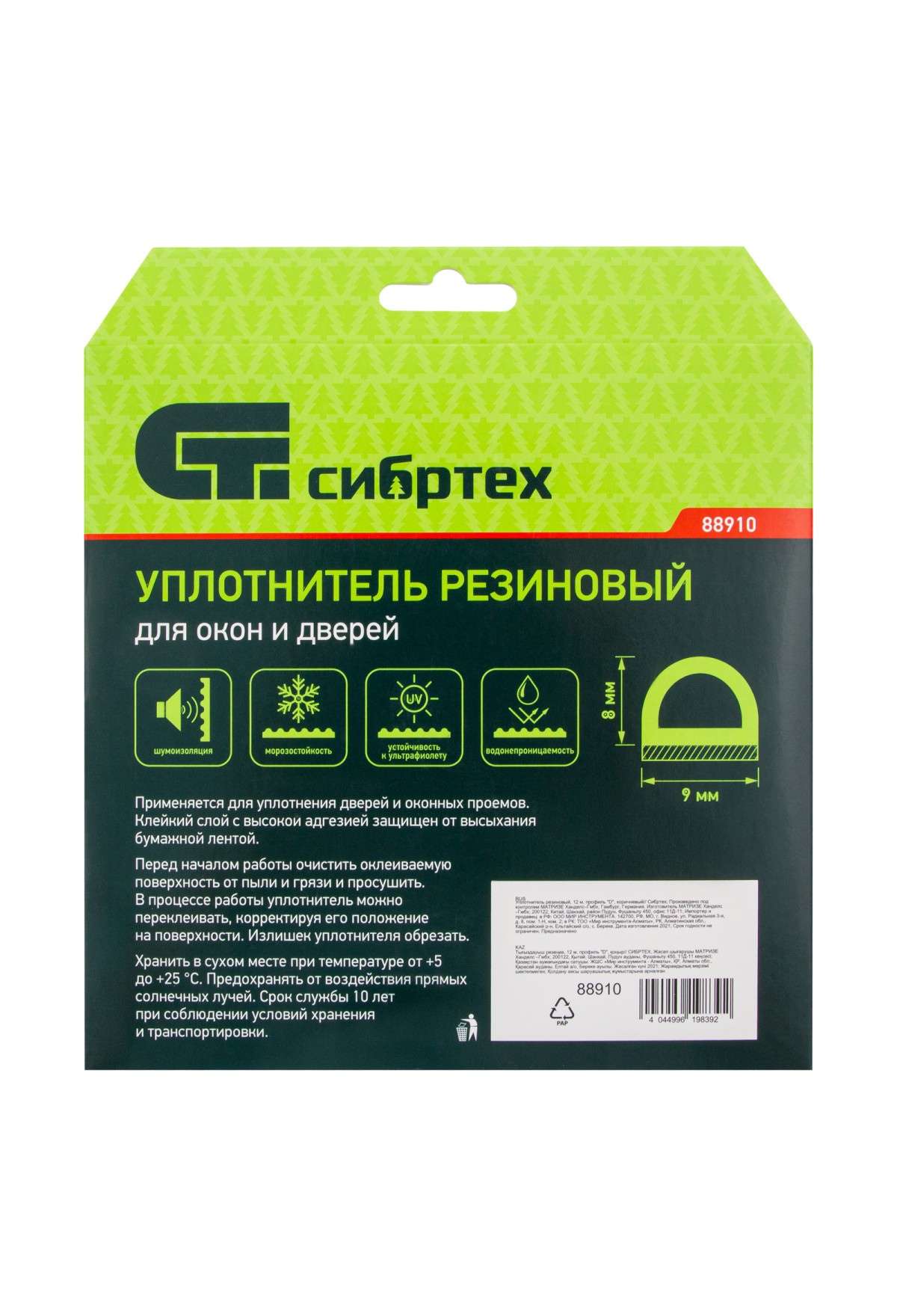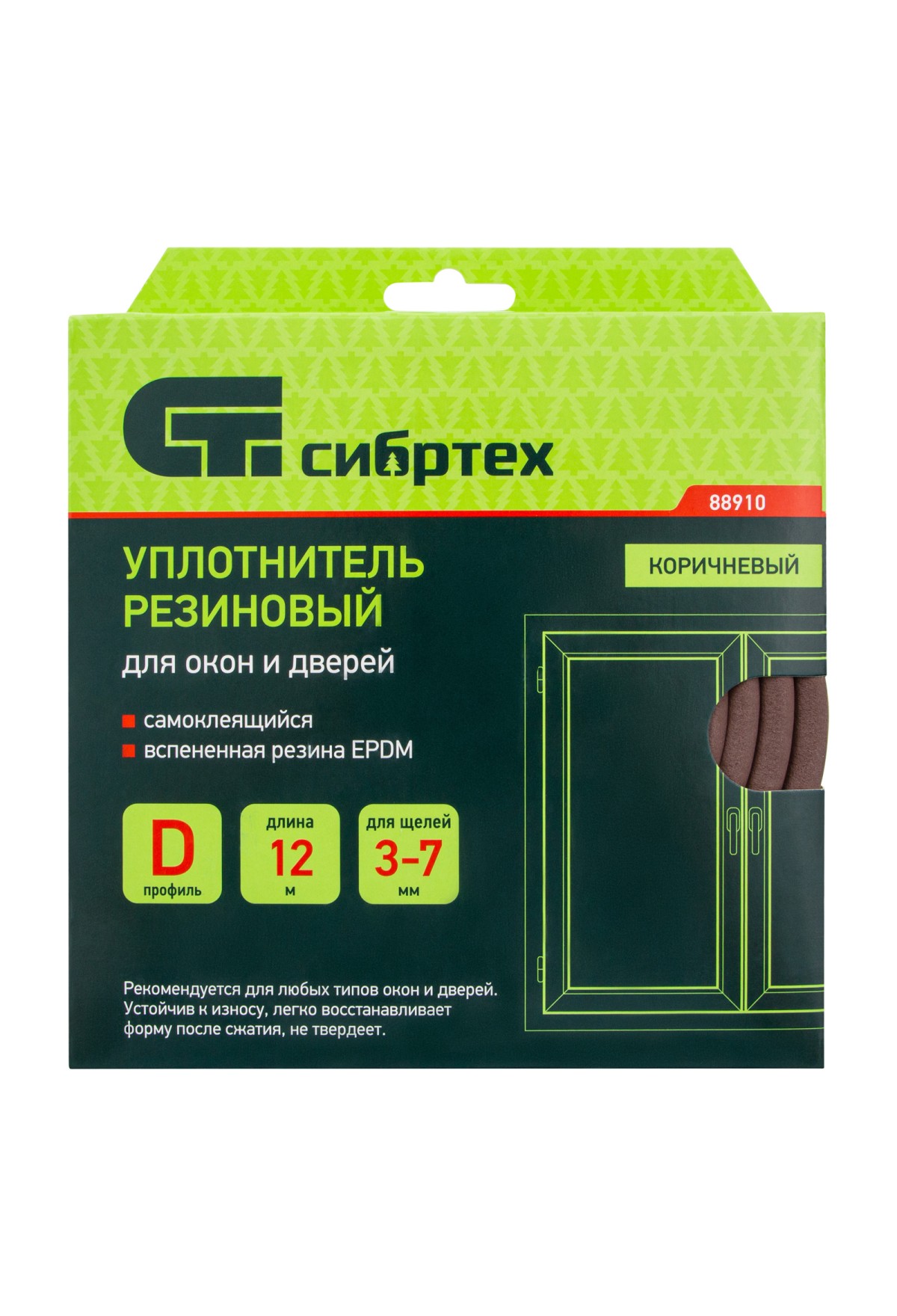 Коричневый резиновый уплотнитель Сибртех 88910 длиной 12 м, профиль «D», предназначен для герметизации и уплотнения оконных и дверных блоков с целью исключения сквозняков и вибраций, защиты от влаги и пыли, создания эффективной тепло- и звукоизоляции. Изделие снижает энергетические и экономические затраты. D профиль 9 x 8 мм подойдет для щелей размером 3-7 мм.