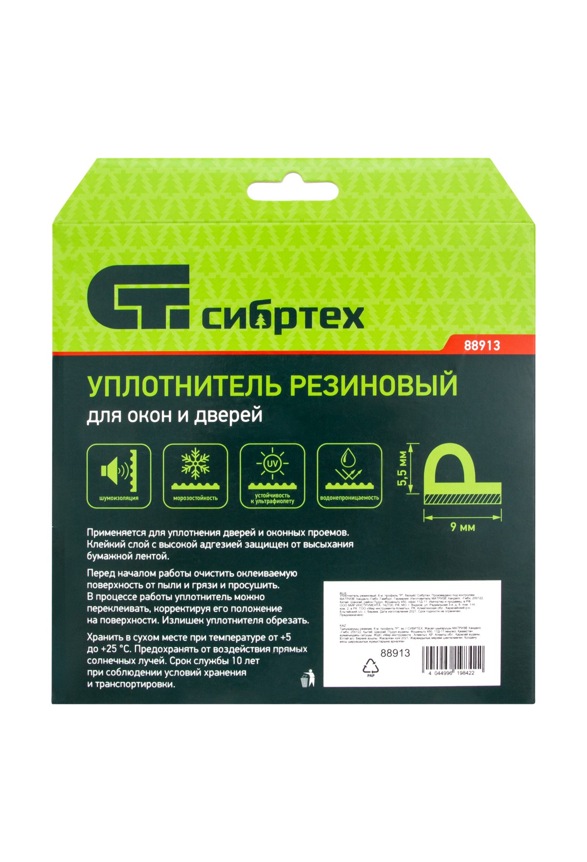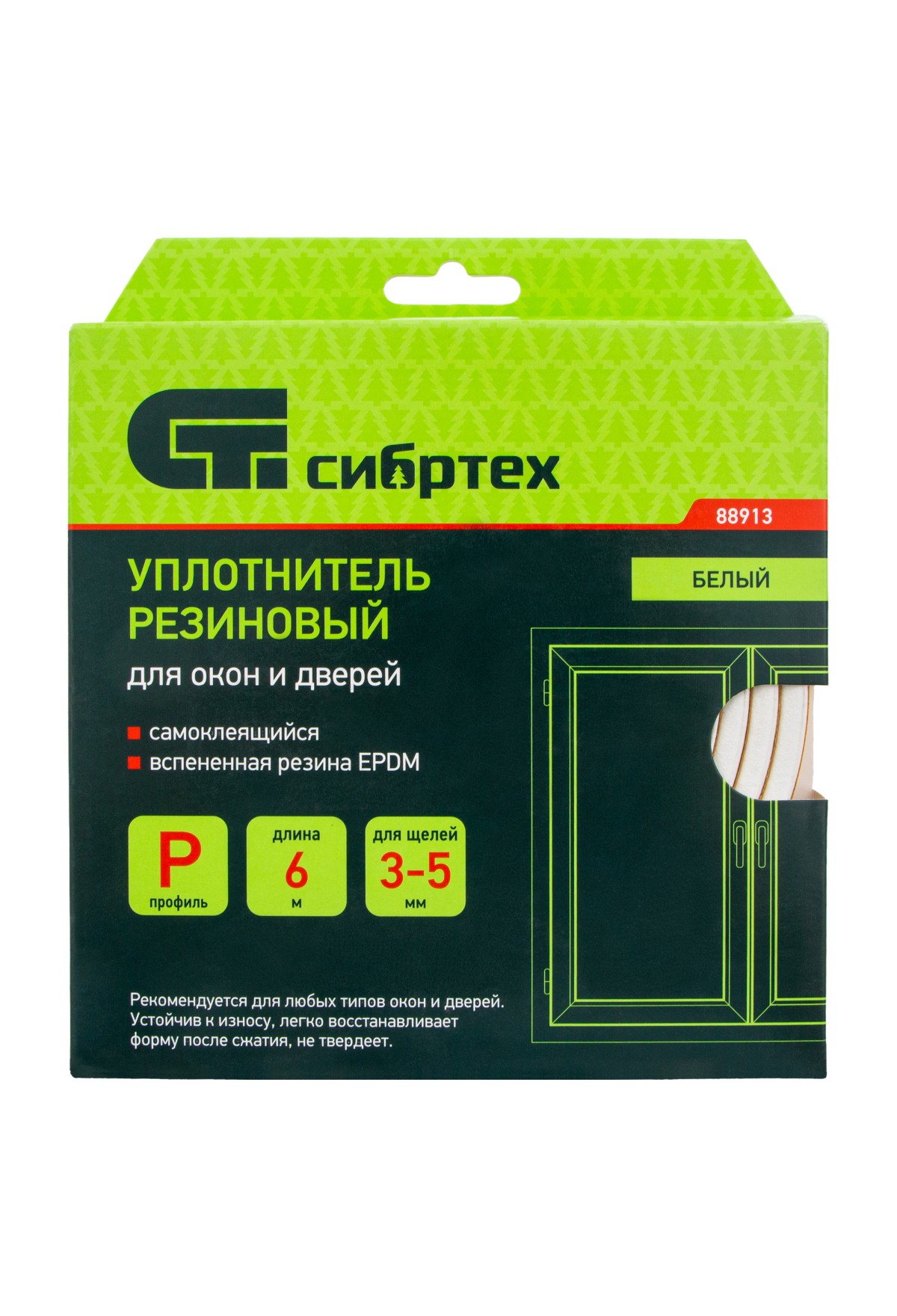 Белый резиновый уплотнитель Сибртех 88913 длиной 6 м, профиль «Р», предназначен для герметизации и уплотнения оконных и дверных блоков с целью исключения сквозняков и вибраций, защиты от влаги и пыли, создания эффективной тепло- и звукоизоляции. Изделие снижает энергетические и экономические затраты. P профиль 9 x 5,5 мм подойдет для щелей размером 3-5 мм.