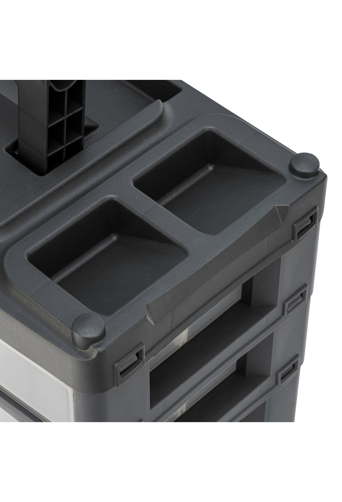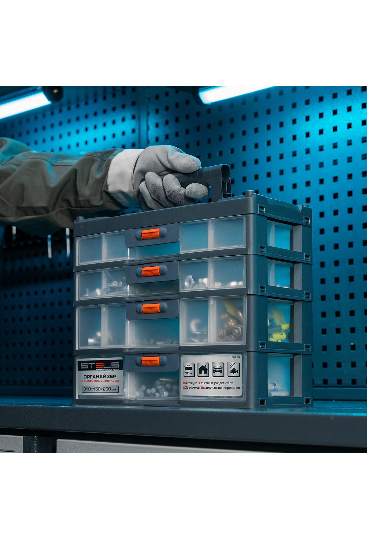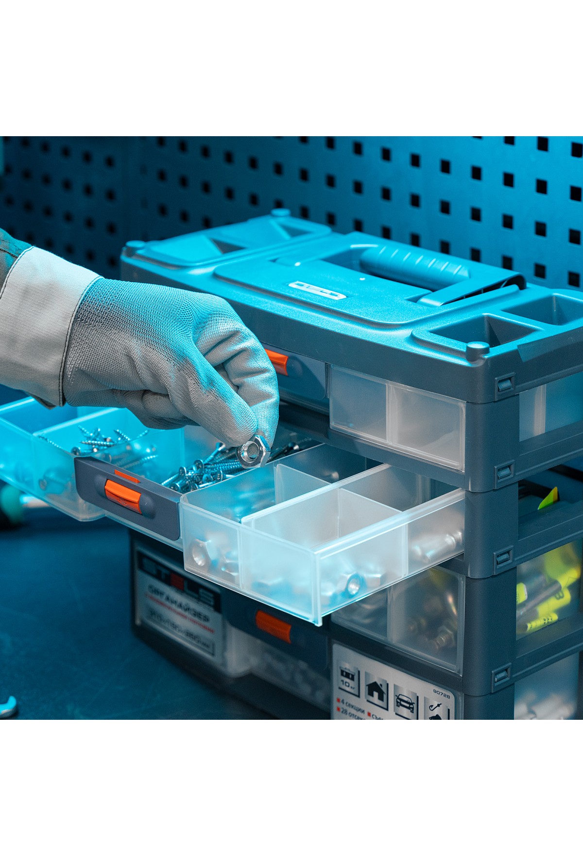 - Комфортная транспортировка — благодаря рукоятке и защелкам, предотвращающим случайное открытие, органайзер удобно перемещать.