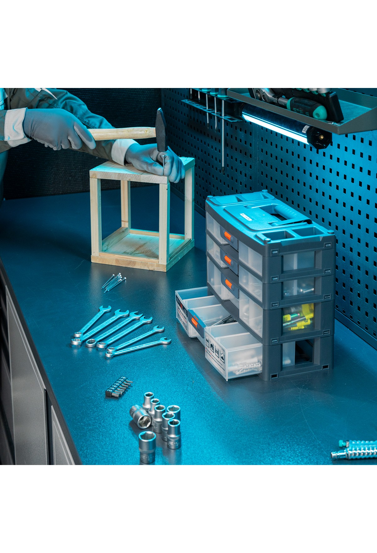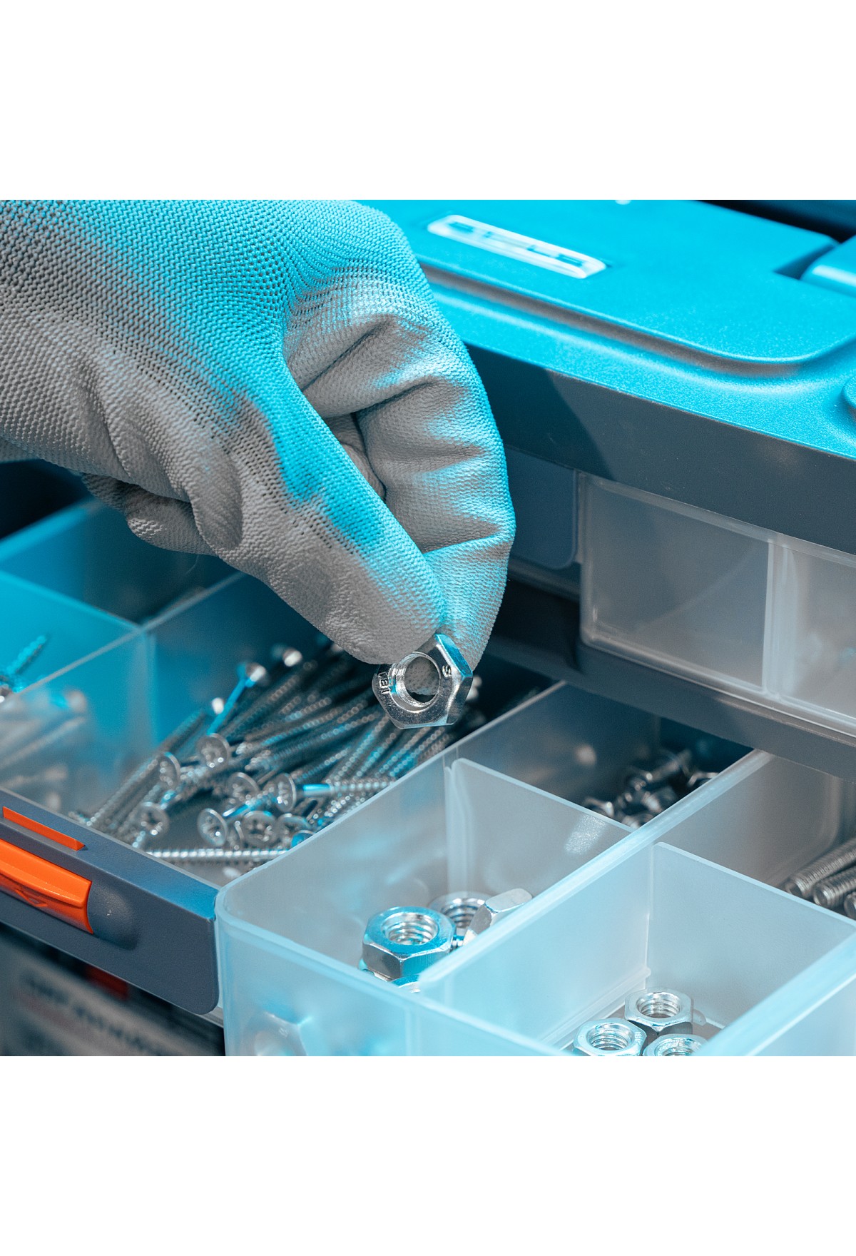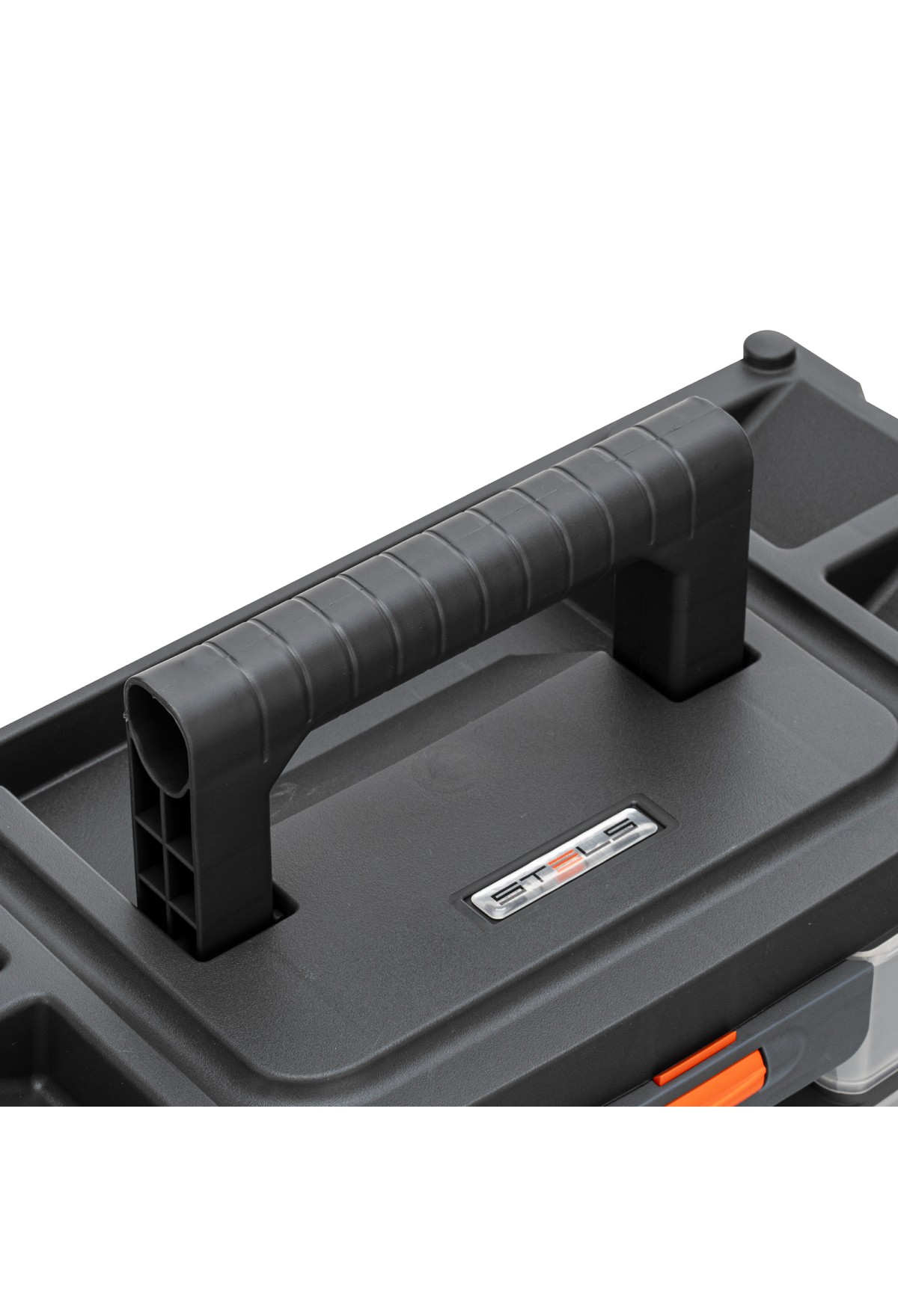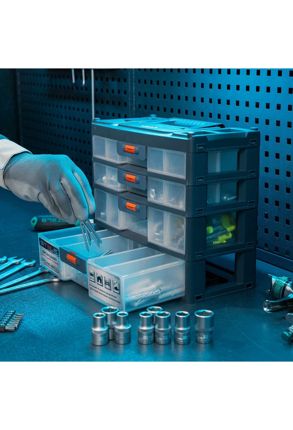- Комфортная транспортировка — благодаря рукоятке и защелкам, предотвращающим случайное открытие, органайзер удобно перемещать.