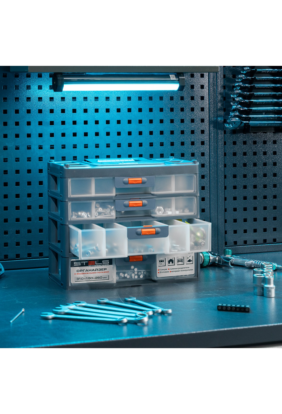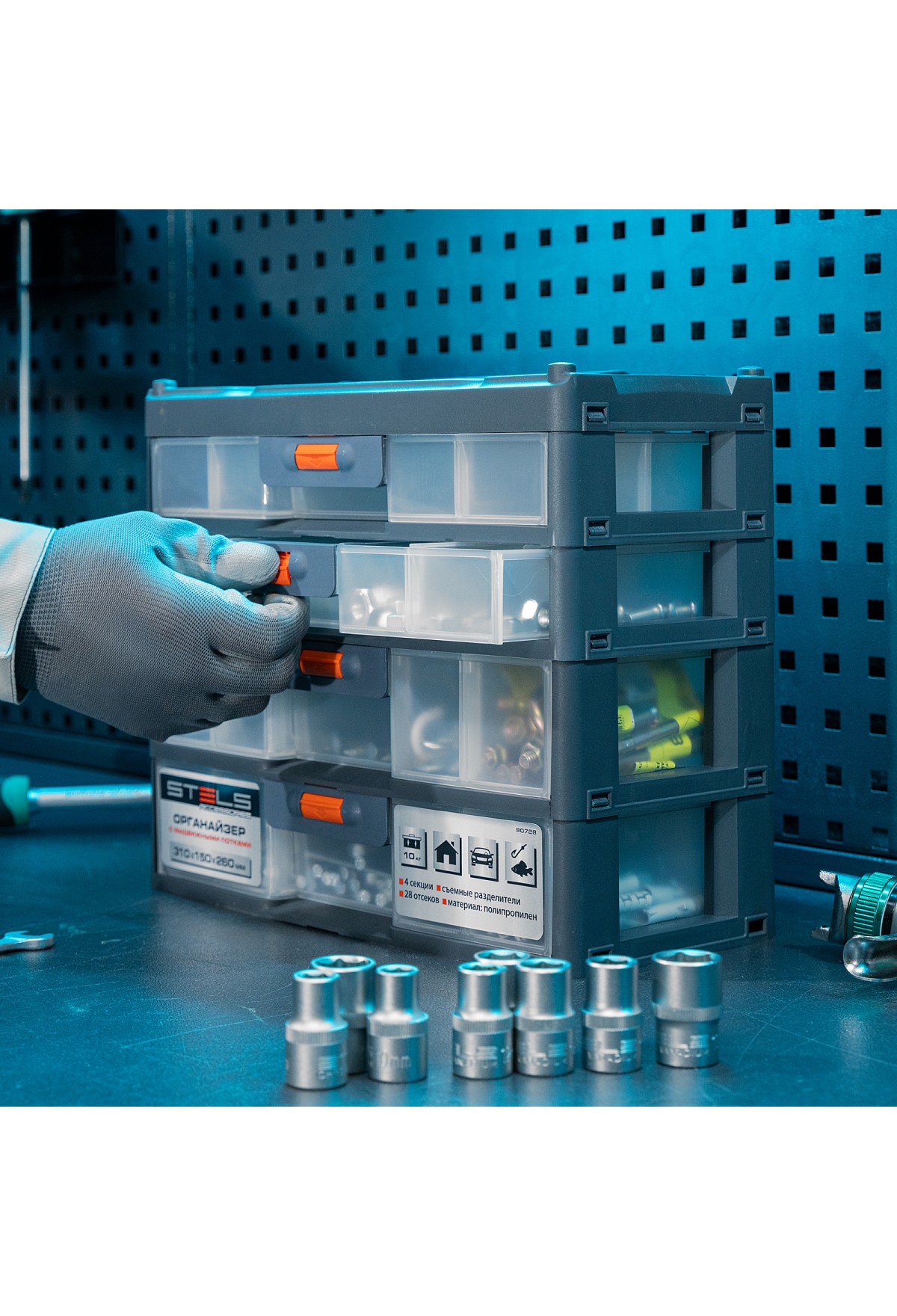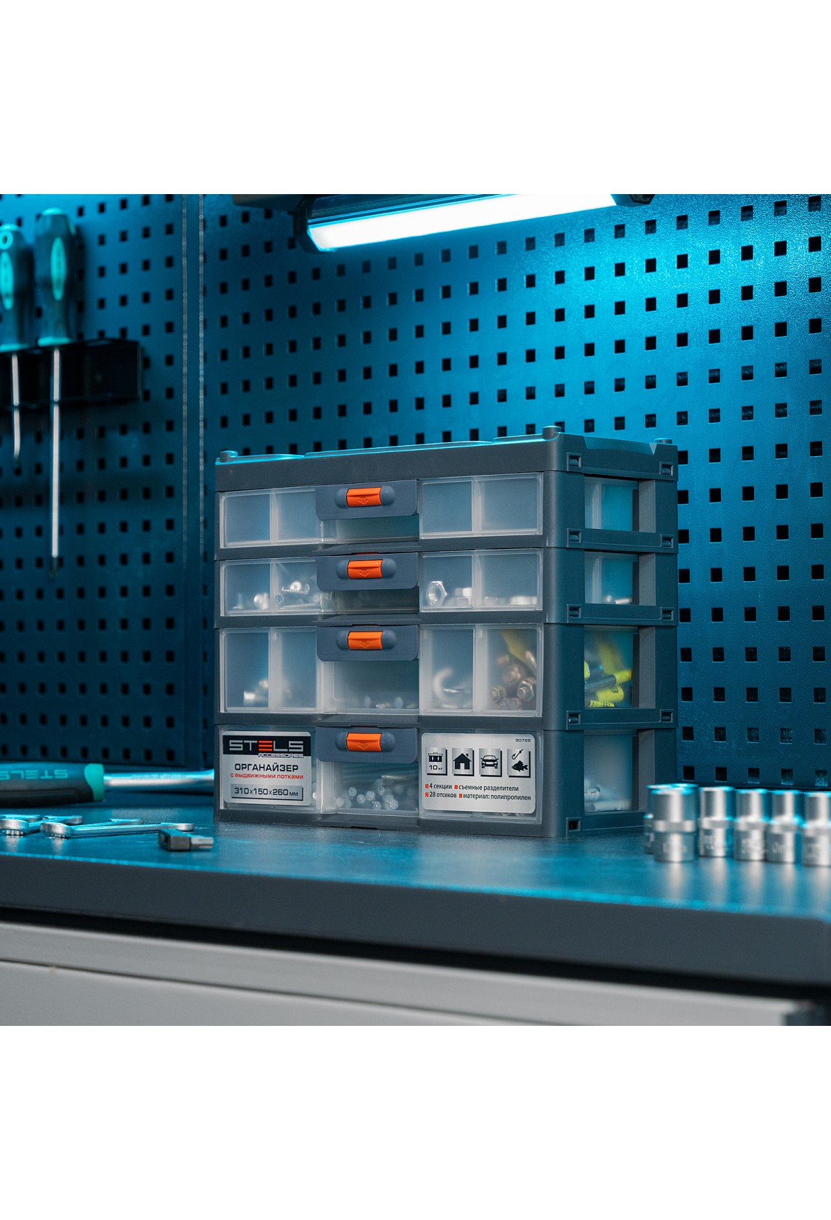 Органайзер Stels 90728 размером 310 х 150 х 260 мм, из пластика, имеет 4 секции с выдвижными лотками и используется для хранения крепежных элементов, принадлежностей для рукоделия, снастей и т.д. Обеспечивает быстрый доступ к предметам, позволяет избежать их перемешивания и утери. Пригодится в гараже, мастерской, будет полезен в домашнем хозяйстве.