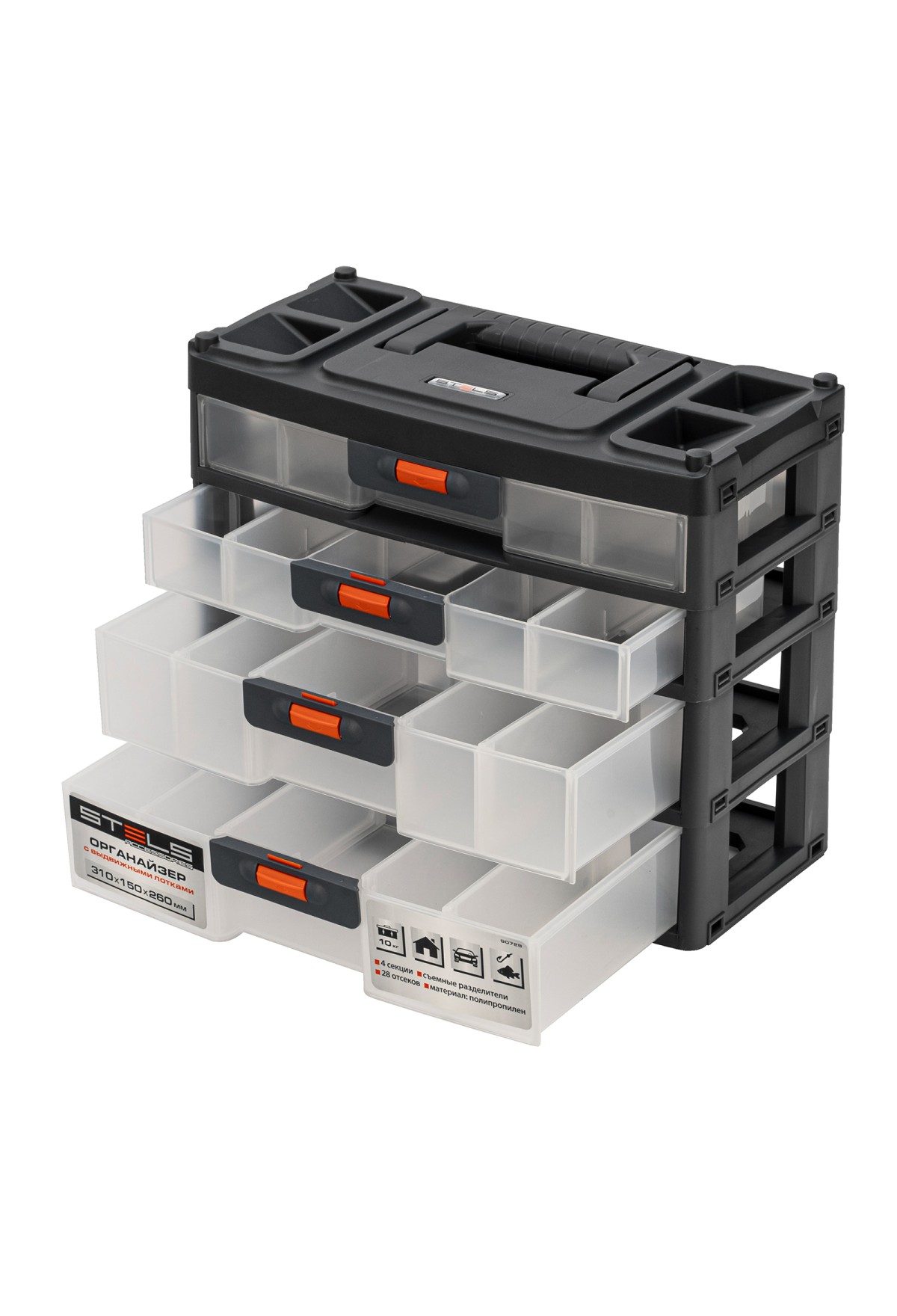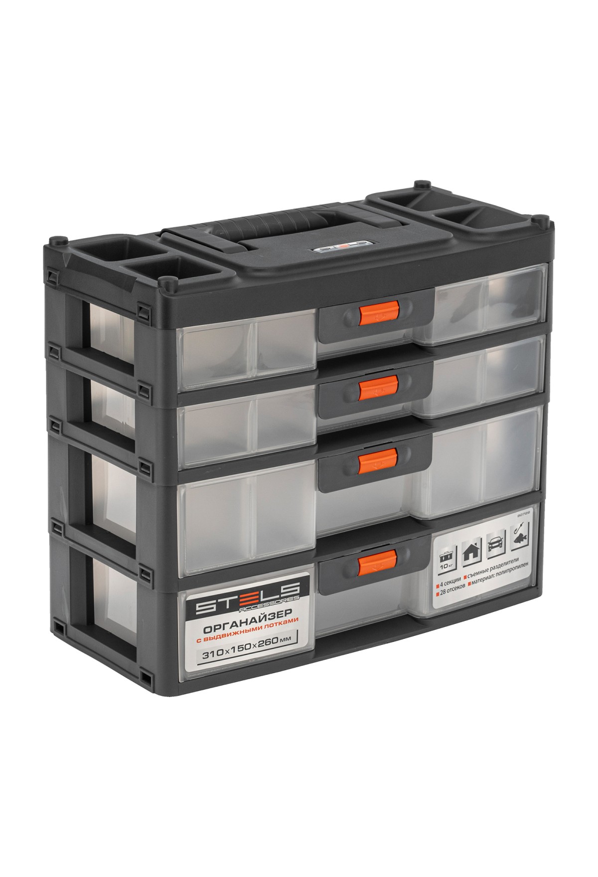 Технические характеристики Органайзер для хранения с выдвижными лотками 310х150х260мм, 4 секции, пластик Россия Stels