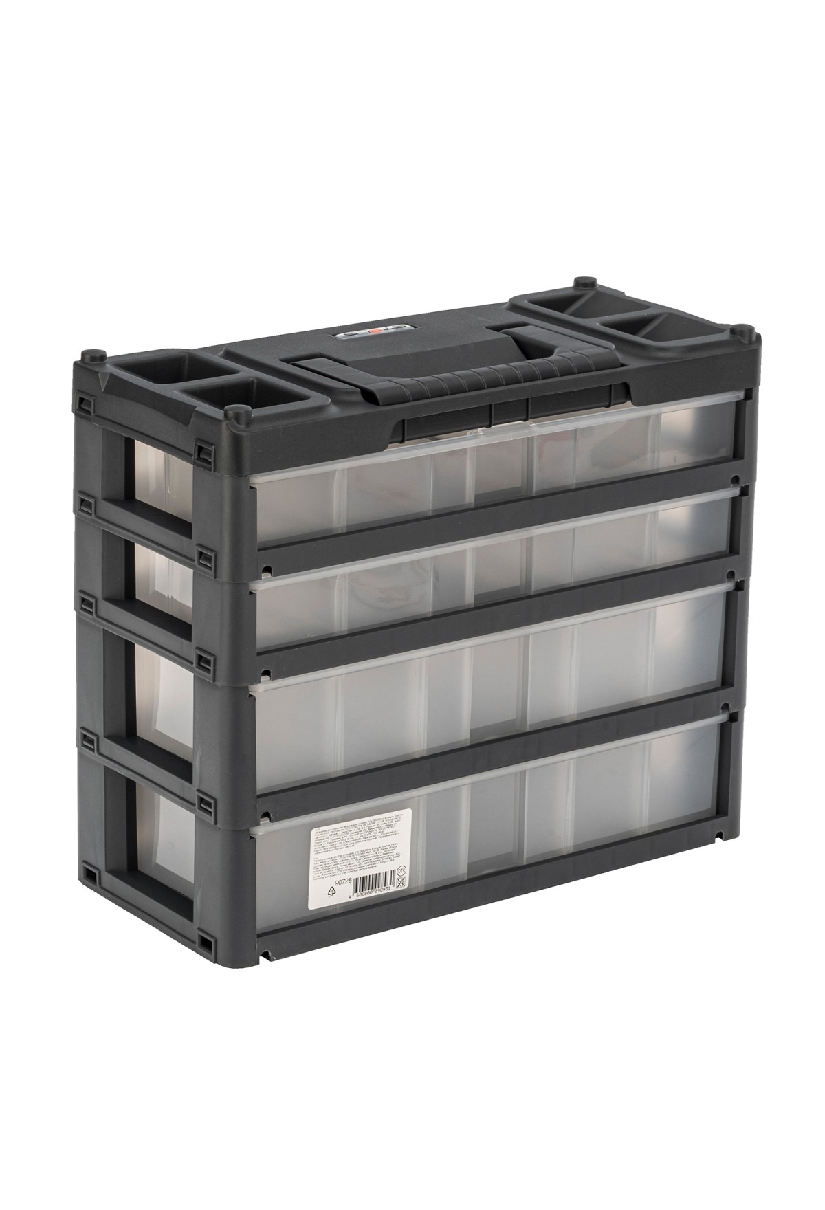 - Вместительность — в четырехъярусном органайзере помещается большое количество различных деталей.