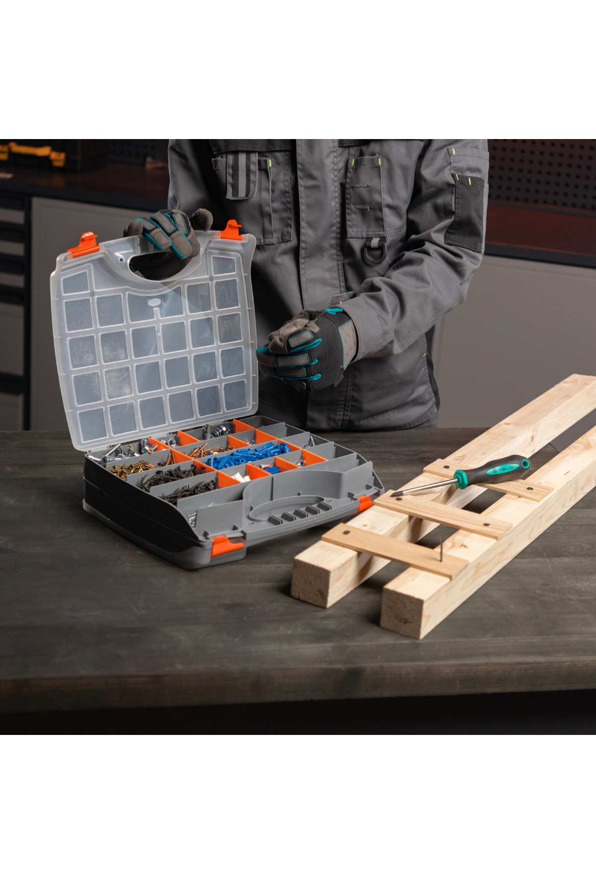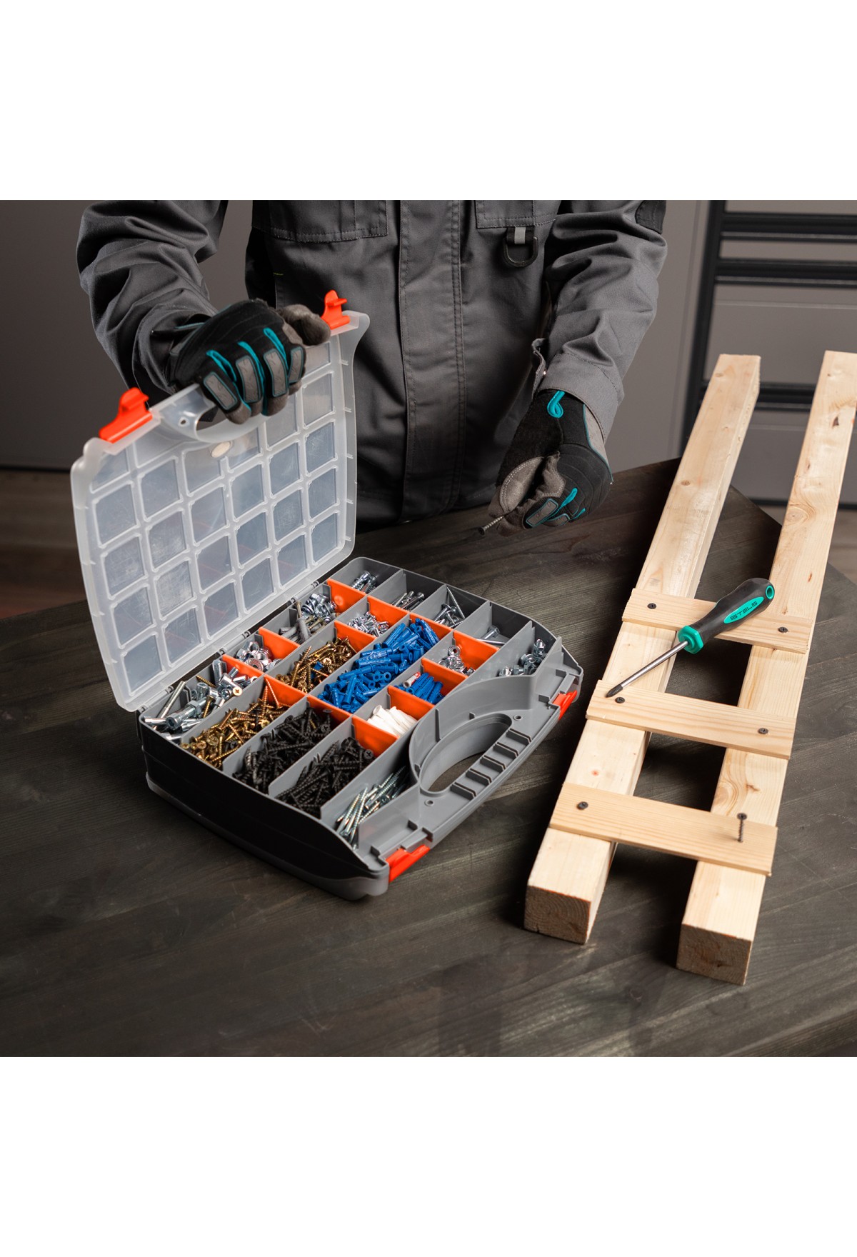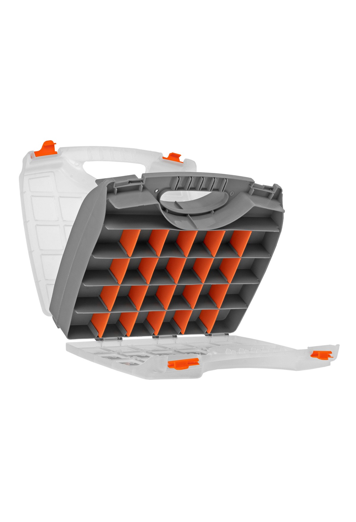 - Защелки и ручка обеспечивают удобство транспортировки органайзера.