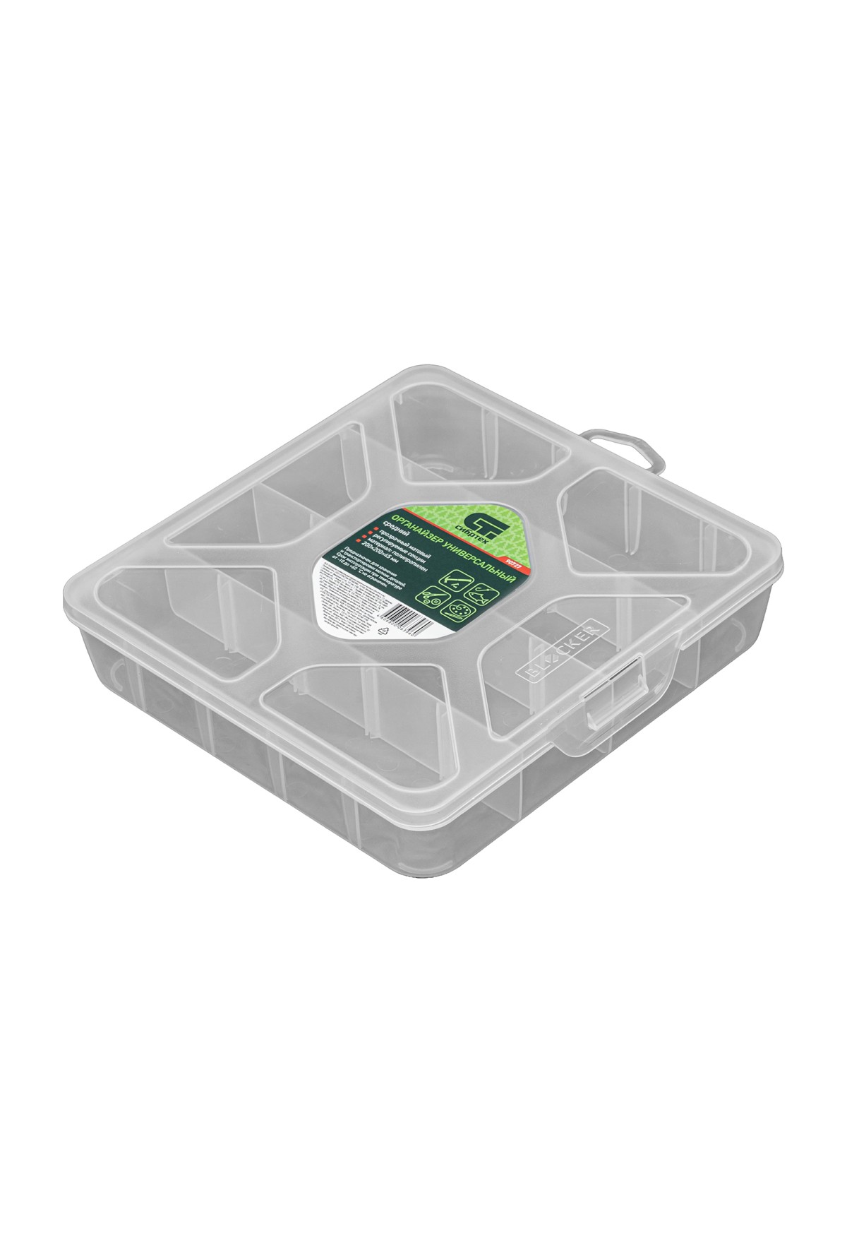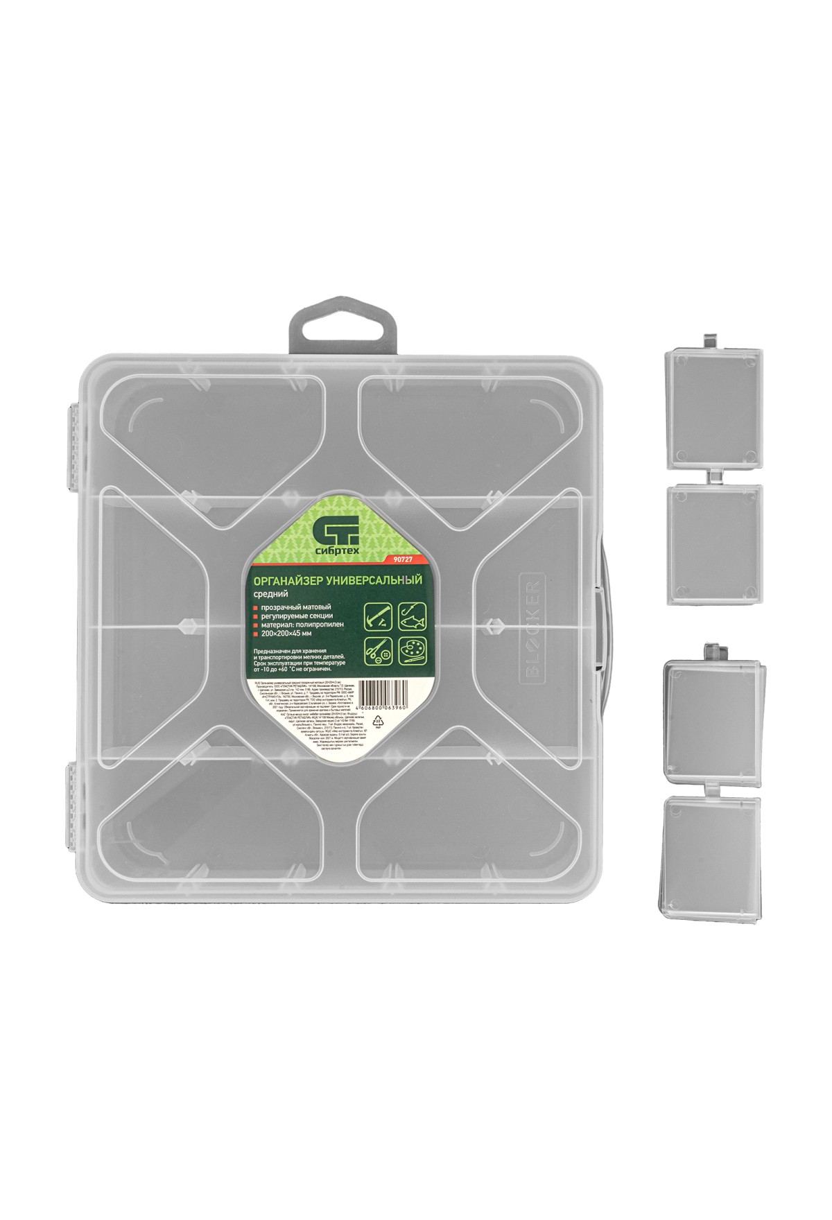 Универсальный средний органайзер Сибртех 90727 размером 200 х 200 х 45 мм, прозрачный матовый, используется для практичного хранения мелких предметов. Он подходит для распределения снастей, крепежа, хозяйственных мелочей и других предметов. Органайзер позволяет компактно расположить вещи в скрытых уголках квартиры: в шкафу, под кроватью и т.д.