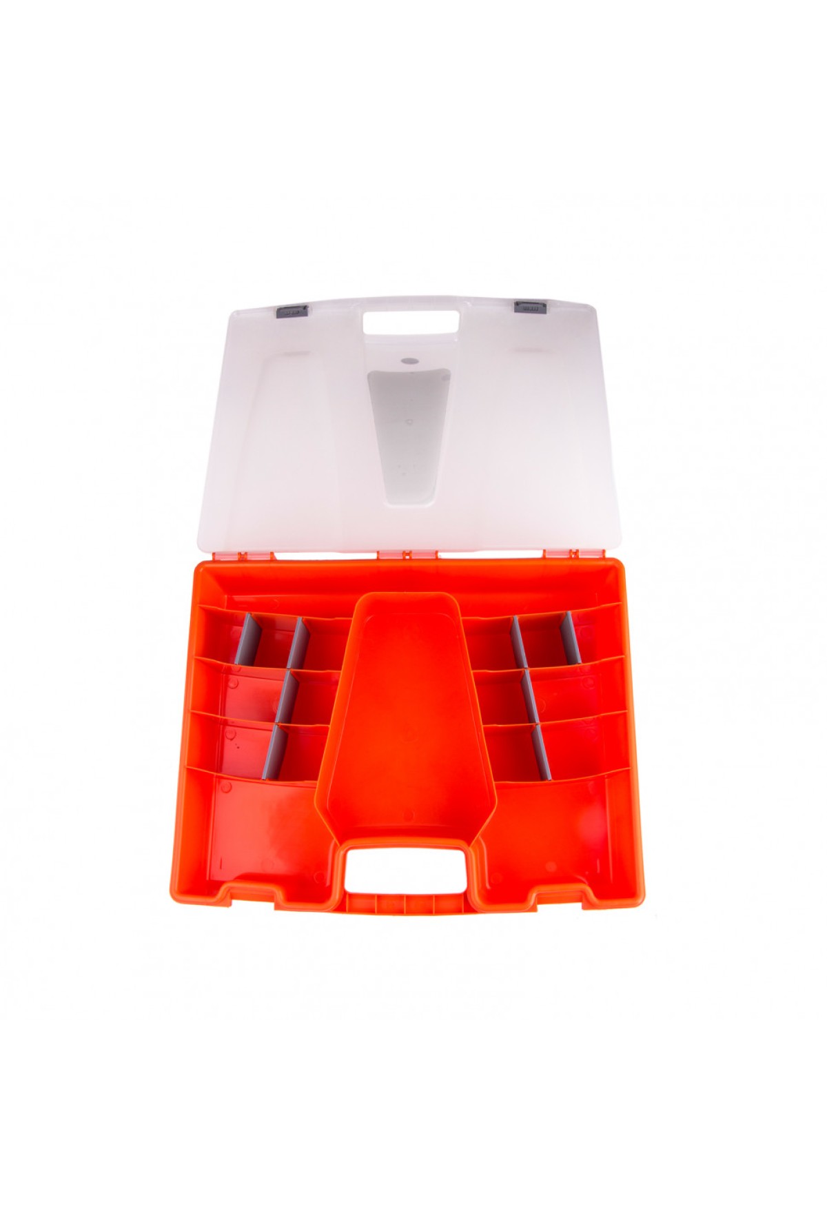 Органайзер из пластика Stels 90720 размером 460 х 360 х 80 мм позволяет обустроить практичное место хранения мелких деталей. Также его удобно брать с собой на выездные работы. Органайзер помогает поддерживать порядок в мастерской и предотвращает потерю деталей.