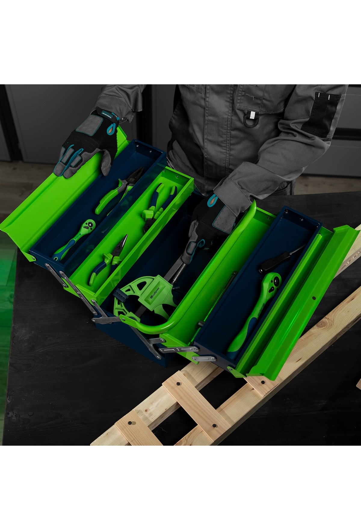 - Удобное использование — ящик легко раскладывается, ручка поворачивается и не мешает размещать или извлекать инструменты.