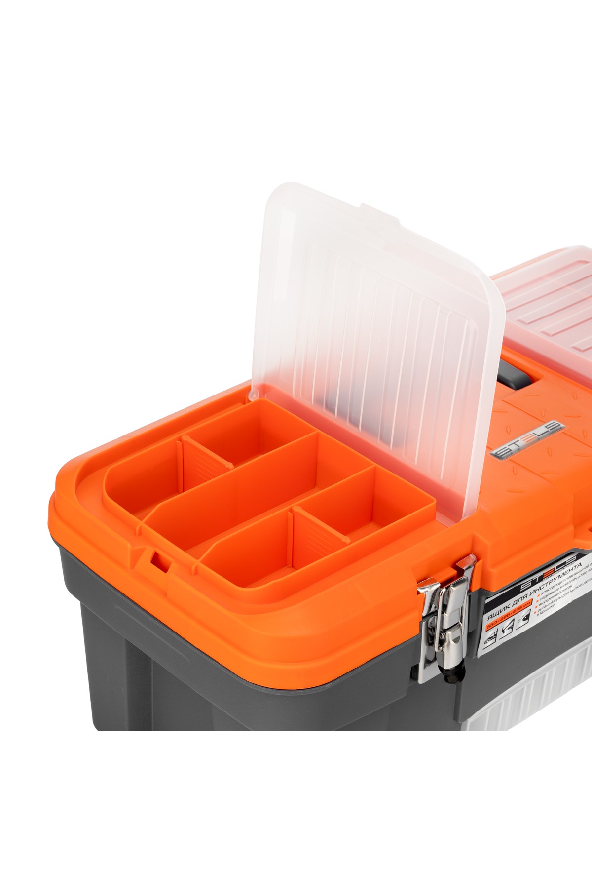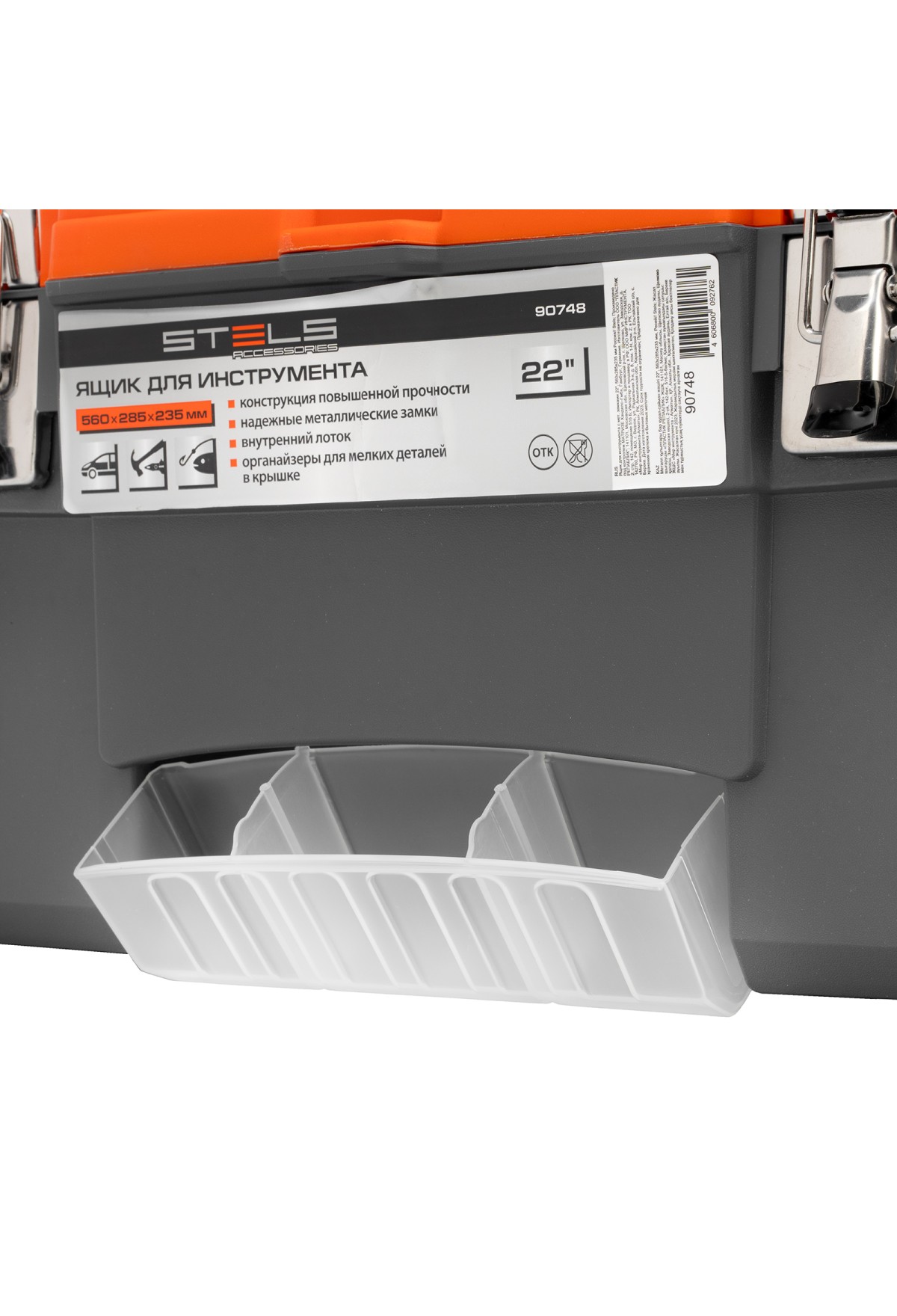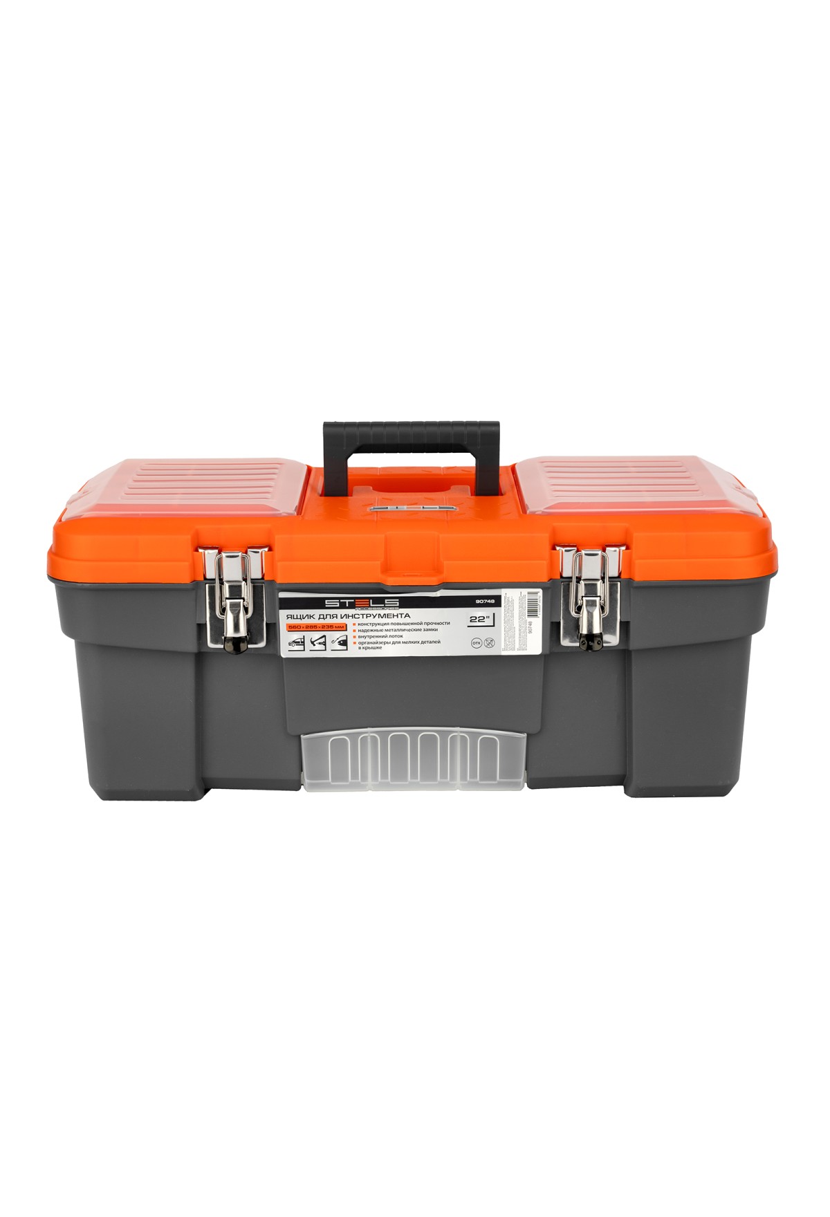 Ящик для инструмента Stels 90748 размером 22" (560 х 285 х 235 мм), с металлическими замками, — альтернатива коробке для инструментов. В нем можно расположить ручной инструмент, крепеж, хозяйственные мелочи, а также рыболовные снасти. В крышке имеются встроенные органайзеры, внутри ящика — выкидной лоток с отсеками для мелких деталей, что увеличивает функциональность изделия. Ящик удобно брать в поездки, также он пригодится дома, на даче или в гараже.