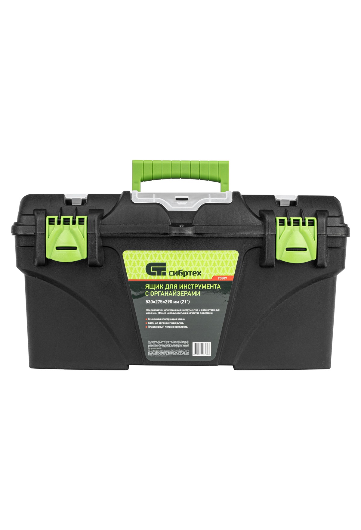 Ящик Сибртех 90809 длиной 21", с органайзерами, используется для хранения и транспортировки инструментов, оснастки, крепежа, хозяйственных мелочей и других предметов. Крышка и замок усилены трехрядными петлями, поэтому ящик выдерживает вес содержимого до 50 кг. Съемный лоток позволяет оптимизировать пространство внутри ящика. Его можно брать в поездку, также он пригодится дома, на даче или в гараже.
