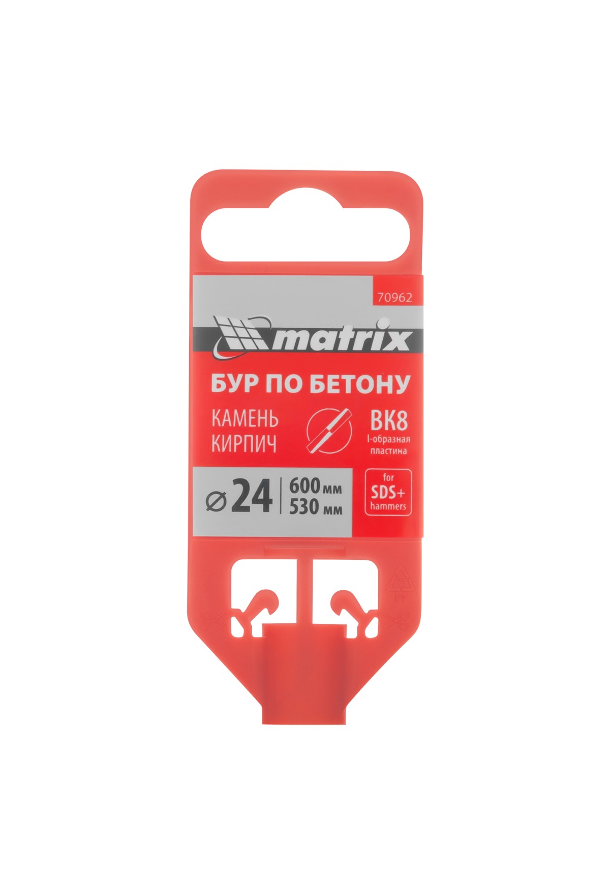 Бур по бетону Matrix 70962 длиной 600 мм, с хвостовиком SDS-plus, предназначен для установки на перфоратор и получения отверстий диаметром 24 мм в бетоне, камне и кирпиче. Позволяет эффективно решать поставленные задачи благодаря режущей пластине из высокотвердого сплава карбида вольфрама ВК8 твердостью 80-90 HRC.
