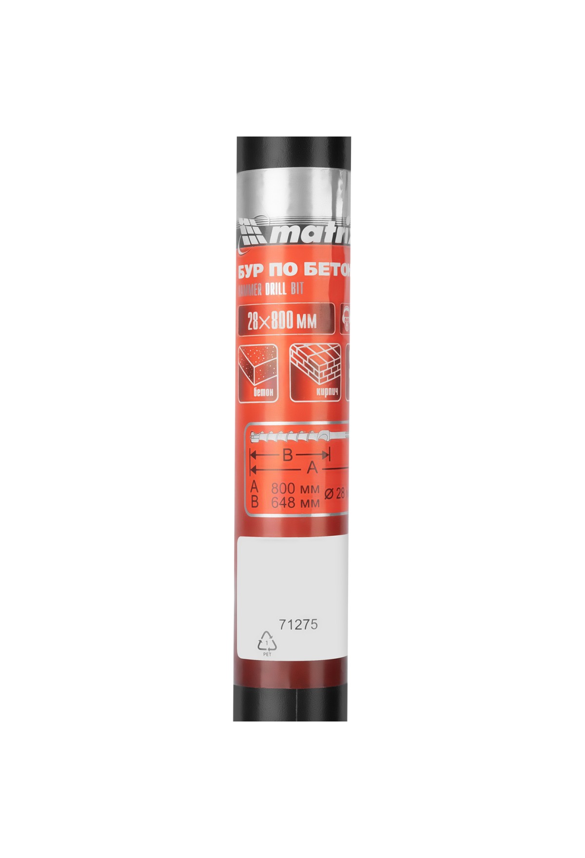Бур по бетону Matrix 71275 размером 28 х 800 мм используется в качестве оснастки на тяжелых перфораторах с хвостовиком SDS MAX. Подходит для сверления глубоких отверстий в кирпиче и особо прочных материалах: армированном бетоне, природном и искусственном камне.