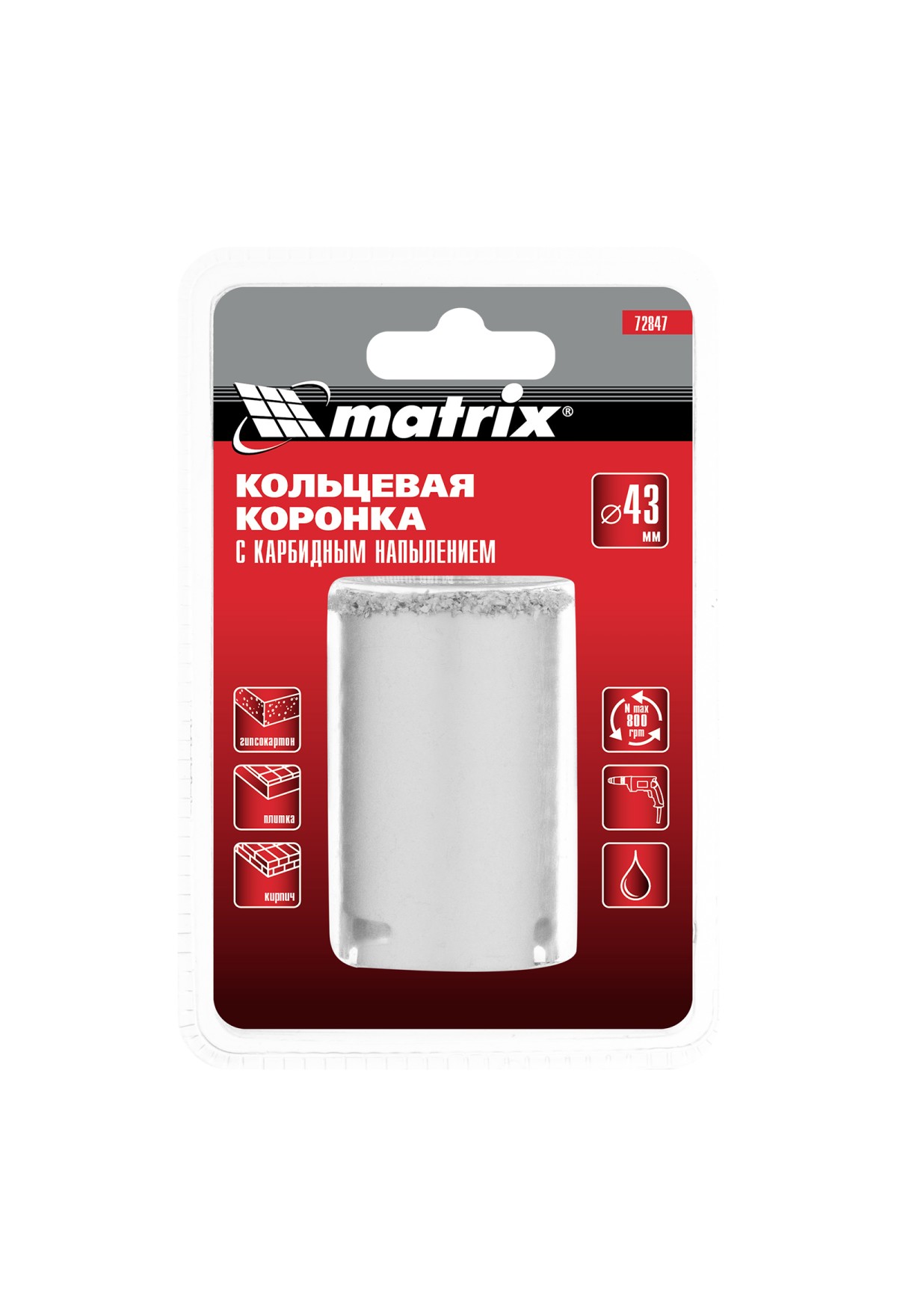 Кольцевая коронка с карбидным напылением Matrix 72847 диаметром 43 мм — сменный режущий элемент для дрелей и перфораторов. Предназначена для сверления отверстий в керамической плитке, ячеистом бетоне, пенобетоне, газосиликате, кирпиче. Пригодится для монтажа проводки в доме. Используется совместно с державкой Matrix 72860 и центрирующим сверлом Matrix 72862 (не входят в комплект поставки).