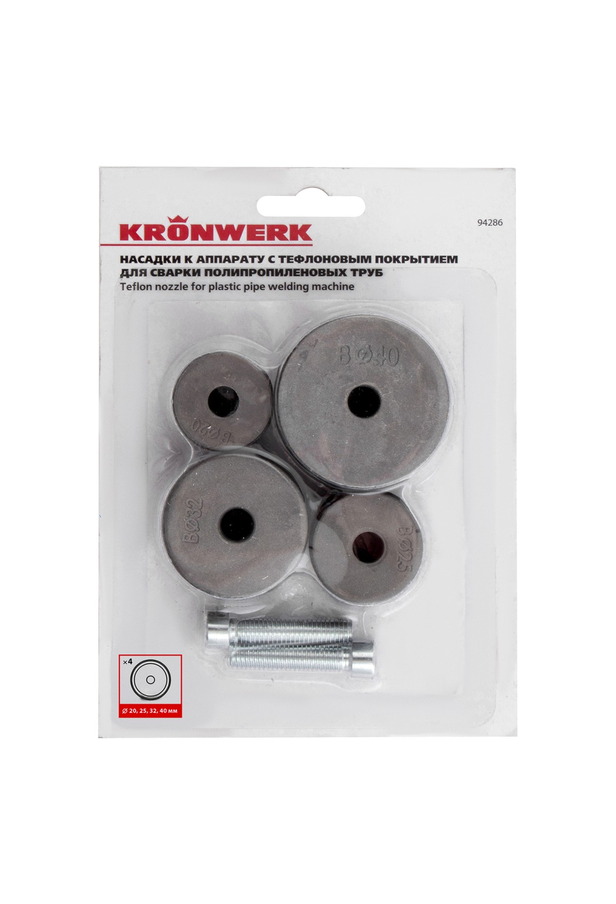 Насадки с тефлоновым покрытием Kronwerk 94286 диаметром 20, 25, 32 и 40 мм подходят к любому аппарату для сварки полипропиленовых труб. Каждая насадка состоит из 2 частей: одна для трубы и одна для фитинга. Набор пригодится для монтажа и ремонта систем водопровода.