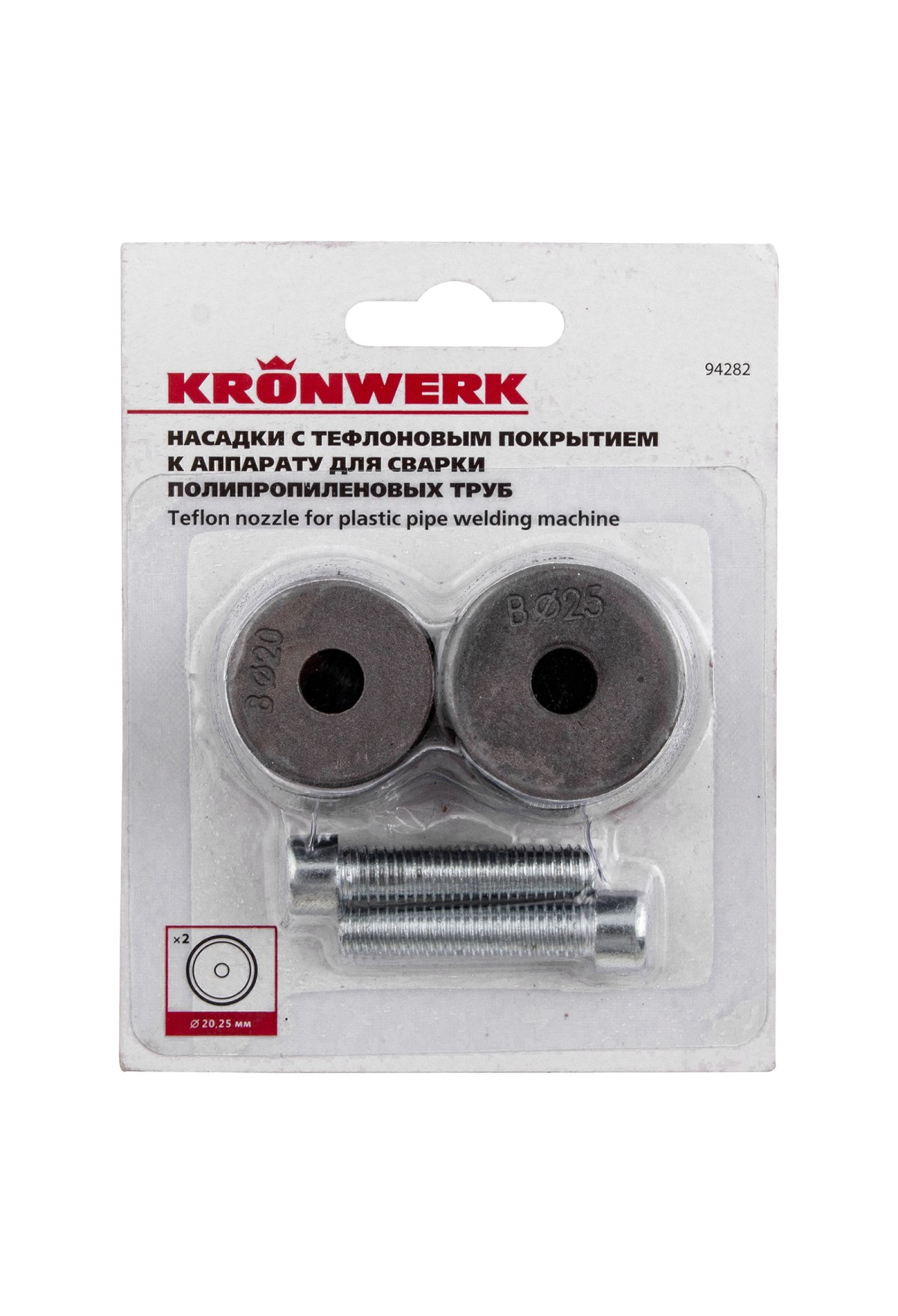 Насадки с тефлоновым покрытием Kronwerk 94282 диаметром 20 и 25 мм подходят к любому аппарату для сварки полипропиленовых труб. Каждая насадка состоит из 2 частей: одна для трубы и одна для фитинга. Набор пригодится для монтажа и ремонта систем водопровода.