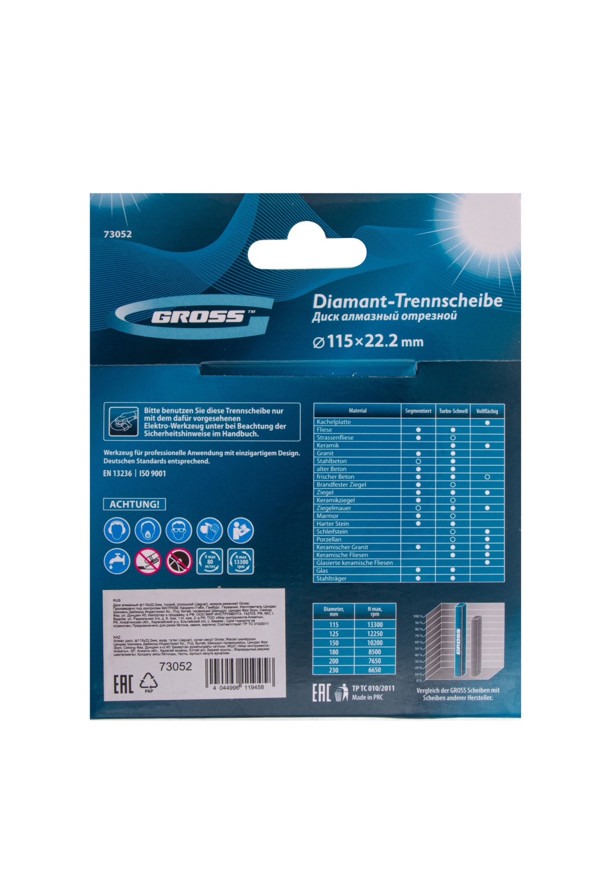 • Надежность — диск изготовлен методом горячего прессования, тщательно подобранная металлическая связка содержит кобальт, серебро и другие компоненты, обеспечивающие устойчивость к перегреву и высоким нагрузкам.