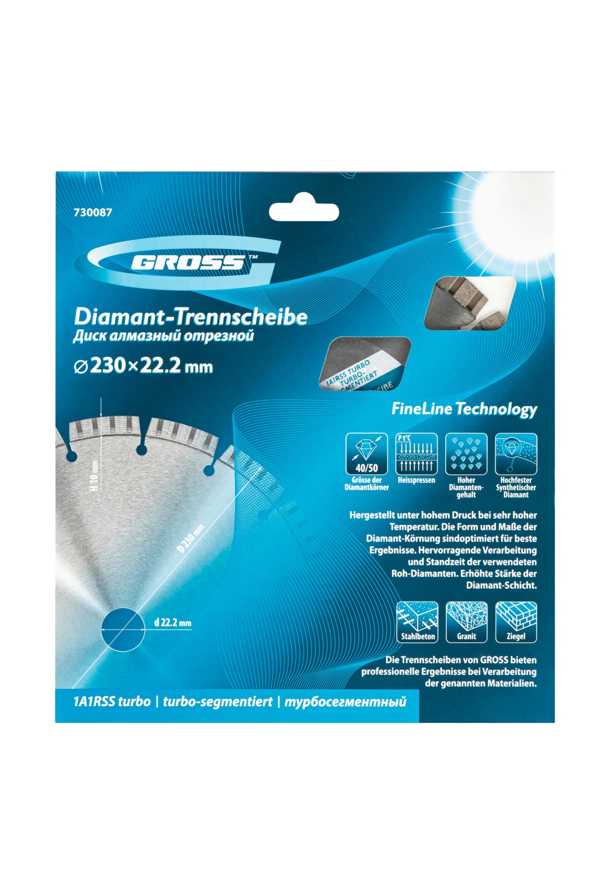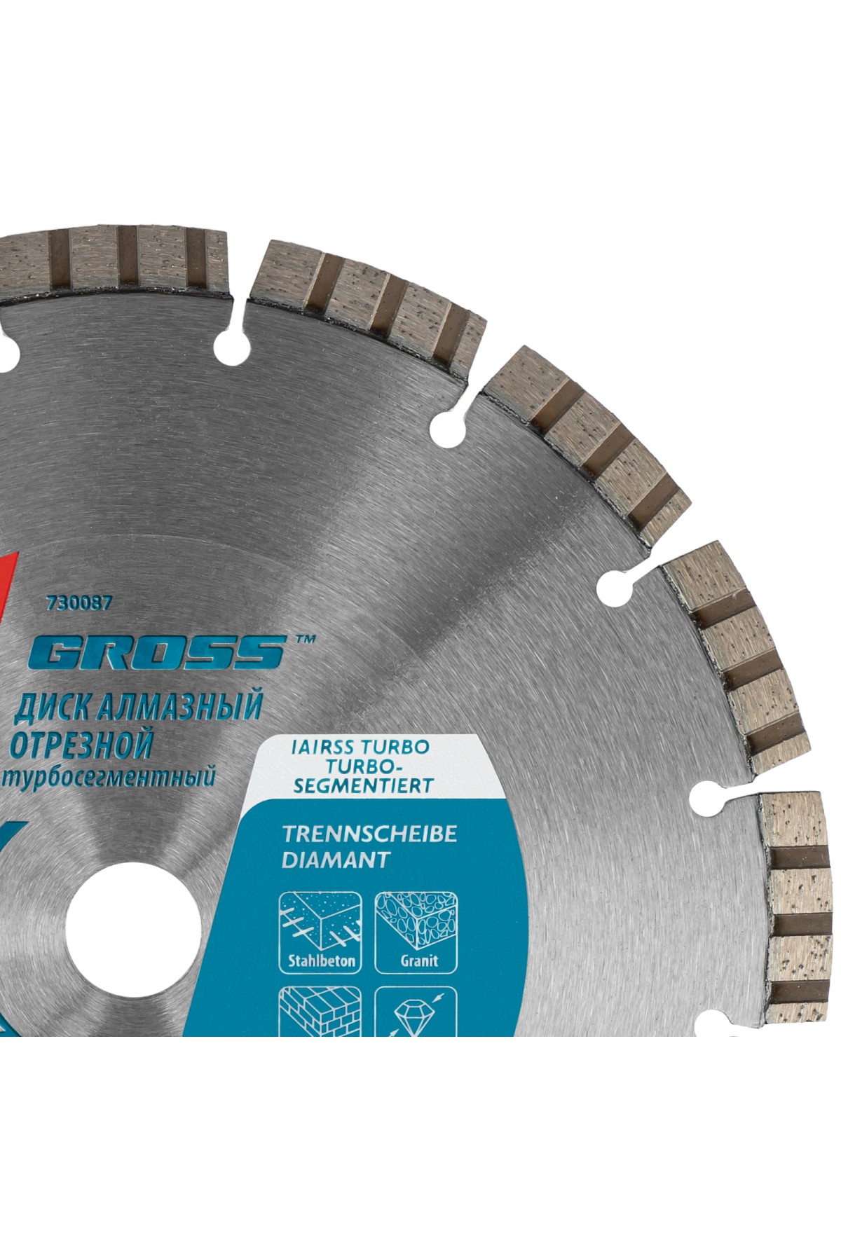 Алмазный диск Gross 730087 диаметром 230 х 22,2 мм с лазерной приваркой турбо-сегментов предназначен для сухого резания бетона, в том числе свежего, слабоармированного железобетона, кирпича, песчаника и гранита. Посадочный диаметр 22,2 мм позволяет использовать диск в качестве оснастки для УШМ. Турбо-сегментное строение обеспечивает быстрое сухое резание без необходимости водяного охлаждения. Благодаря оптимально подобранной связке диск выдерживает высокие нагрузки при выполнении большого объема работ. Подходит как для интенсивного бытового, так и для профессионального применения.