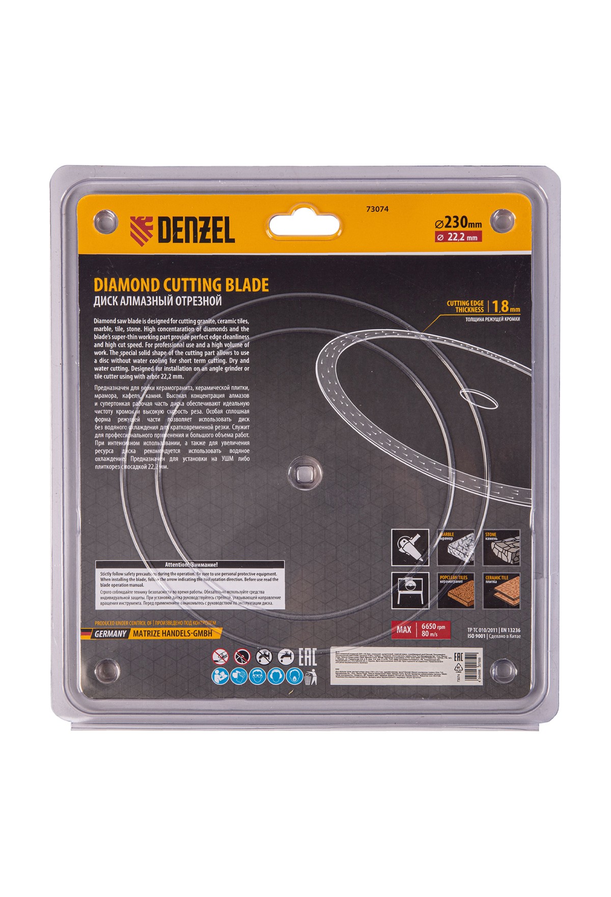 Алмазный диск ТМ Denzel "Сплошной"арт 73074, ф230 х 22,2 мм, предназначен для резания мрамора, керамогранита и керамическую плитки, камня. Устанавливается на УШМ (болгарку) или плиткорез с посадочным диаметром 22,2 мм. Высокая концентрация алмазов и супертонкая рабочая часть диска обеспечивает идеальную частоту кромок и высокую скорость реза.Особая сплошная форма режущей части позволяет использовать диск без водяного охлаждения для кратковременного реза.Диск произведен по технологии горячего прессования с увеличенной шириной режущей кромки (10мм) подходит для профессионального использования и больших объемов работ. При интенсивной резке необходимо использовать водяное охлаждение.